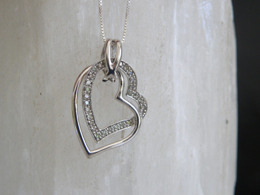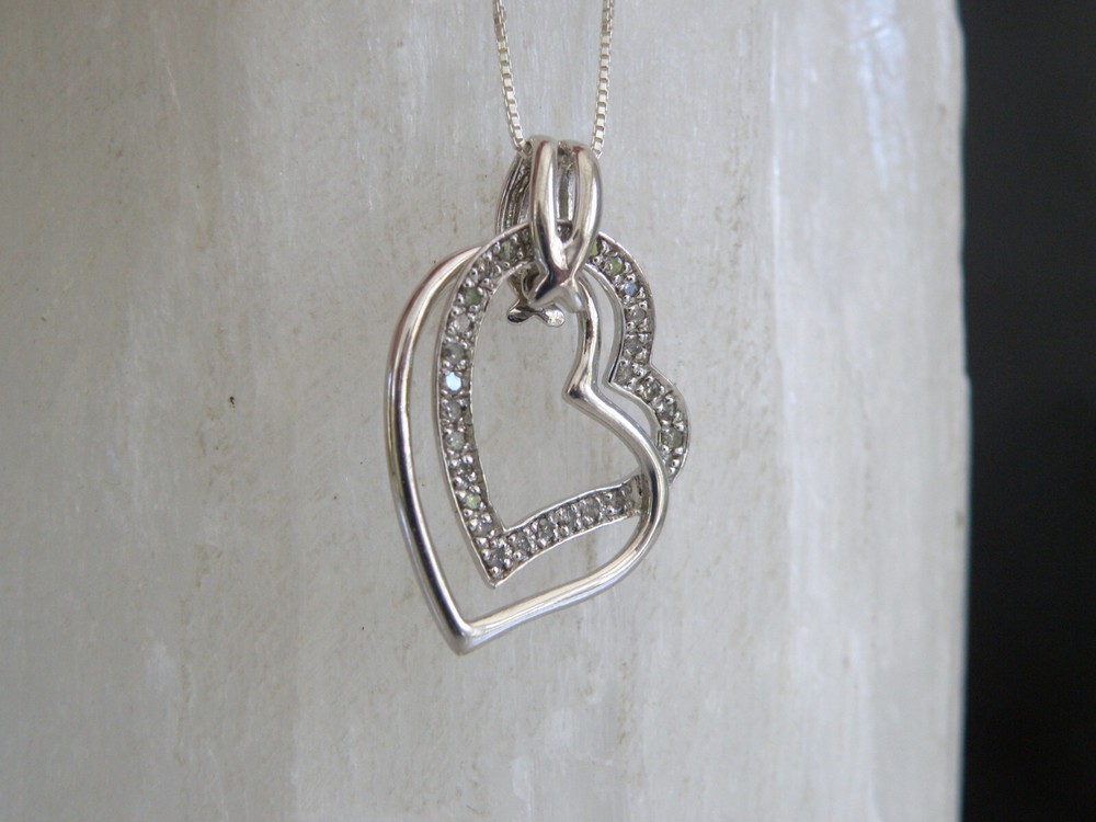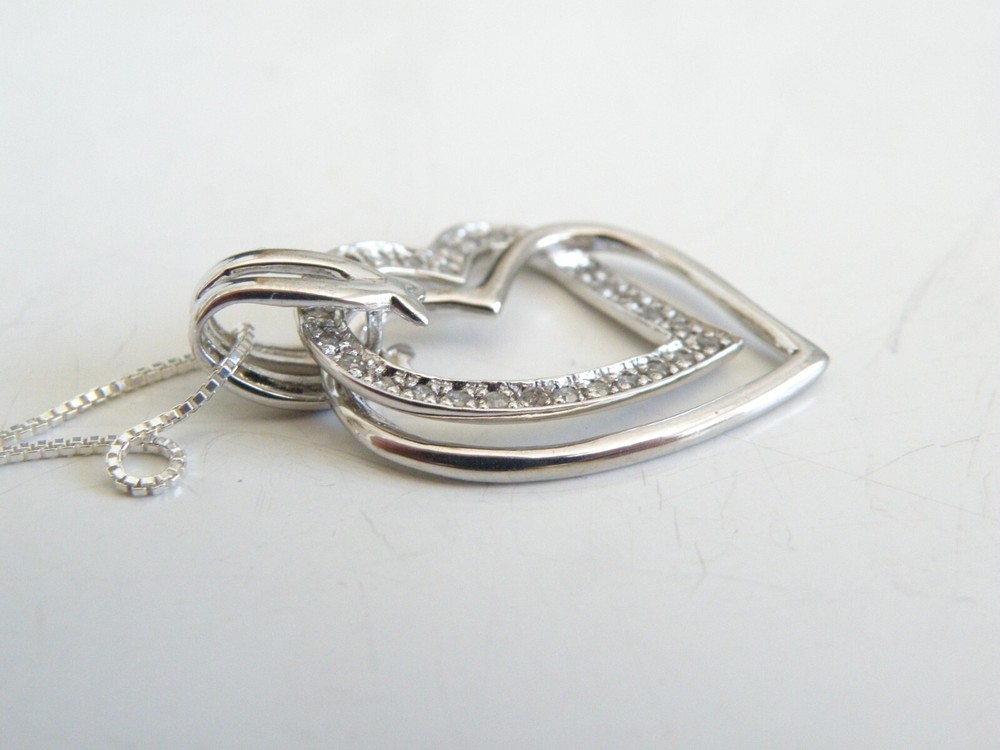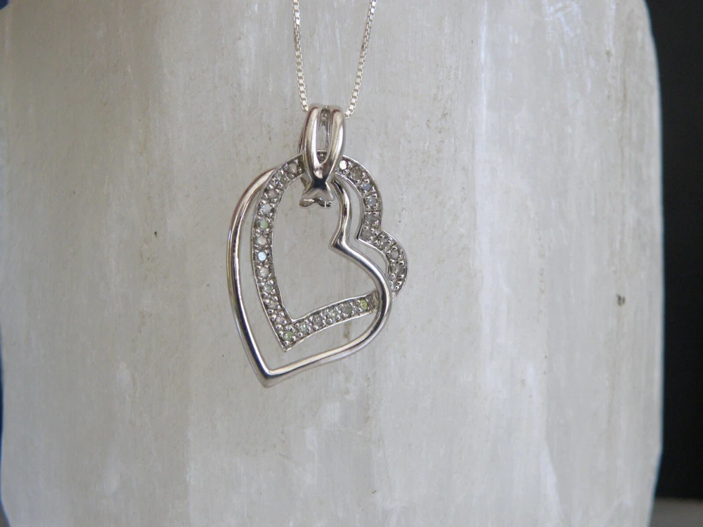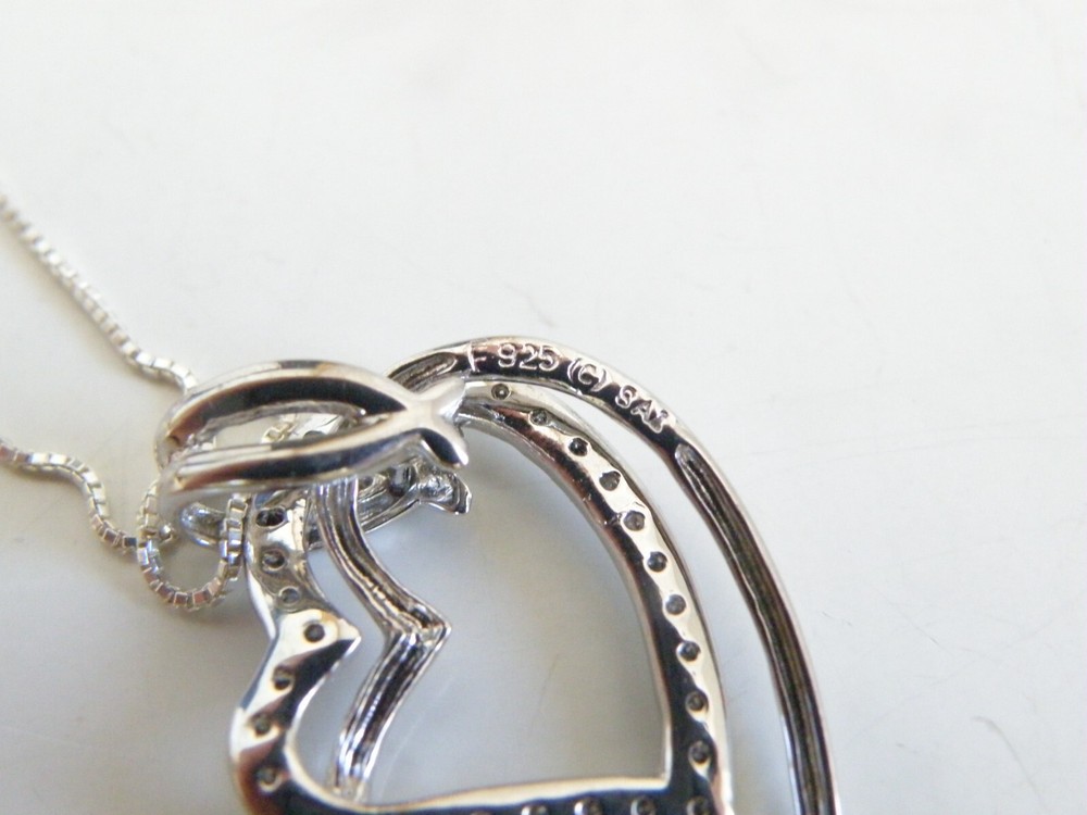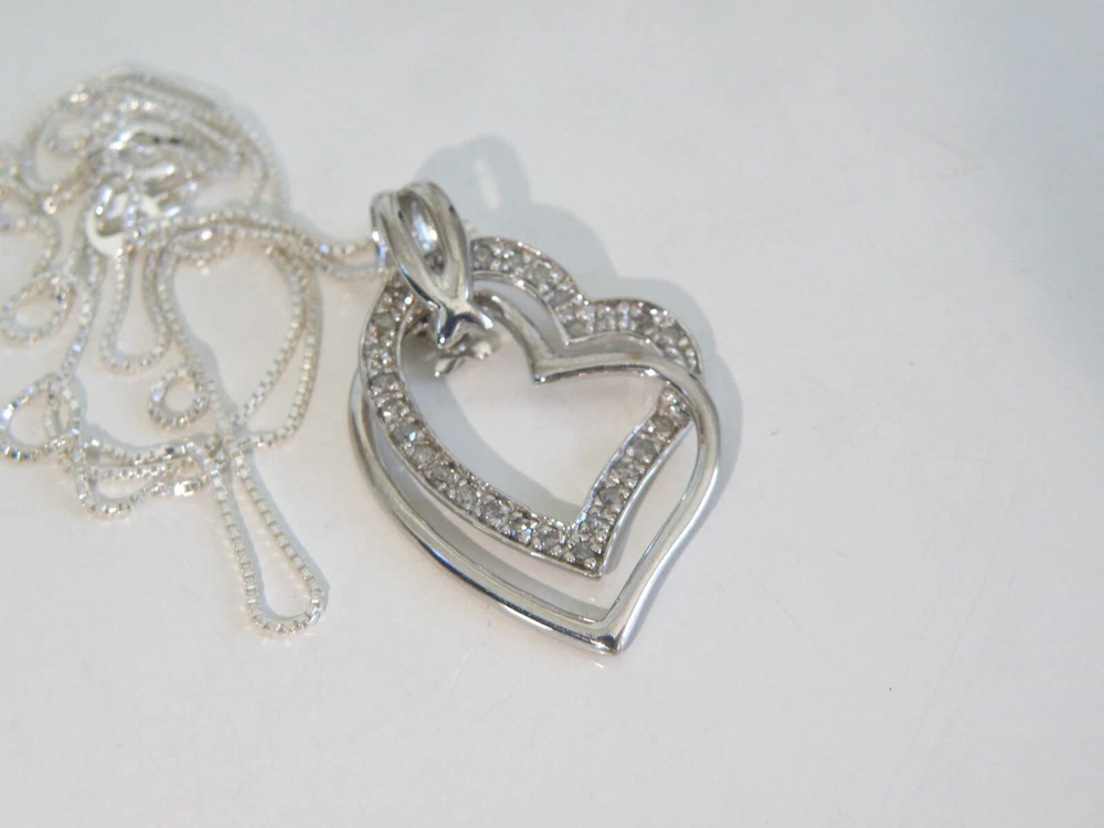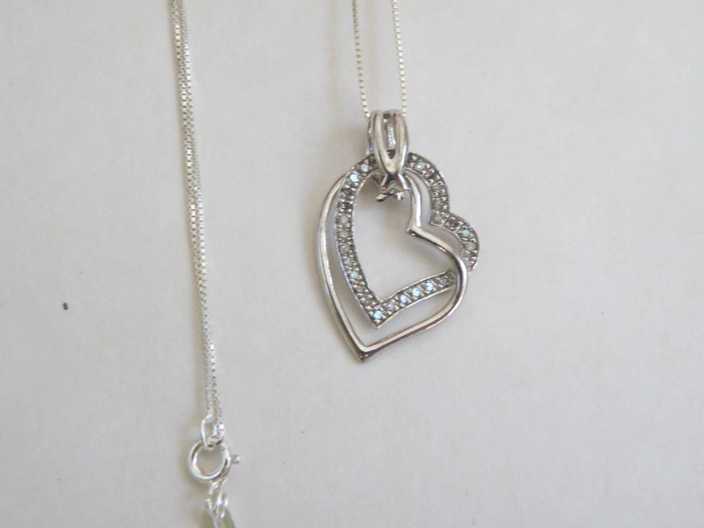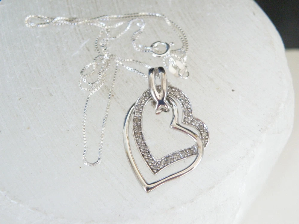 Unlock your style potential with this charming double heart diamond sterling silver pendant necklace. Measures approx. 18" long. Heart is approx.1.20" with the attached bail x .75" Weight 3.2 grams Marked 925 for sterling silver is marked on both pieces. The pendant is also marked SAI - necklace is marked Italy 925