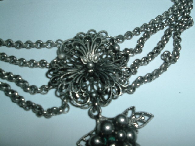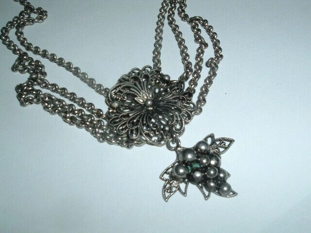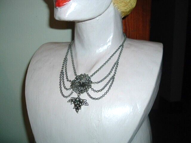 From a Chicago estate sale, an arts and crafts festoon necklace of sterling silver with an ornate beaded sterling flower and a cluster of sterling grapes, circa 1910. Measures 16" long and has hook clasp. Beautiful on and condition is excellent. Seller will pay postage and postal insurance. We will ship in jeweler's gift box, perfect gift for MOTHERS DAY which is coming soon.