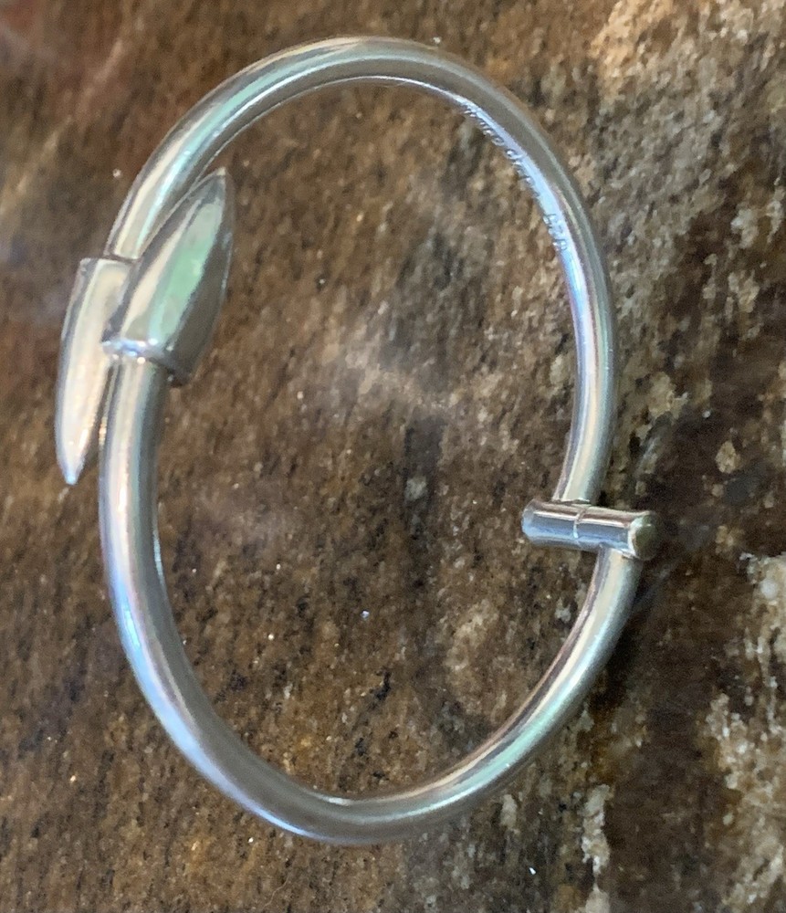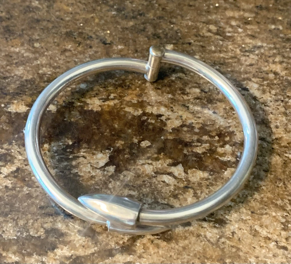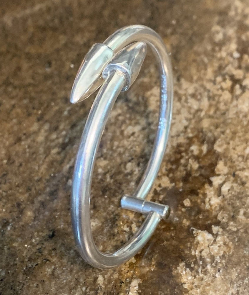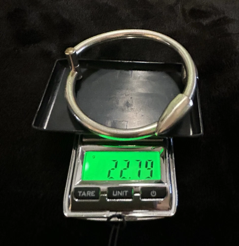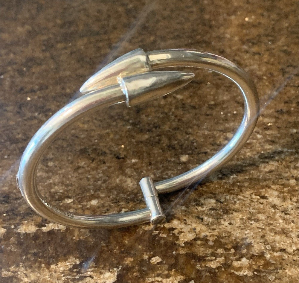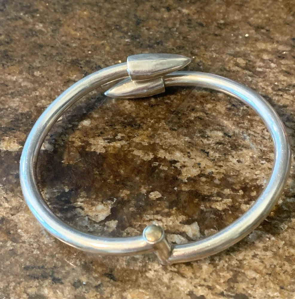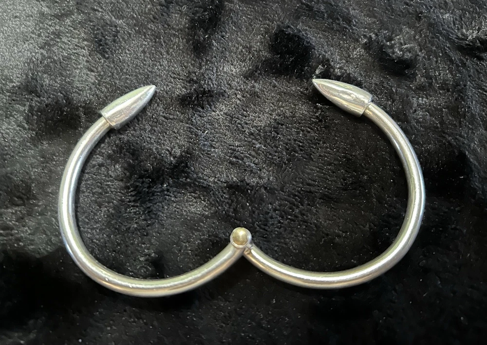 This Vintage Sterling Silver Hinged Bangle Bracelet with Spear Points is a unique and edgy piece of jewelry that exudes a biker or Gothic vibe. Made of sterling silver with a metal purity of 925, this bracelet features a round shape and is 6.5 inches in length. It is adjustable and stackable, making it versatile for both men and women. The hinged design adds convenience for easy wearing. Crafted in Mexico during the 1980s, this original piece is a stylish addition to any jewelry collection.