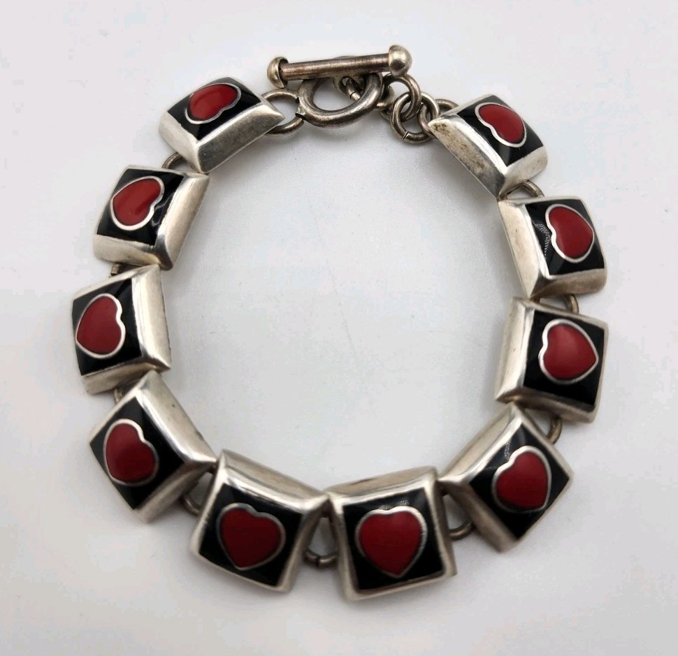 This Gorgeous Vintage Sterling Silver Sweet Heart Bracelet features a classic tennis-style design with beautiful red heart-shaped stones set in 925 silver. The bracelet's intricate heart shape adds a touch of elegance, making it a perfect accessory for any outfit. The vintage charm exudes timeless beauty, making it a timeless piece that can be worn for years to come. Heavy well-made bracelet, weighs 37.40 grams, 1/2 inches wide, and is 7 inches long. The back of the bracelet needs to be polished.