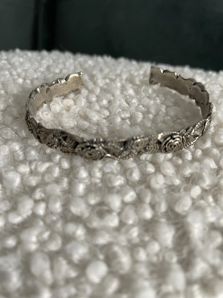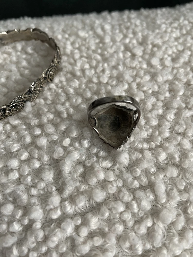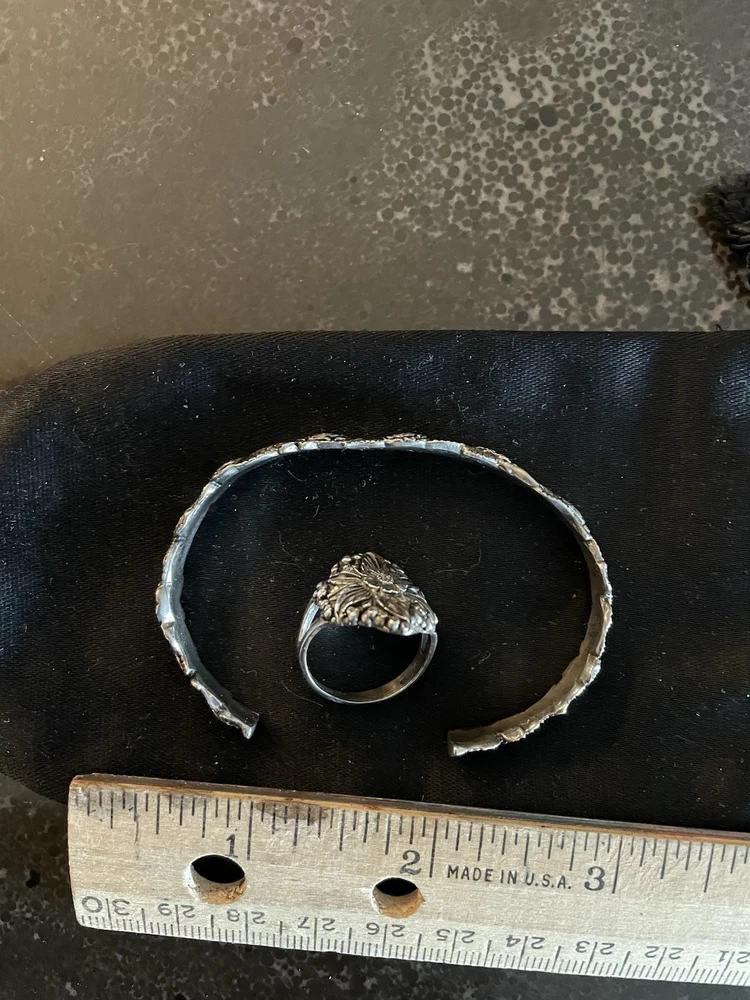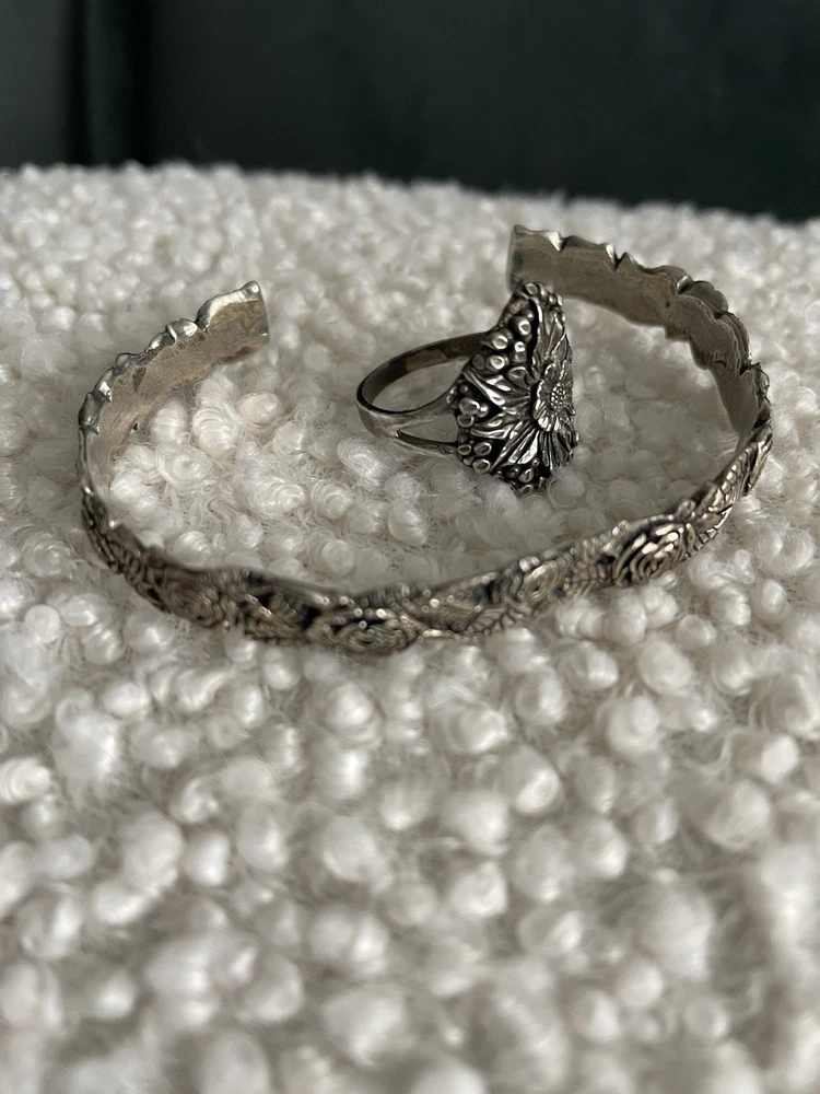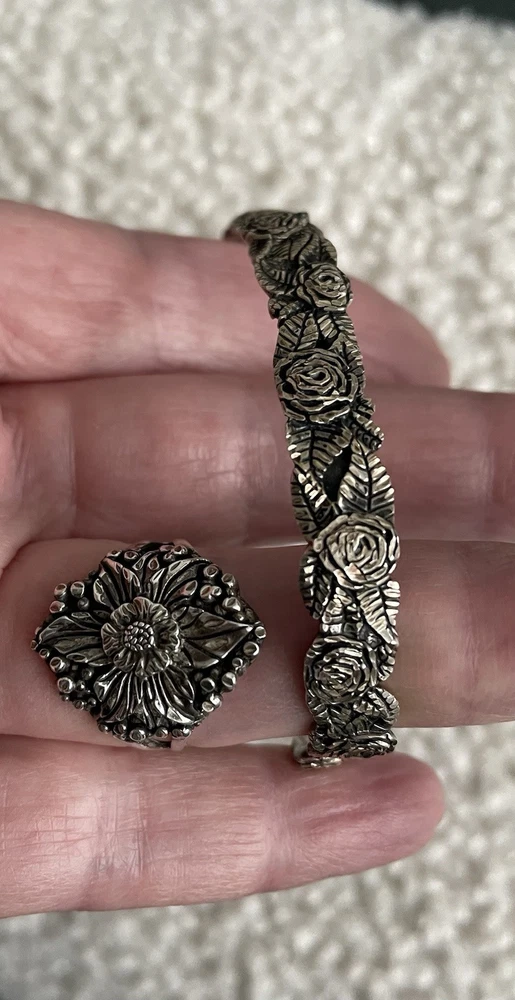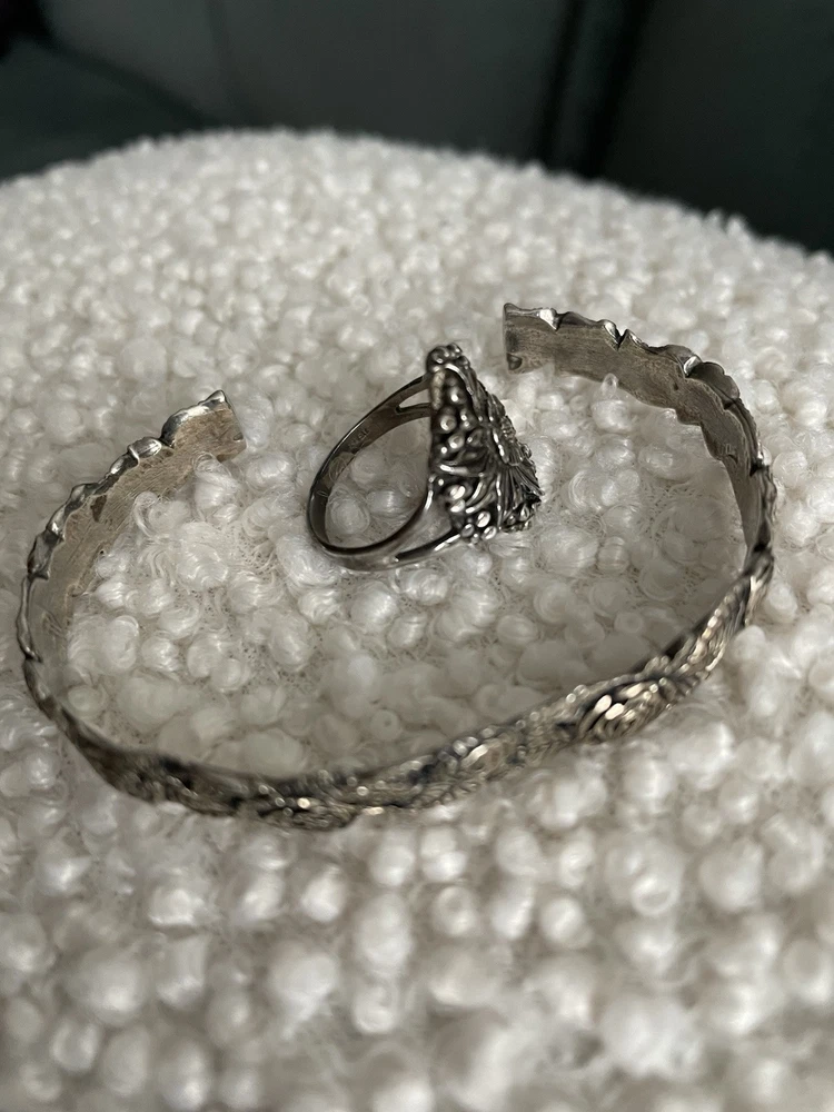 This vintage set includes a sterling silver and cuff bracelet and ring featuring marcasite rose cut design. Both pieces are handmade and stamped sterling STER with a C inside the bracelet. The bracelet is a slide-on with an 1.5” opening. Approximately 7.5 inch if flat. The matching ring is about a size 7-7.5. They have a Victorian vibe. Dainty and beautiful. Excellent vintage condition purchased in the 90’s.