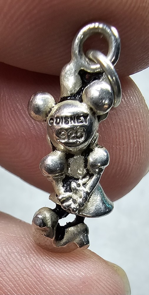 Add a timeless classic to your jewelry or Disney collection with this vintage Minnie Mouse charm, crafted from solid 925 sterling silver. Fully detailed in 3D, Minnie is shown with her signature bow, holding a flower and wearing her classic skirt — a design that’s both nostalgic and charming. Stamped © Disney 925, this piece is perfect for collectors of vintage Disney jewelry, charm bracelets, or themed pendant sets. --- Details: Character: Minnie Mouse Material: Sterling Silver (marked 925) Weight: 3.1 grams Design: Full 3D sculpt, solid vintage charm Marks: © Disney 925 Condition: Excellent vintage condition with light patina