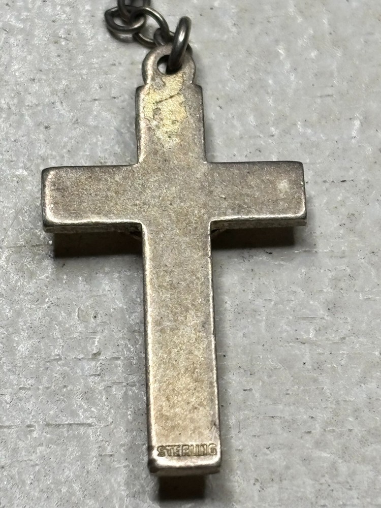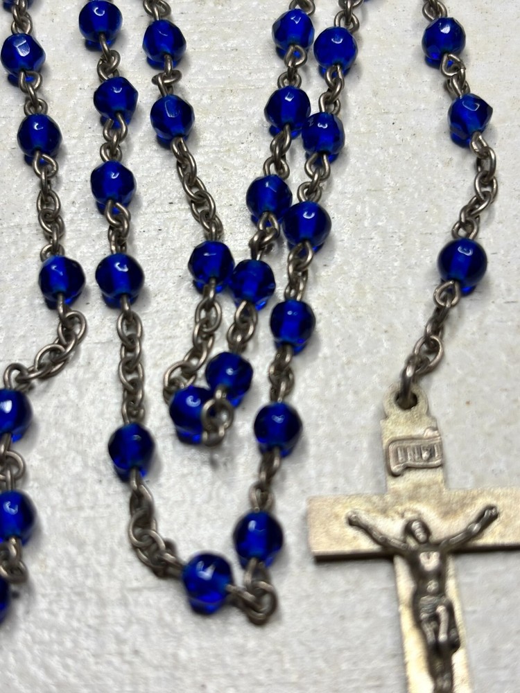 Vintage sterling silver rosary with cobalt blue glass 1/8 inch beads. Total length is 19 inches with cross Cross is marked STERLING No damage