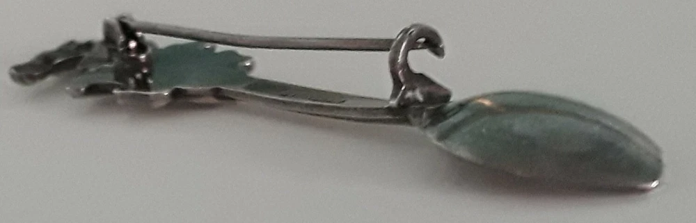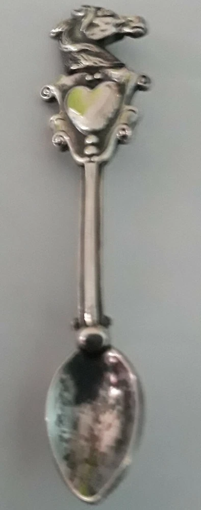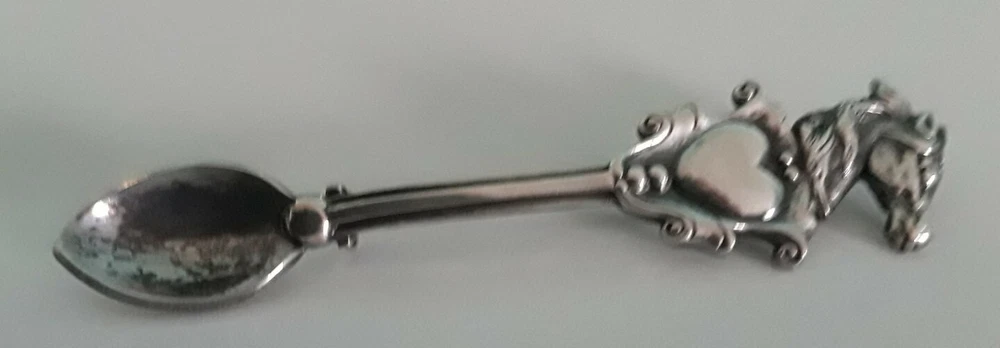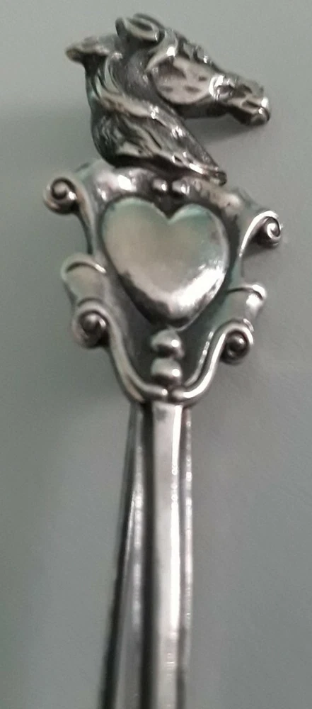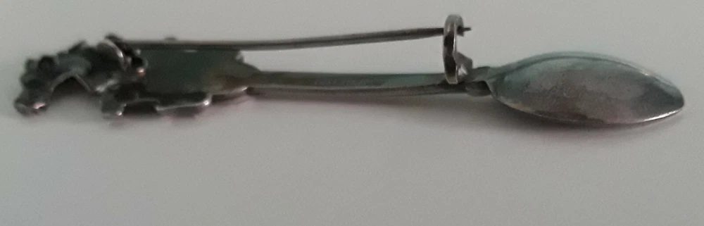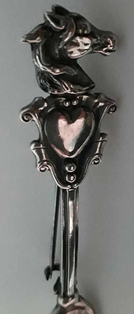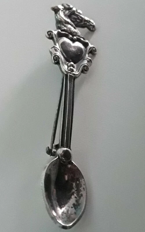 Vintage sterling silver spoon brooch. Top of spoon is a horse head & a heart. Dimensions approximate 2-1/2" long x 9/16" wide. "C" catch. This has been lightly cleaned. I will leave this up to the purchaser. Very good pre-owned vintage condition