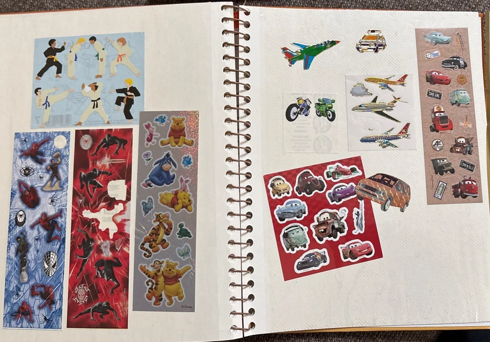 Vintage Sticker Book Album featuring designs from the 80s, 90s, and 2000s by popular brands like Sandylion, Hallmark, AGC, and Mrs Grossmans. This multi-color sticker book is perfect for adding a touch of nostalgia to your scrapbooking projects. Dive into a world of history-themed stickers with this charming collection, ideal for any craft enthusiast. Perfect for adding a retro flair to your creative projects, this sticker book is a must-have for any scrapbooking aficionado. This book has 40 pages and 38 of them contain stickers with their original backing (with the exception of the inside cover where the backing of the stickers was removed). Please see all the photos.