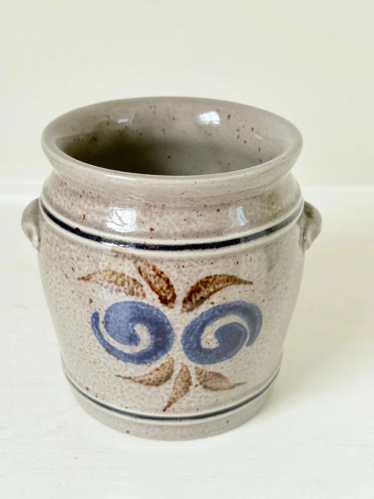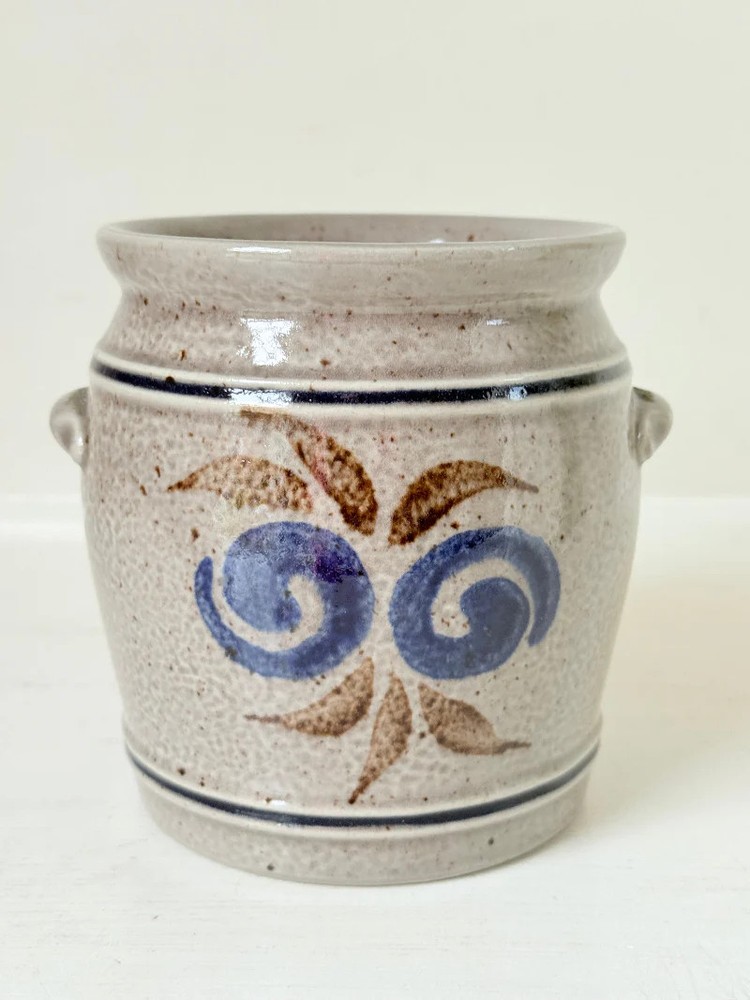 This vintage stoneware confit pot brings rustic French character and timeless style to any kitchen or interior setting. Traditionally used for preserving meats in rural households, a confit pot like this one now makes a versatile and decorative piece for modern homes. Measuring 12.5 cm in height and 12 cm across, the pot has a pleasingly solid feel and a gently tapered shape. It is decorated with hand applied blue and brown folk art motifs on a soft grey ground, a classic colour combination that adds warmth and charm. Two small side handles enhance the design and make it easy to move or display. The pot can be styled in many ways. Use it to hold cooking utensils beside the hob, as a container for dried flowers or herbs, or simply as a stand-alone decorative accent on a shelf or dresser. Its neutral yet distinctive palette blends well with natural woods, marble or contemporary kitchen finishes, making it an easy fit for both rustic and modern interiors. Condition is excellent. The glaze retains its soft sheen and there are no chips, cracks or noticeable wear. The natural variations in tone and tiny glaze flecks are part of the original hand finished process and add to its character. Whether you are a collector of French farmhouse pieces or simply wish to introduce the warmth of traditional pottery into your home, this vintage confit pot offers both history and practical beauty. Its compact size makes it easy to place, while the handmade decoration ensures it stands out as a unique addition to any room.