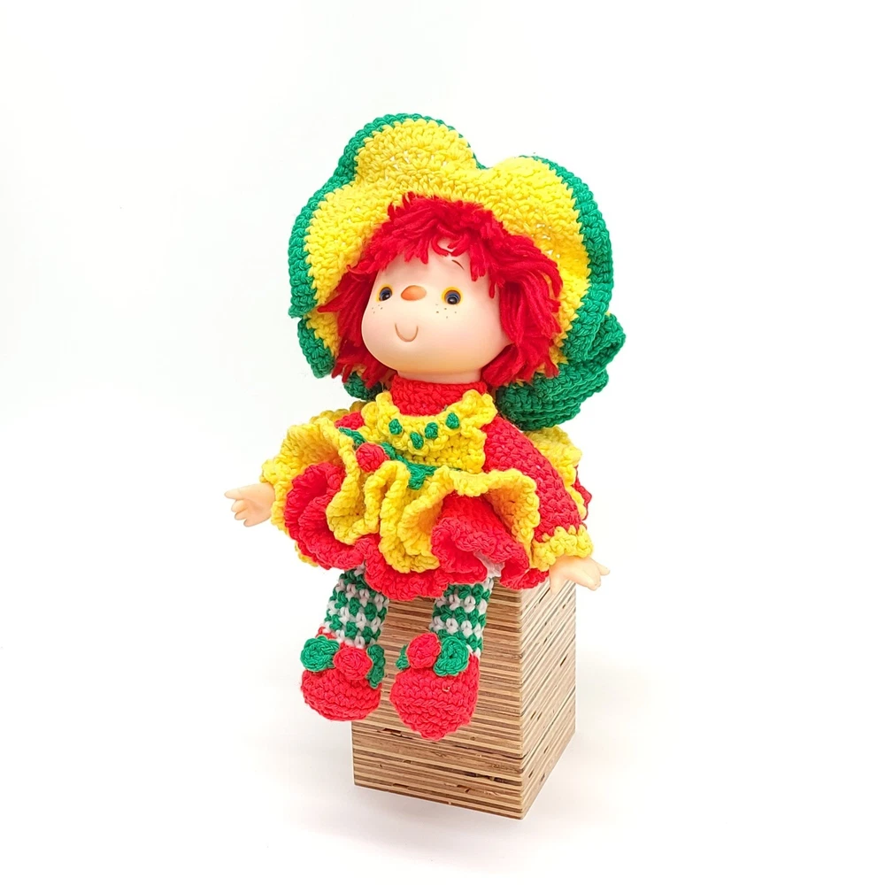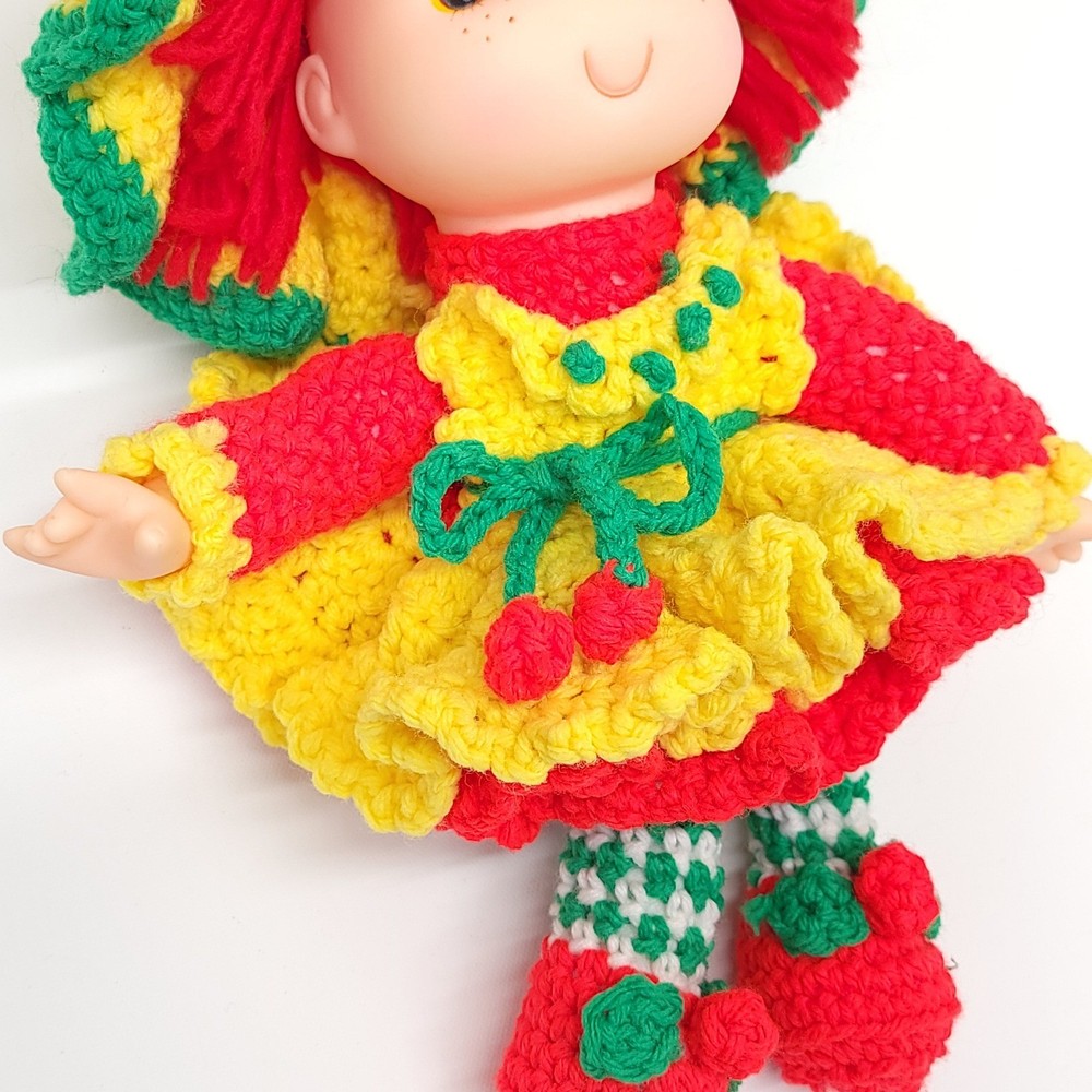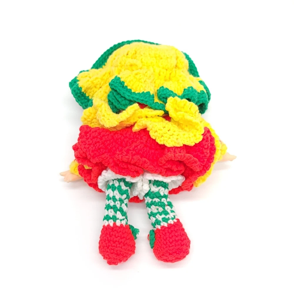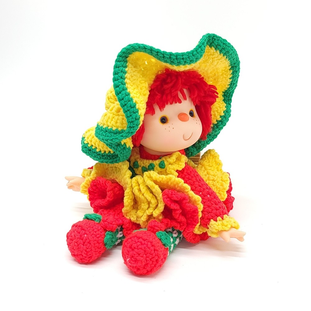 Vintage Strawberry Crochet Doll Bright and full of cheer! Features removable clothes, rotating appendages. Expert level crochet work! Doll is roughly 12" tall. Thanks for stopping in! If you have any questions please feel free to ask.