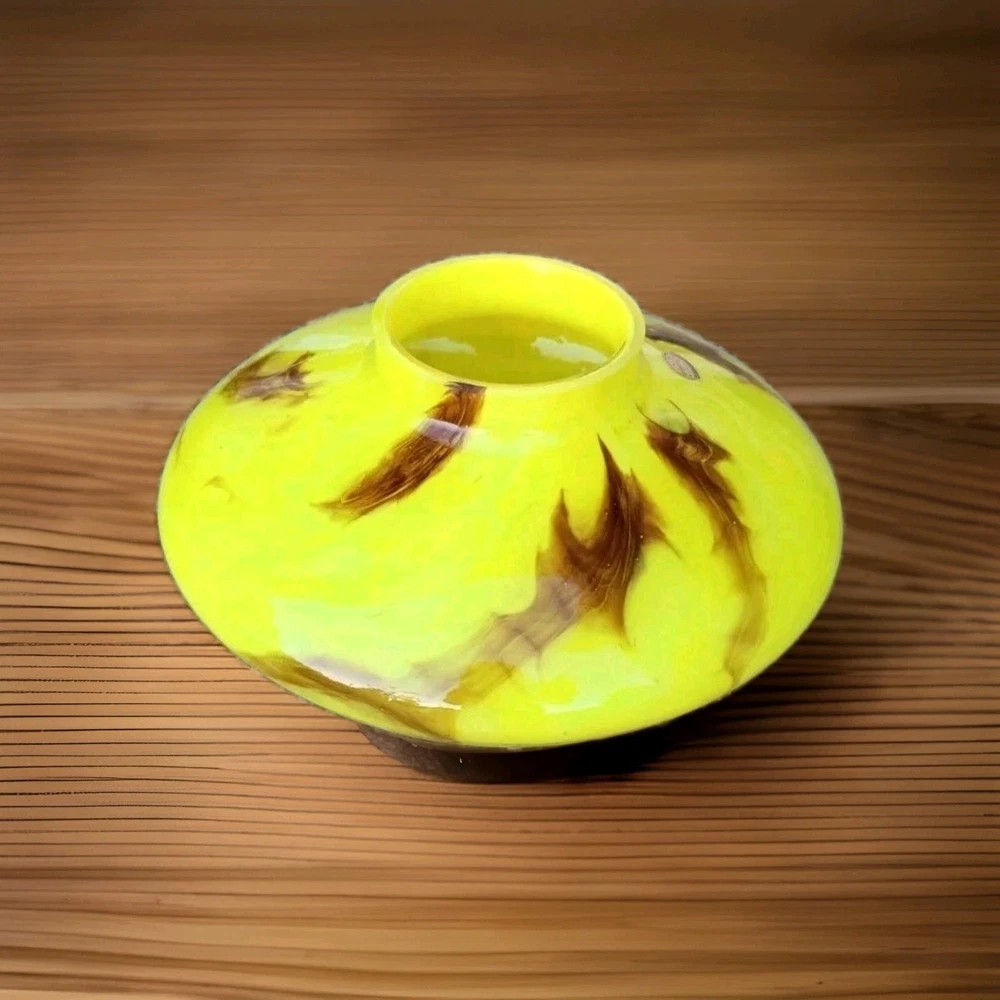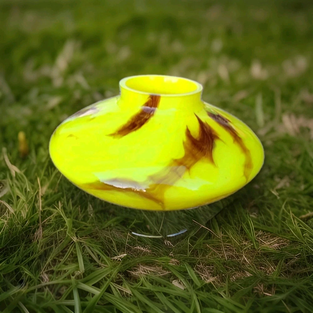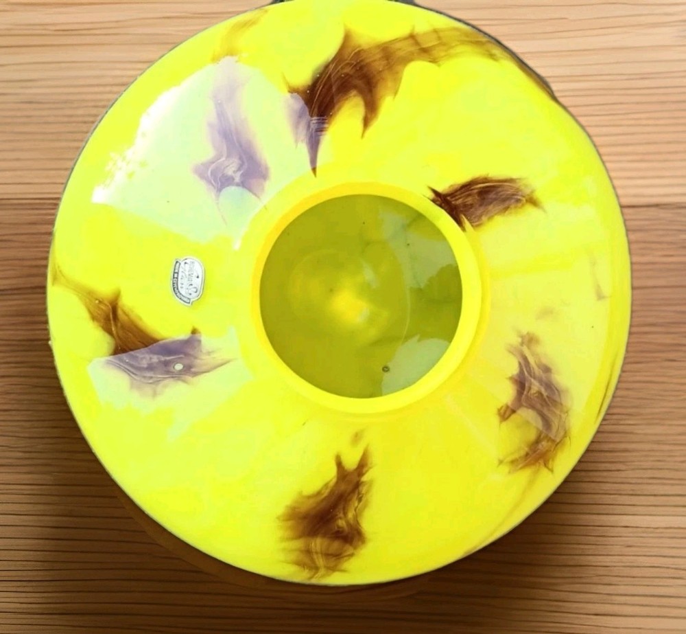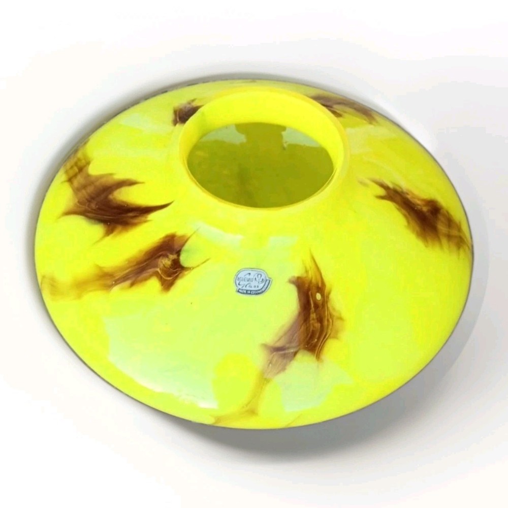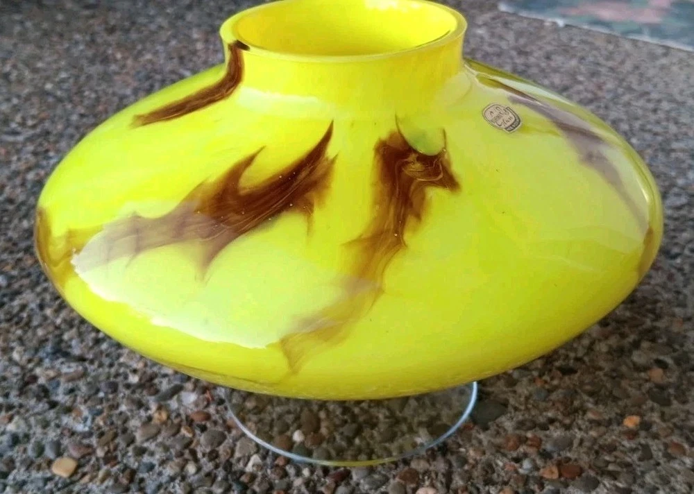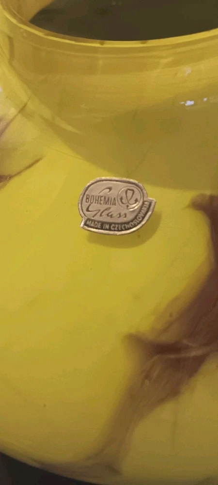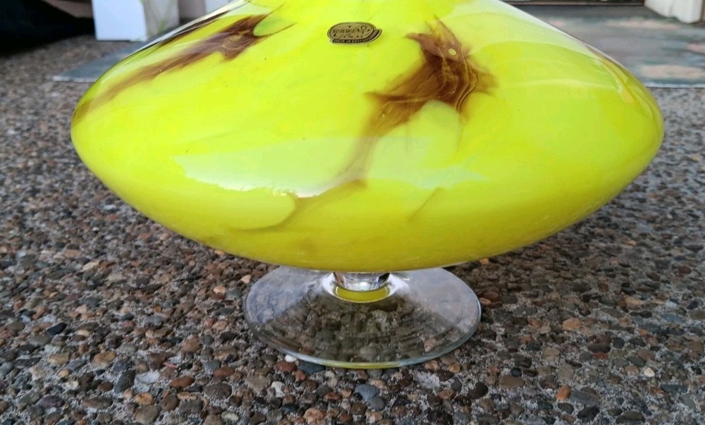 This Vintage Czech Bohemia Pedestal Vase in Chartruese Art Glass is a beautifully crafted piece from the 1960s. This hand-blown glass vase features a high gloss finish and decorative design typical of Mid-Century Modern style. Its vibrant chartruese and brown colors and glossy finish make it a standout piece of vintage decor. Made by the renowned brand Bohemia, the original identifying sticker is still attached. This stunning Czech art glass vase adds elegance and charm to any space.