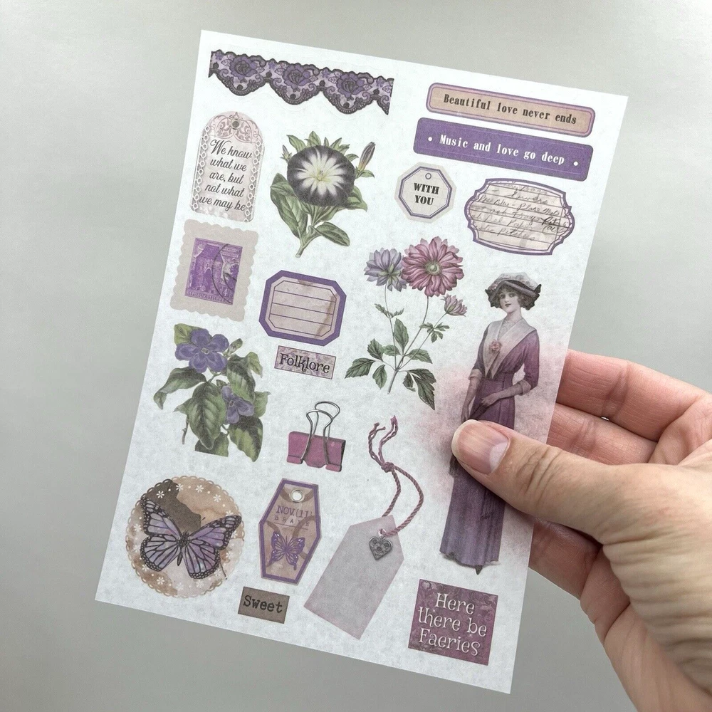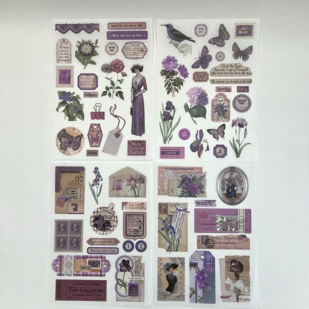 Vintage Style Garden Purple Washi Paper Stickers 4 Sheets Junk Journal Collage