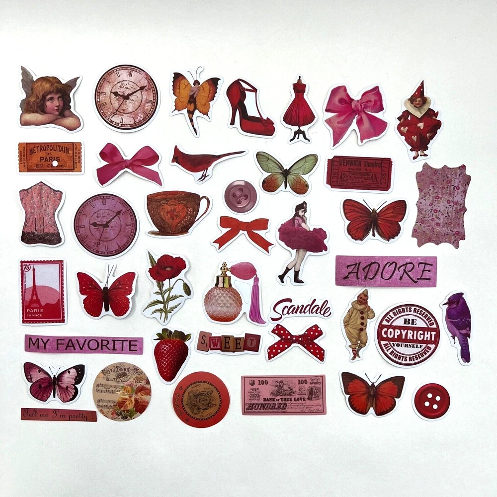 60 stickers. Red hued vintage style. The sticker in the last photo measures approx. 2 1/4 inches tall. These stickers have a nice feel to them. I have more stickers, washi tape and paper for sale. I do combine shipping. Please put all the items you want to purchase in ONE cart and then pay. I will refund you the difference in shipping after shipping label is printed. Let me know if you have any questions through eBay messaging. Thank you for stopping by!