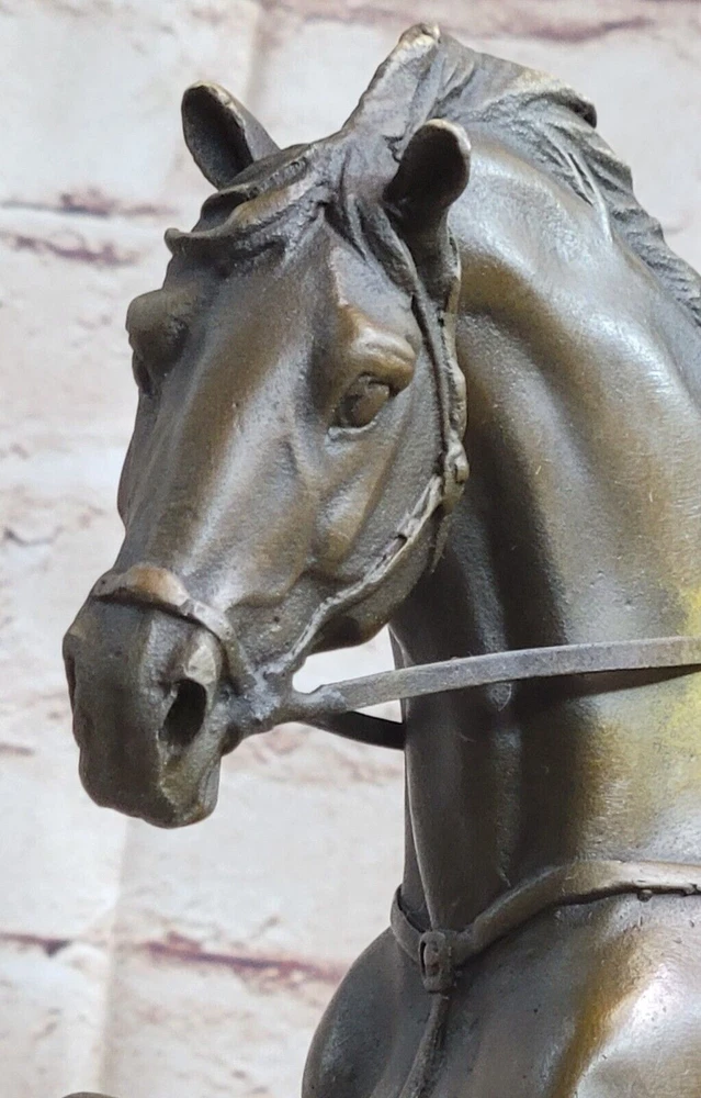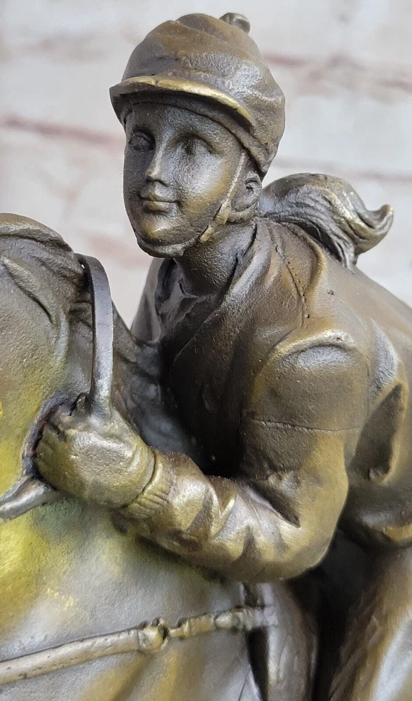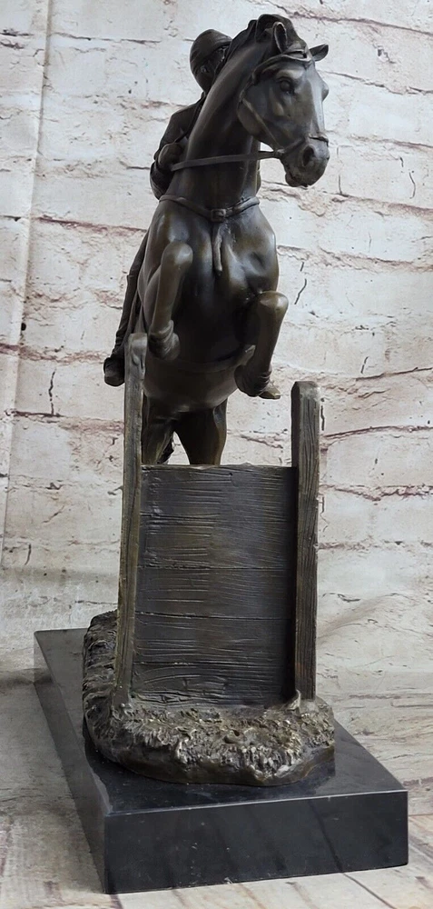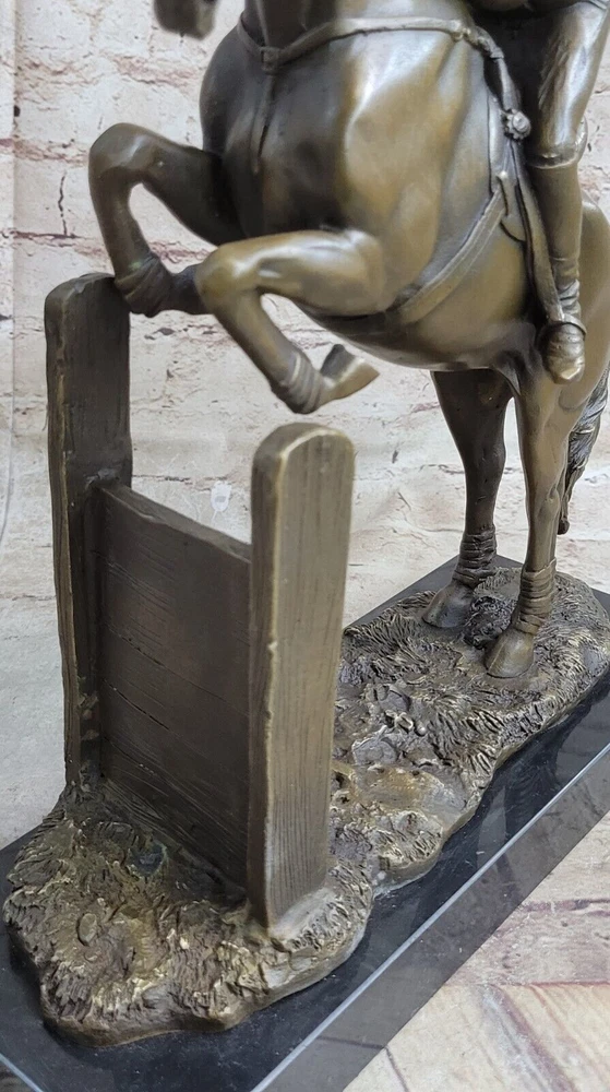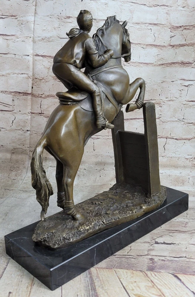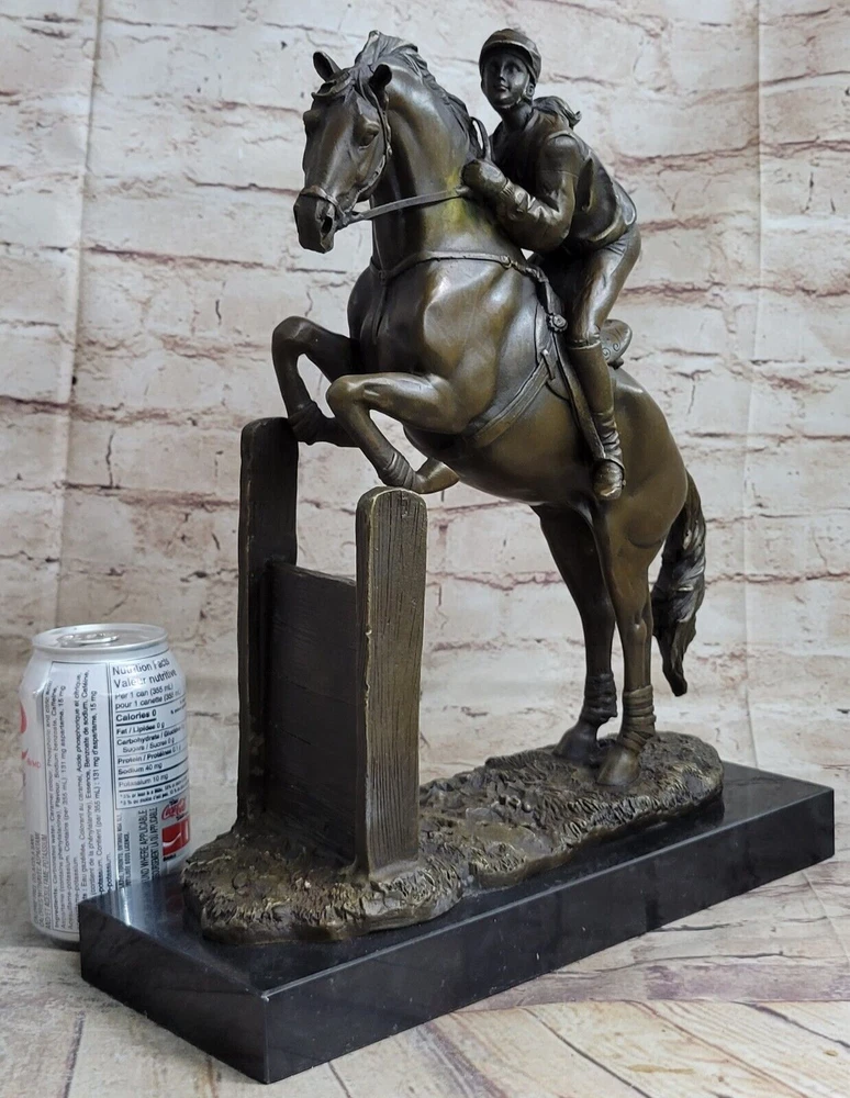 Vintage Style Steeplechase Horse Race Jockey Horse Taking Vertical Jump Gift NR Vintage Style Steeplechase Horse Race Jockey Horse Taking Vertical Jump Gift NR Condition : This sculpture is in perfect condition. Bronze Dimensions with Marble Base: Height 13" X Width 12" Marble Dimensions:12" x 5" Height without base:12" Weight:19 LBS Inventory:27YRD11988972 This exquisite figurine depicts a jockey riding her racehorse after a thrilling race. The jockey is portrayed in a relaxed yet confident pose, with both hands on the horse's rope as the majestic creature stands proudly beneath her. The attention to detail is remarkable, capturing the essence of a real racehorse and jockey in action. The jockey is dressed in full racing attire, complete with a cap and riding gear, while the horse is adorned with a beautifully detailed saddle. Every aspect of the sculpture, from the muscular build of the horse to the intricate headstall and flowing tail, adds to its authenticity and realism. Mounted on a rectangular marble base and signed by the artist Fisher, this piece is not only a stunning work of art but also a testament to the skill and craftsmanship of the creator. It captures the dynamic energy and grace of horse racing, making it a perfect addition to any equestrian enthusiast's collection. Female Jockey Equestrian Bronze Sculpture Statue Figure Decor on Marble Base YRD-1198 Bronzhaus.com Video will open in a new window Using the eBay App? Paste link into a browser window: [isdntekvideo] Shipping Terms : Most of our items are shipped via USPS (United States Postal Service) mail or UPS. Most orders are shipped within 24-48 hours of purchase. Please be aware that not all items are available for USPS shipping due to size and weight. We do ship to Hawaii, Alaska, Canada, Puerto Rico, APO/AE, and U.S. Virgin Islands, however, an additional charge may be required. Please contact us before making any purchases in these areas. For Non-USA customers, you may be responsible for all duty, tax, brokerage fees that may be due upon delivery (shipping costs cover freight charges only). We also ship internationally. Please refer to the "Shipping and Handling" chart for the rates for each area. Payment : We accept just about any form of payment. PayPal, Master Card, Visa or American Express credit cards. Money orders, cashiers checks, and even personal or business checks. For governmental institutions, we will also accept a purchase order. Please understand that for personal or business checks we have to wait for the check to clear (usually 7 days) before shipping. Condition : New Detailed Hand Crafted Hot Cast Bronze Satisfaction Guaranteed. This is Stock Photo, Slight Color Variation!! Listing and template services provided by inkFrog