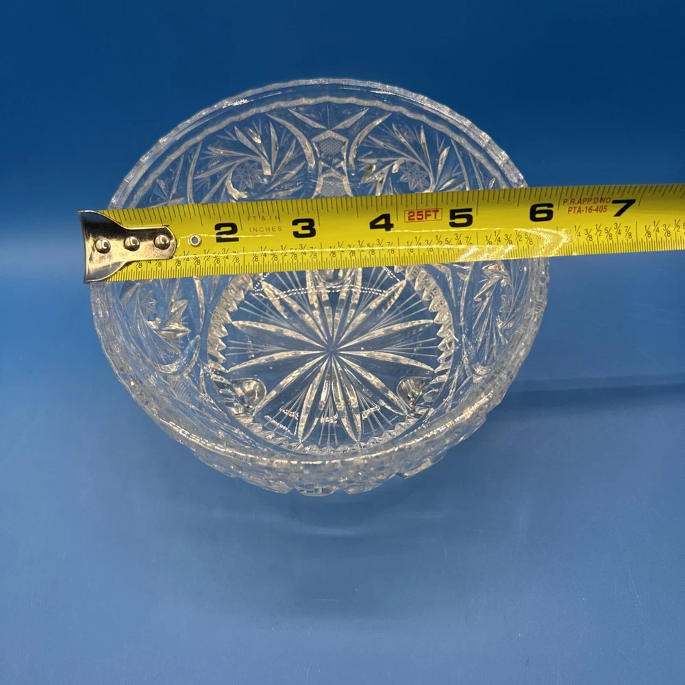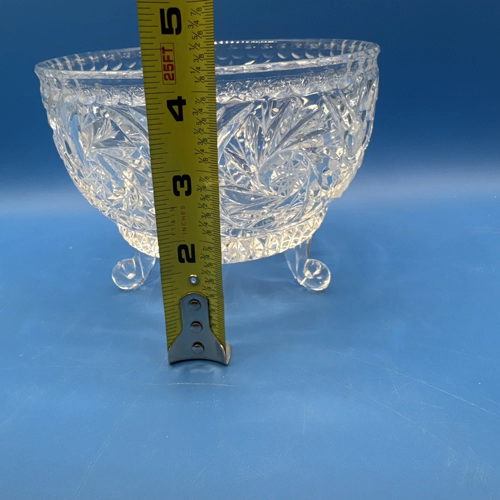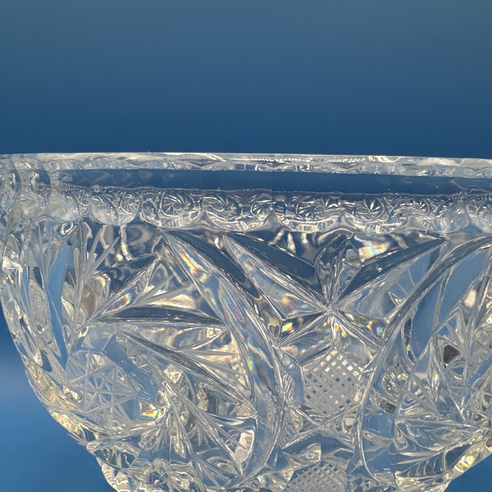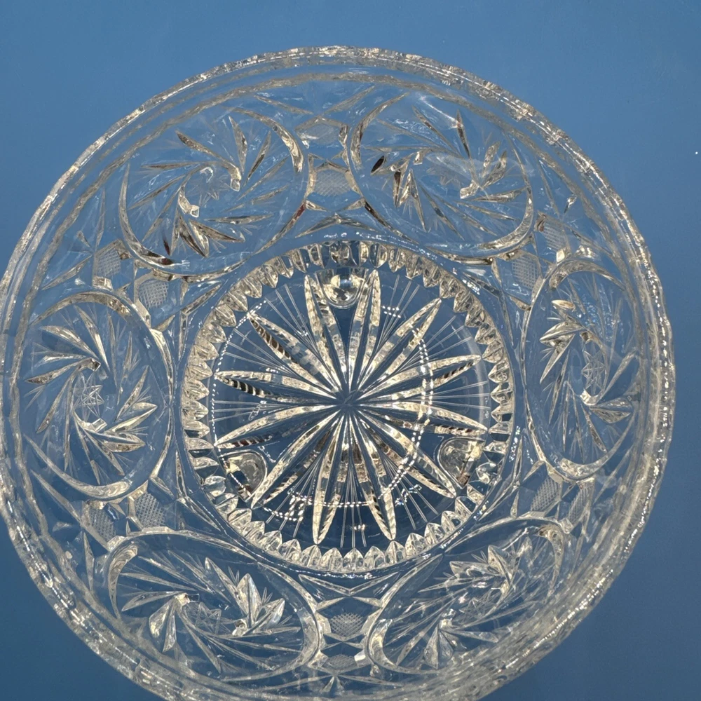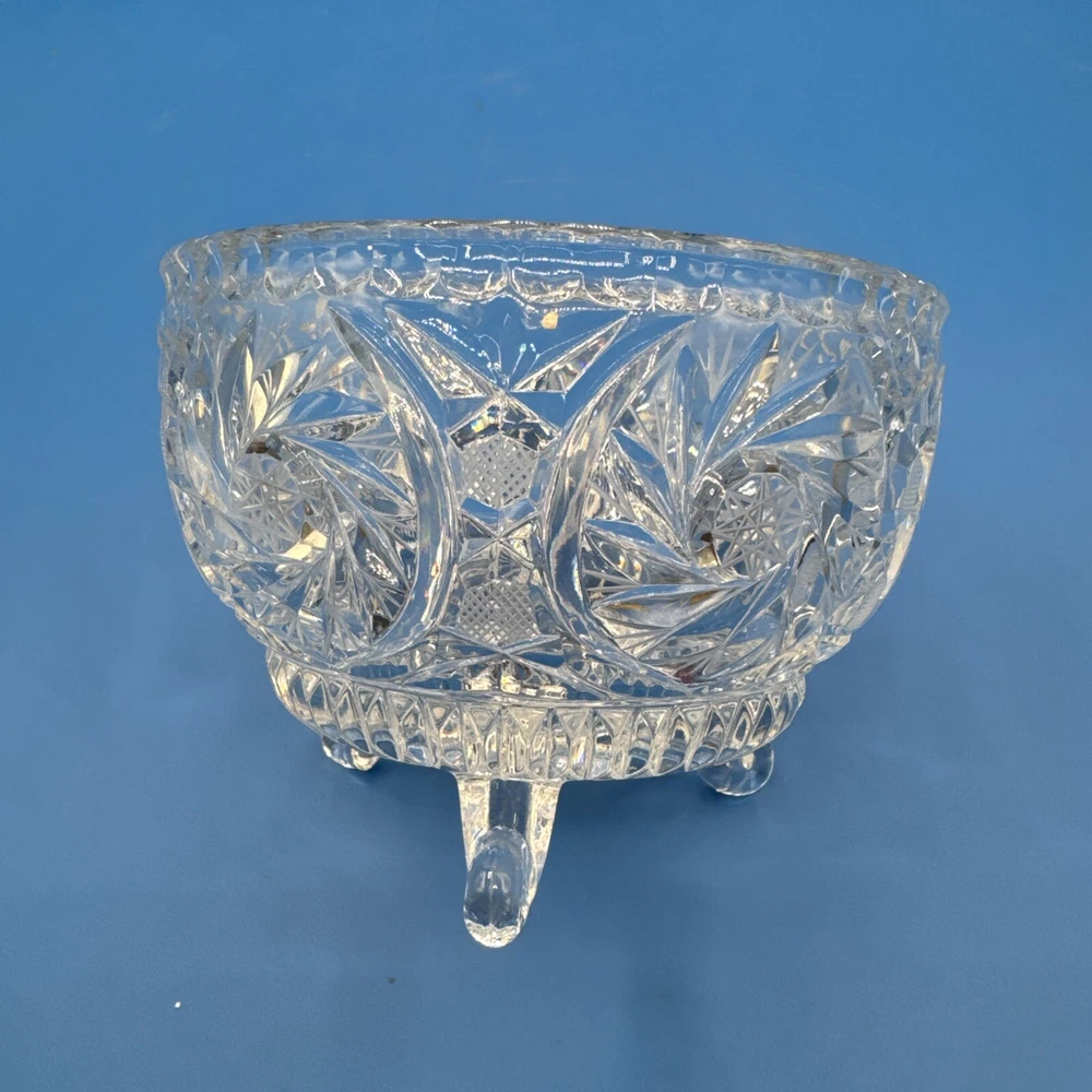 This is a vintage decorative bowl made of clear glass with a floral sunburst cut design. It is footed and likely used as a dessert bowl. The production style is cut glass, giving it a detailed and intricate look. The brand is unmarked, adding to its charm and mystery as a collectible piece. Pre-owned excellent condition. No original box. No cracks or damages. Please check the pictures carefully as part of the description. Feel free to ask questions if you need more information before you buy it. Thank you for your interest B-10