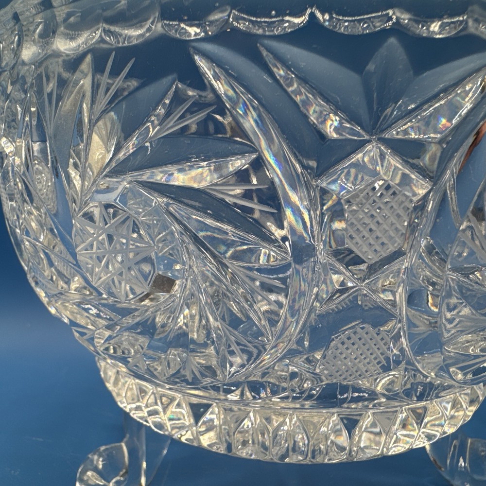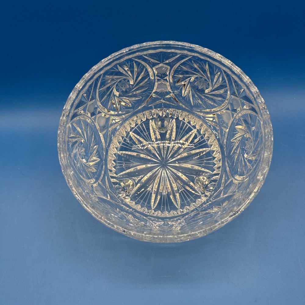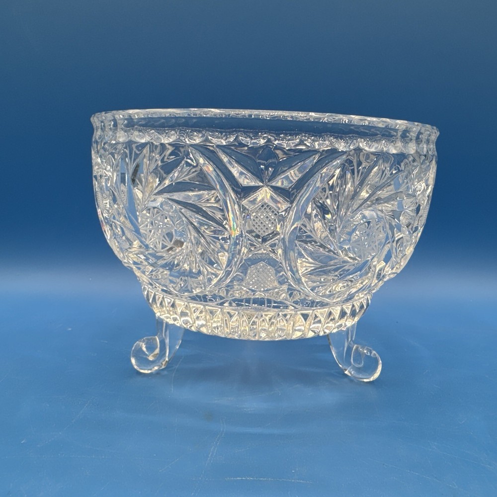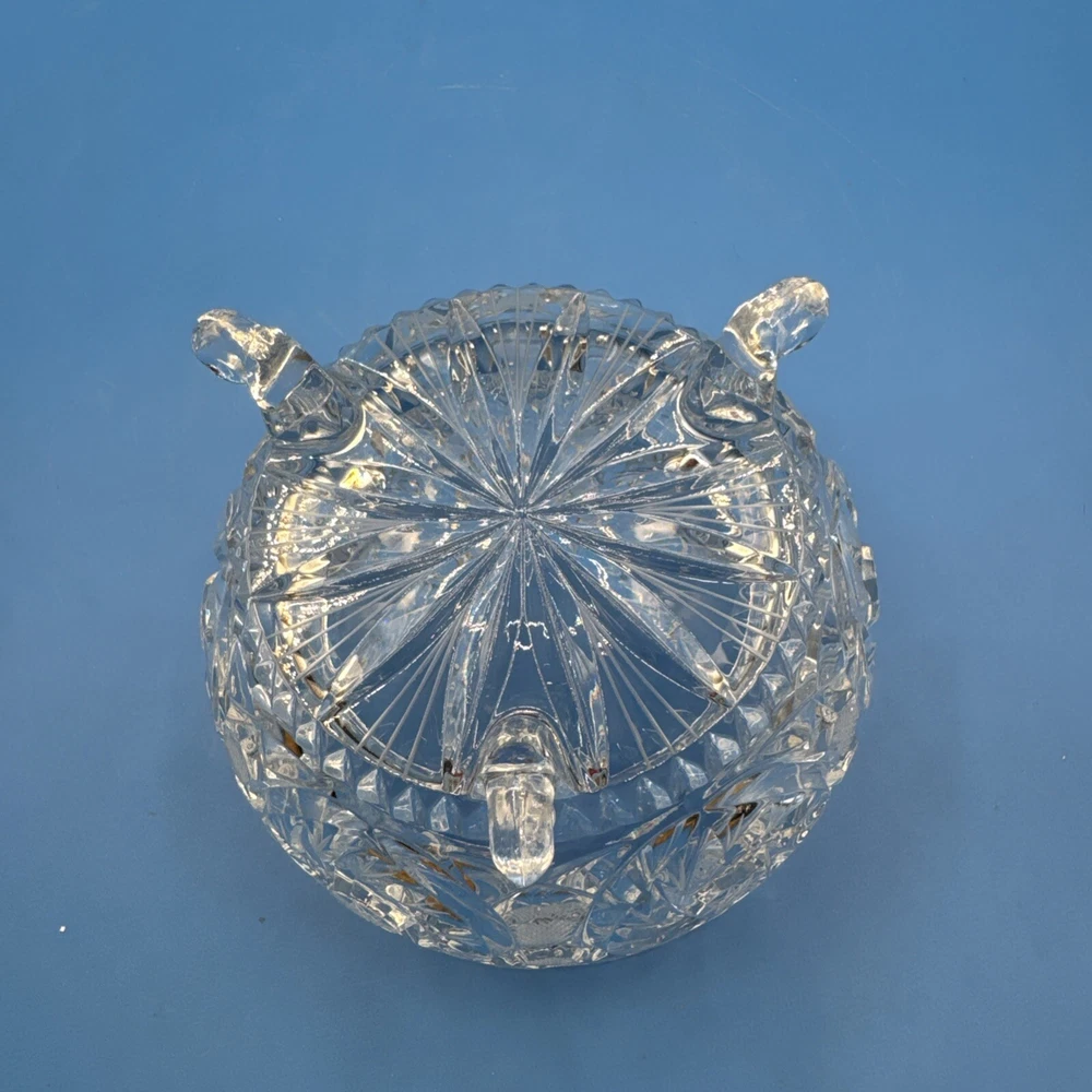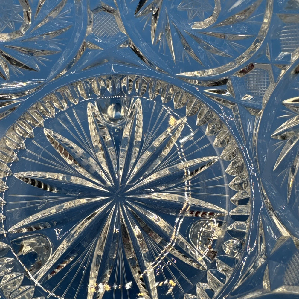 This is a vintage decorative bowl made of clear glass with a floral sunburst cut design. It is footed and likely used as a dessert bowl. The production style is cut glass, giving it a detailed and intricate look. The brand is unmarked, adding to its charm and mystery as a collectible piece. Pre-owned excellent condition. No original box. No cracks or damages. Please check the pictures carefully as part of the description. Feel free to ask questions if you need more information before you buy it. Thank you for your interest B-10