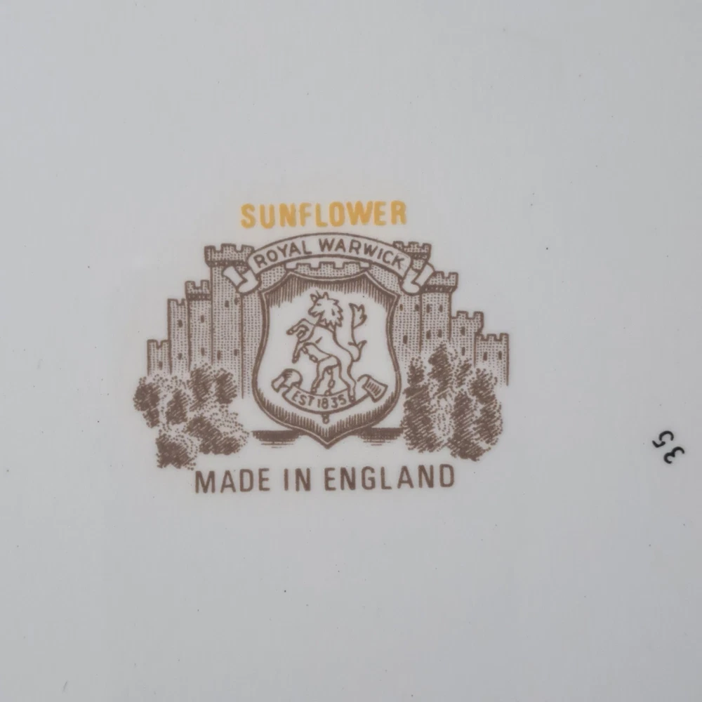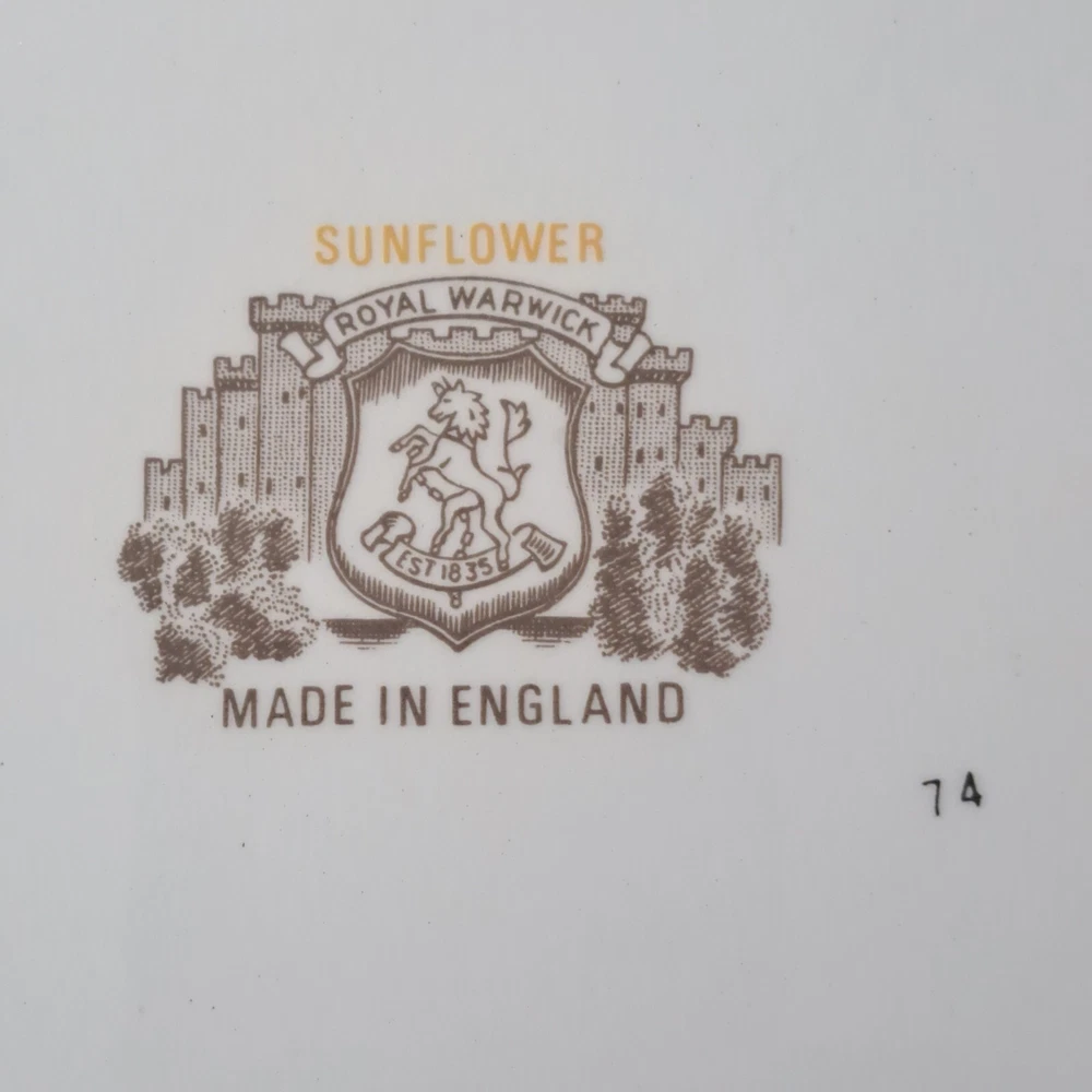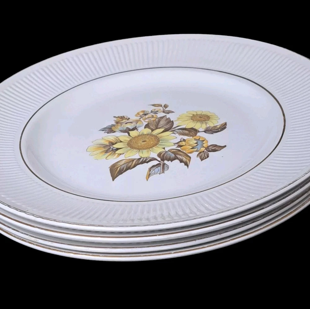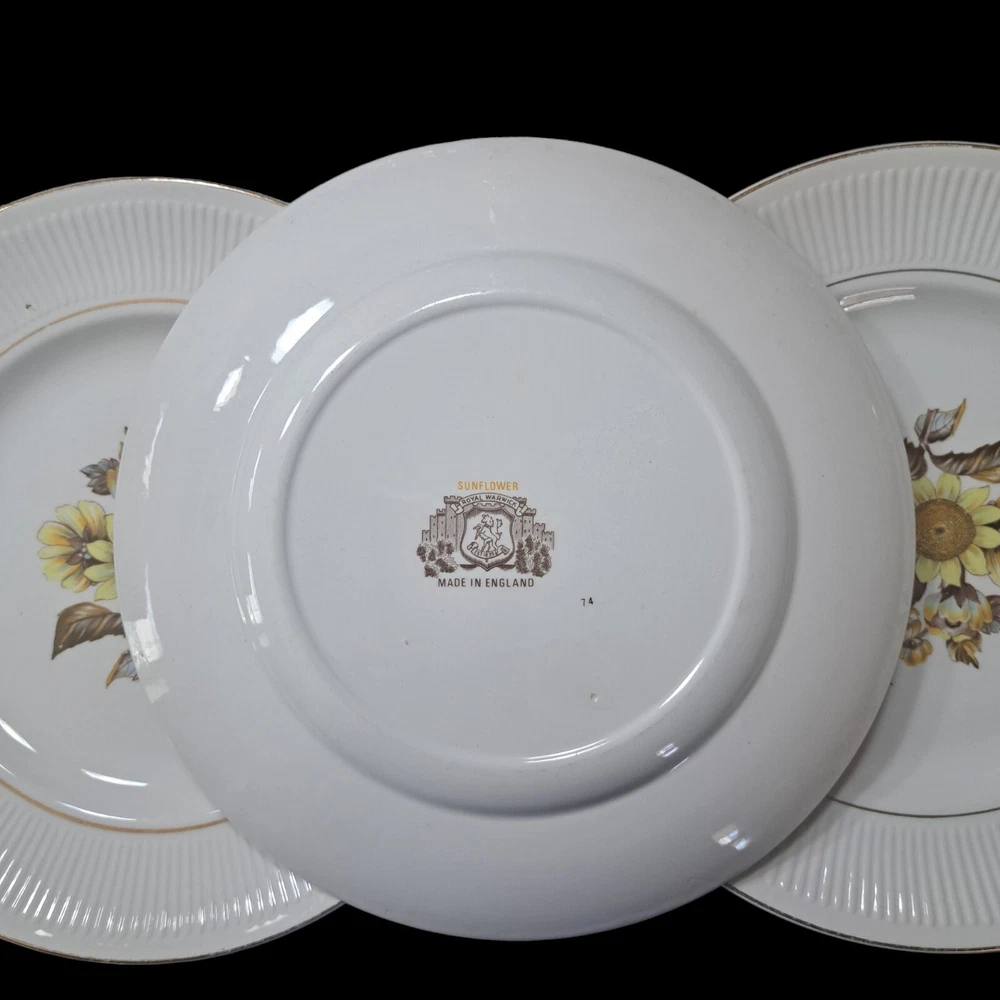 This beautiful set of four vintage Royal Warwick dinner plates features a stunning sunflower pattern on a round porcelain plate. Made in England in the late 20th century, these plates are perfect for any occasion, and add a touch of vintage charm to your table setting. Measuring 10 inches in diameter, these plates are ideal for serving your favorite meals. Hand wash only to preserve the vintage character..