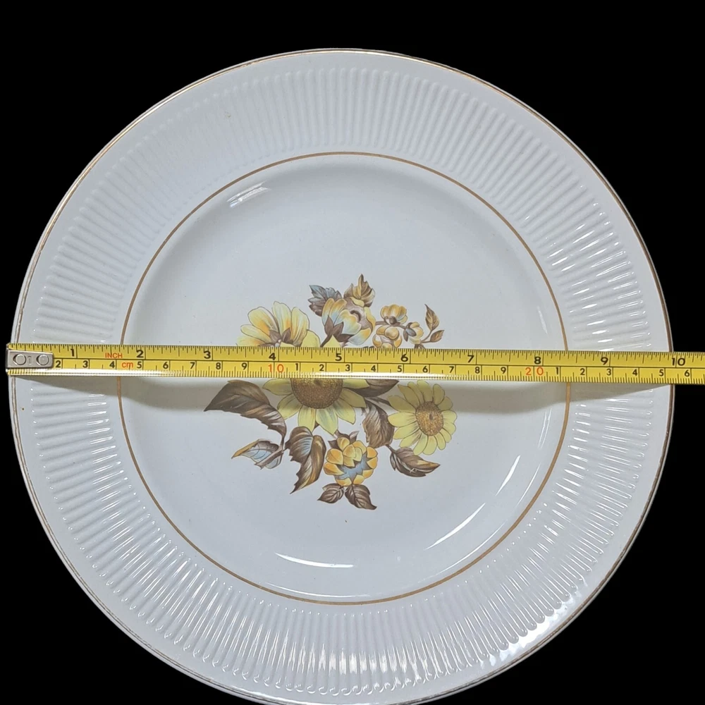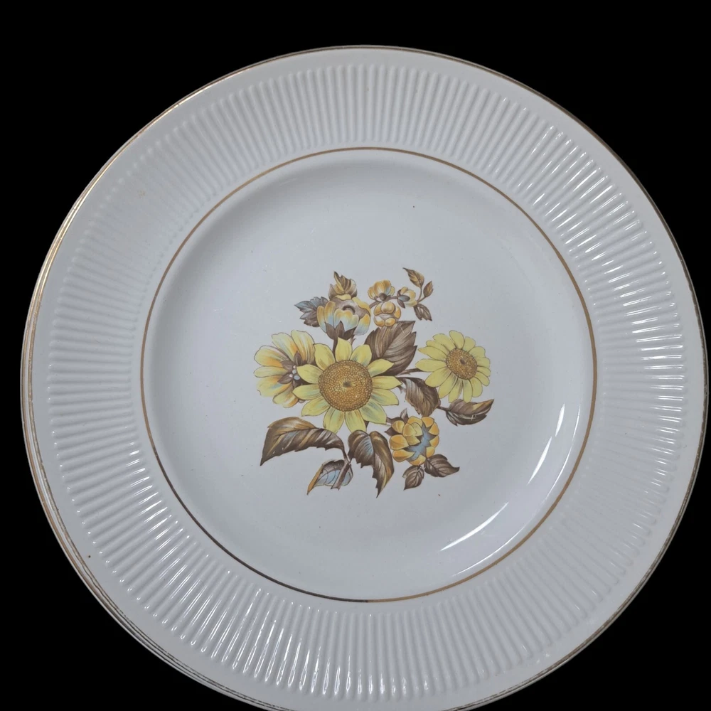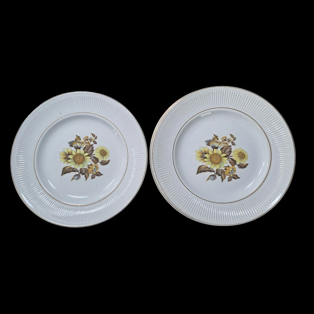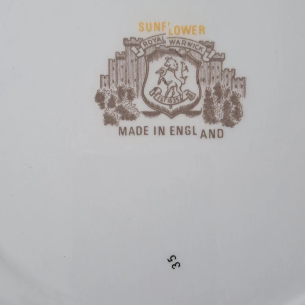 This beautiful set of four vintage Royal Warwick dinner plates features a stunning sunflower pattern on a round porcelain plate. Made in England in the late 20th century, these plates are perfect for any occasion, and add a touch of vintage charm to your table setting. Measuring 10 inches in diameter, these plates are ideal for serving your favorite meals. Hand wash only to preserve the vintage character..