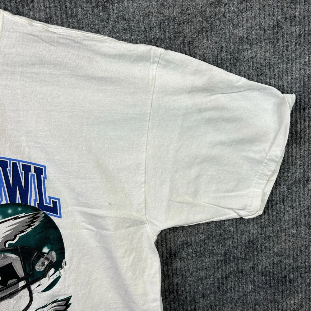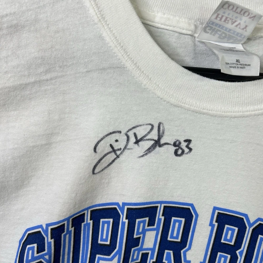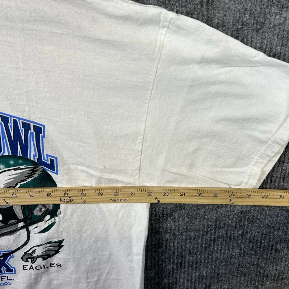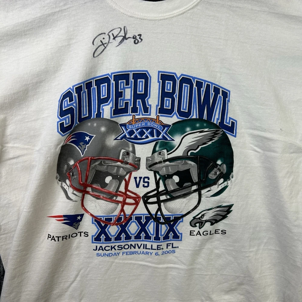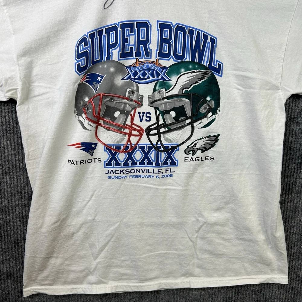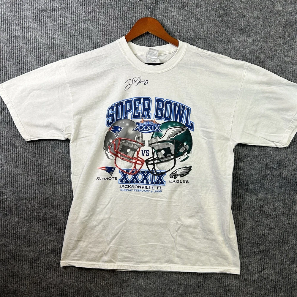 Vintage Super Bowl XXXIX T Shirt Men’s XL Patriots vs. Eagles NFL White - Deion Branch Autogeaph NO COA See All Photos Preowned Condition. An item that has been used previously. The item may have some signs of cosmetic wear, but is fully operational and functions as intended. See all pictures for blemishes and details. Preowned items may have stains, pilling or holes that will be pointed out in the pictures. Pictures also provide an approximate measurement of the size, which will also be in item specifics. Pant pictures include measurements for waist, rise and inseam. Tops include pit to pit and length. All Preowned Clothes Are Washed/Laundered According To Ebays Policy. Any questions please ask. Thank you.