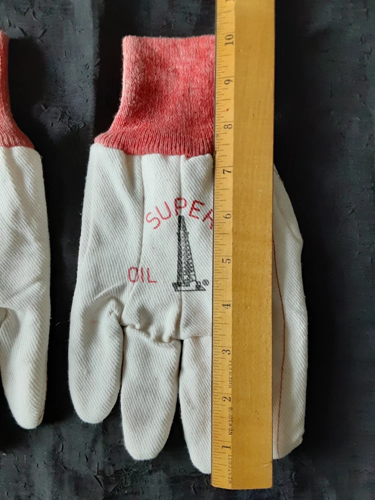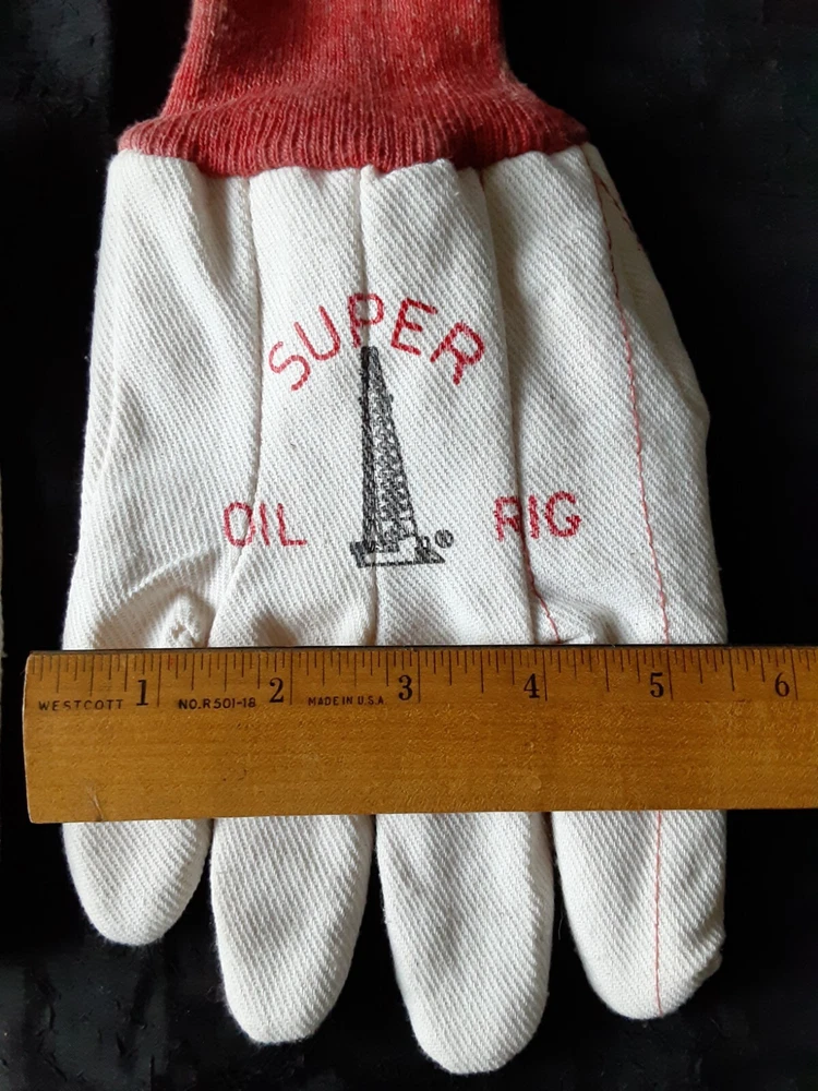 Vintage white heavy cotton work gloves that are insulated. One of them has "Super Oil Rig" imprinted on the top side. They are not sized or branded but are adult size. The measurements are in the photos. Very good condition. Please make payments within three (3) days of auction close. I ship daily. As soon as you pay most times. Always happy to combine shipping when possible. Please contact me before payment for invoice on combined items. I try very hard to describe items accurately and put in plenty of photos. If you have any questions, please just ask. Most of my items are pre-owned and not always by me. If they are washable they will arrive clean but I don't wash some vintage items. Also, non smoking home . If you have any problem with a purchase please contact me so I may have the opportunity to make your purchase satisfactory. Thanks and happy hunting !!