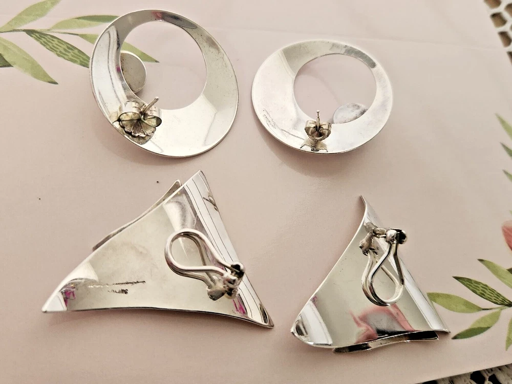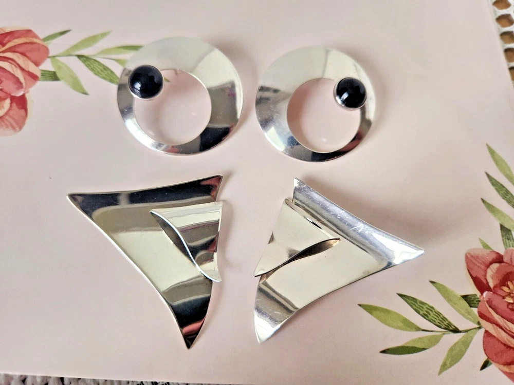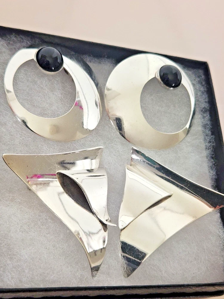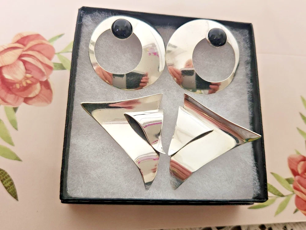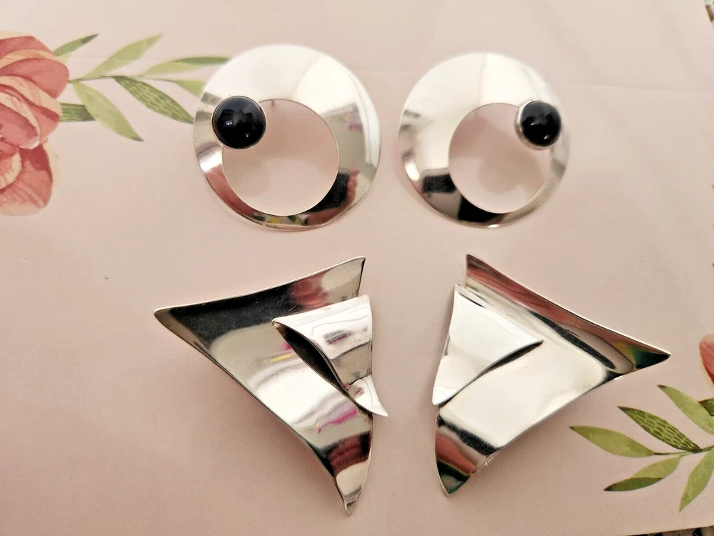 Up for your consideration is a lovely set of two pairs of Designer Susan Cummings Mid-Century Modernist earrings. One pair is pierced and the other is clip-on. The round earrings measure approx. 1 5/8” x 1 5/8” and the t op segment is accented with a dark black Onyx round stone. The Triangle earrings measures approx. 1 5/8” x 2” inches. These must be from earlier in Cummings career, perhaps from the time that she sold through Neiman Marcus, because her current website has nothing in this style. The overall condition is excellent with minor wear. This would make a great gift or a nice addition to any-ones jewelry collection. Thanks for looking! Please check out more of my auctions. *** Happy Bidding*** Before purchasing please read the description carefully, look at all the photos posted, and contact me if you have any questions. Shipping & Payment Details: Flat fee shipping cost of $6.85 to USA buyers only. “No International shipping”. Please e-mail me with any questions you may have prior to bidding.