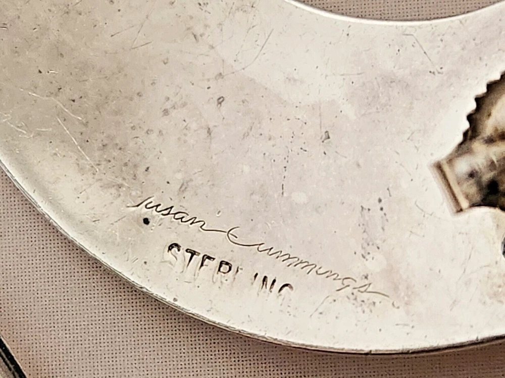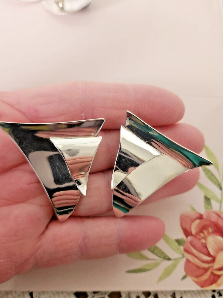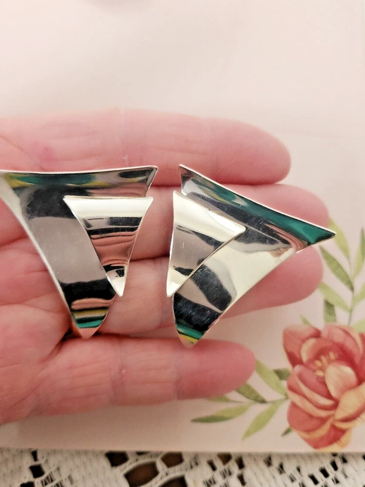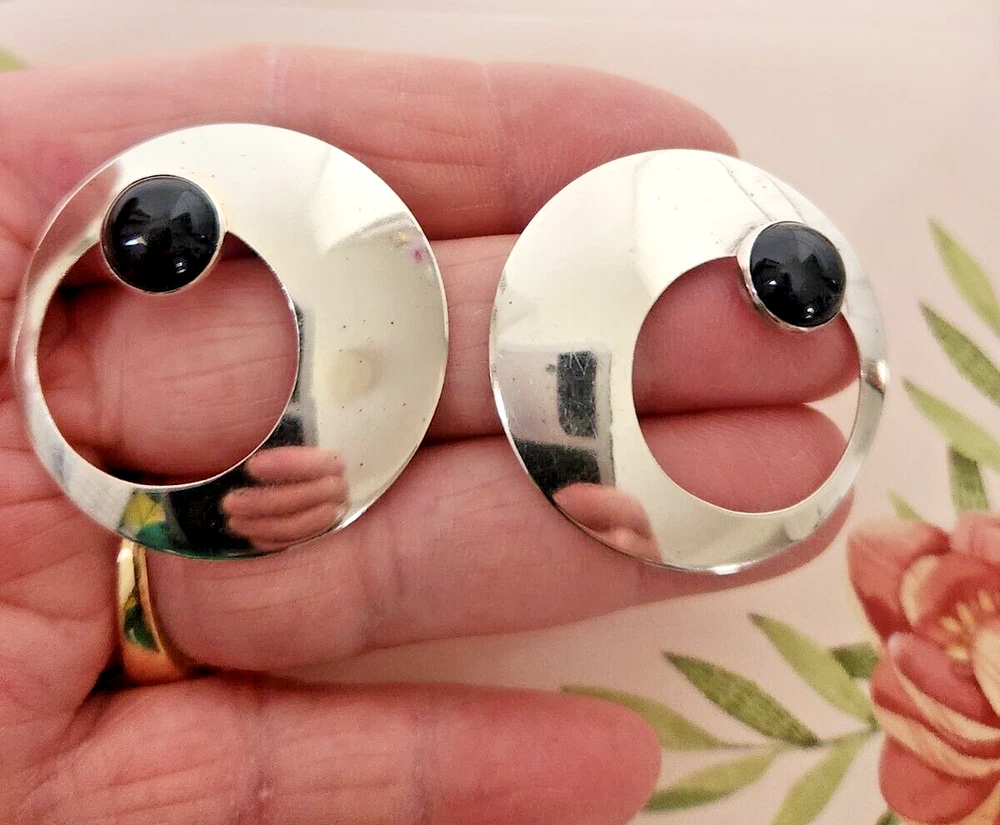 Up for your consideration is a lovely set of two pairs of Designer Susan Cummings Mid-Century Modernist earrings. One pair is pierced and the other is clip-on. The round earrings measure approx. 1 5/8” x 1 5/8” and the t op segment is accented with a dark black Onyx round stone. The Triangle earrings measures approx. 1 5/8” x 2” inches. These must be from earlier in Cummings career, perhaps from the time that she sold through Neiman Marcus, because her current website has nothing in this style. The overall condition is excellent with minor wear. This would make a great gift or a nice addition to any-ones jewelry collection. Thanks for looking! Please check out more of my auctions. *** Happy Bidding*** Before purchasing please read the description carefully, look at all the photos posted, and contact me if you have any questions. Shipping & Payment Details: Flat fee shipping cost of $6.85 to USA buyers only. “No International shipping”. Please e-mail me with any questions you may have prior to bidding.