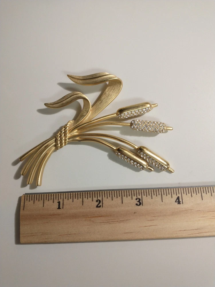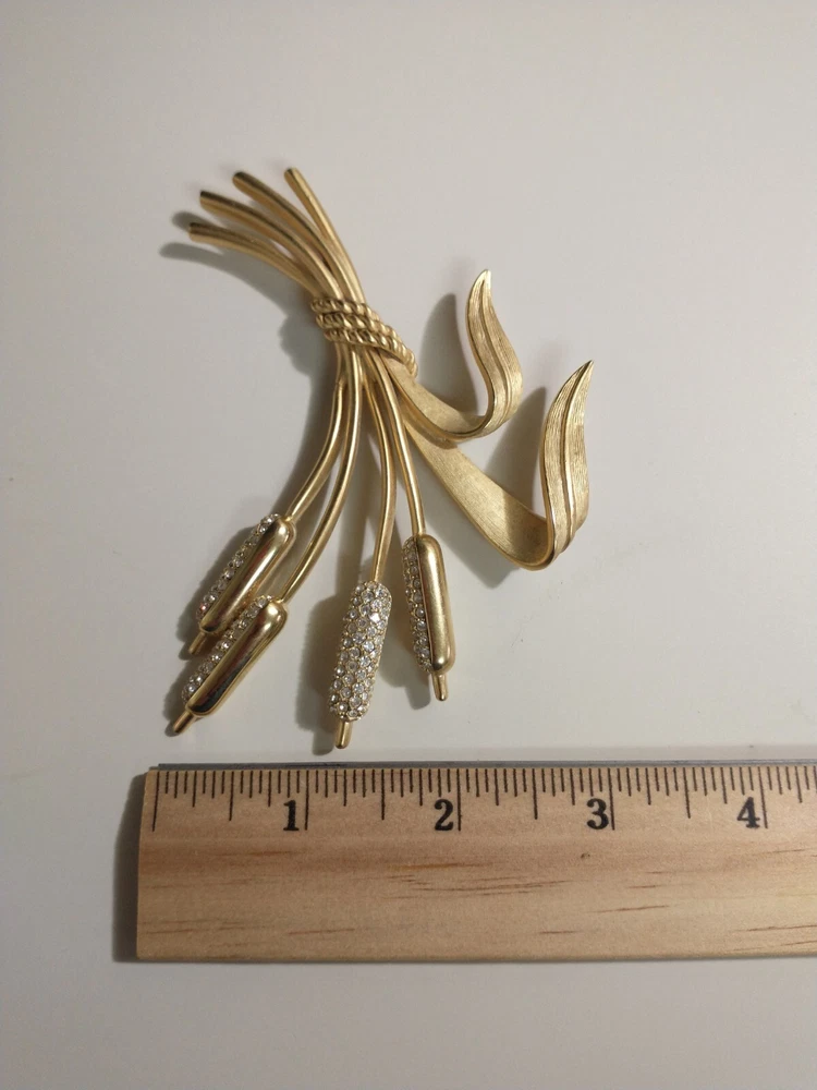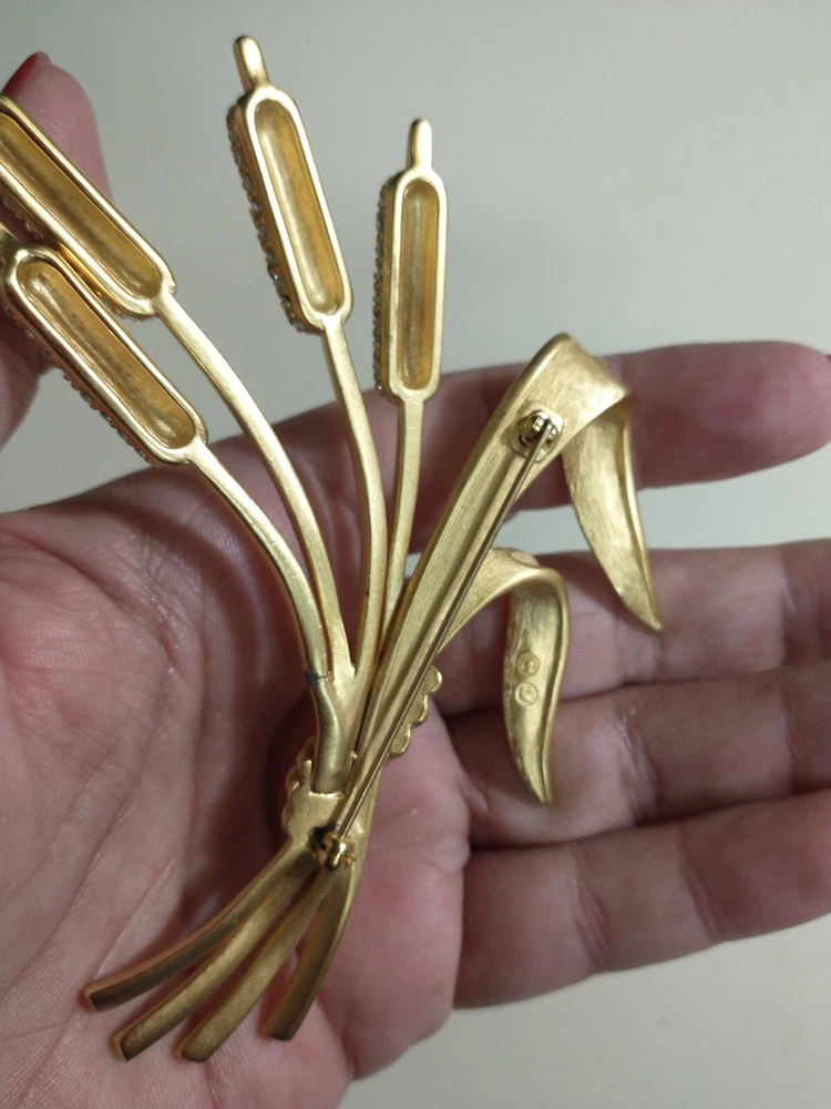 Please see images for size and condition description. Beautiful Swarovski brushed gold-plated matte cattail brooch w sparkling clear crystals. No loose or missing stones. No verdigris. Pin clasp is in good working order. Swan logo present. Definitely a statement piece that is 4 inches long. As is. Thanks! FREE SHIPPING!