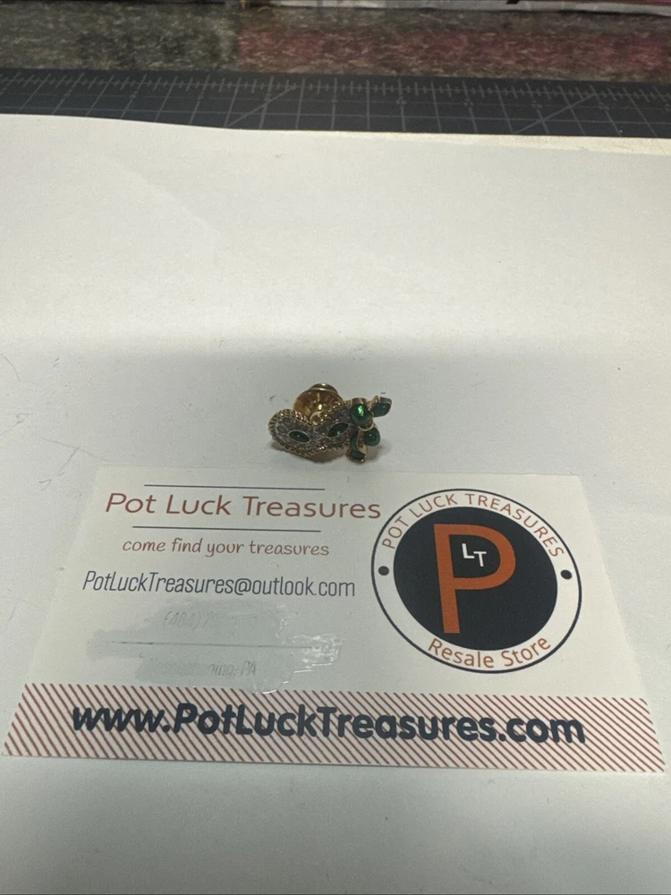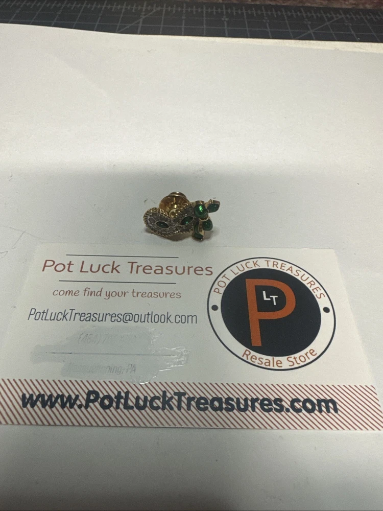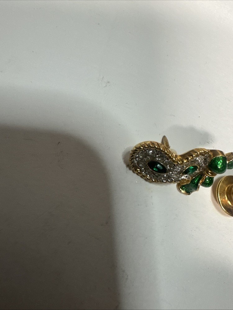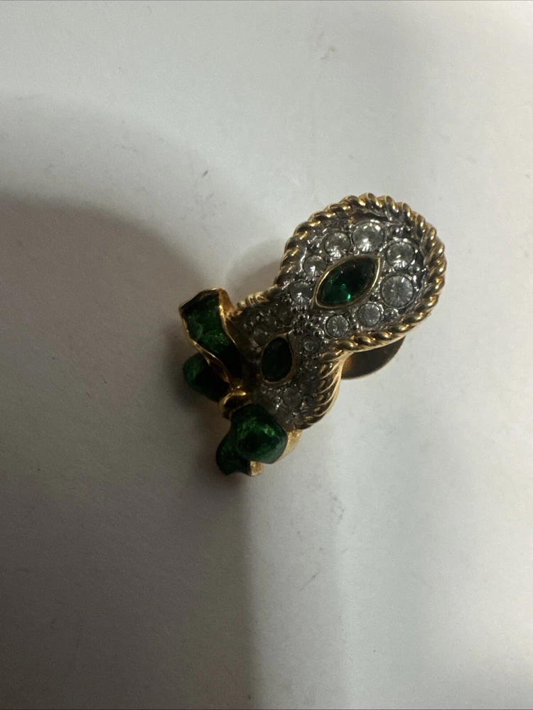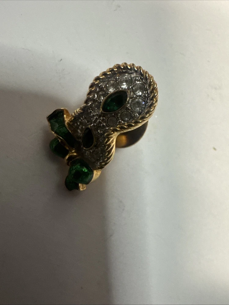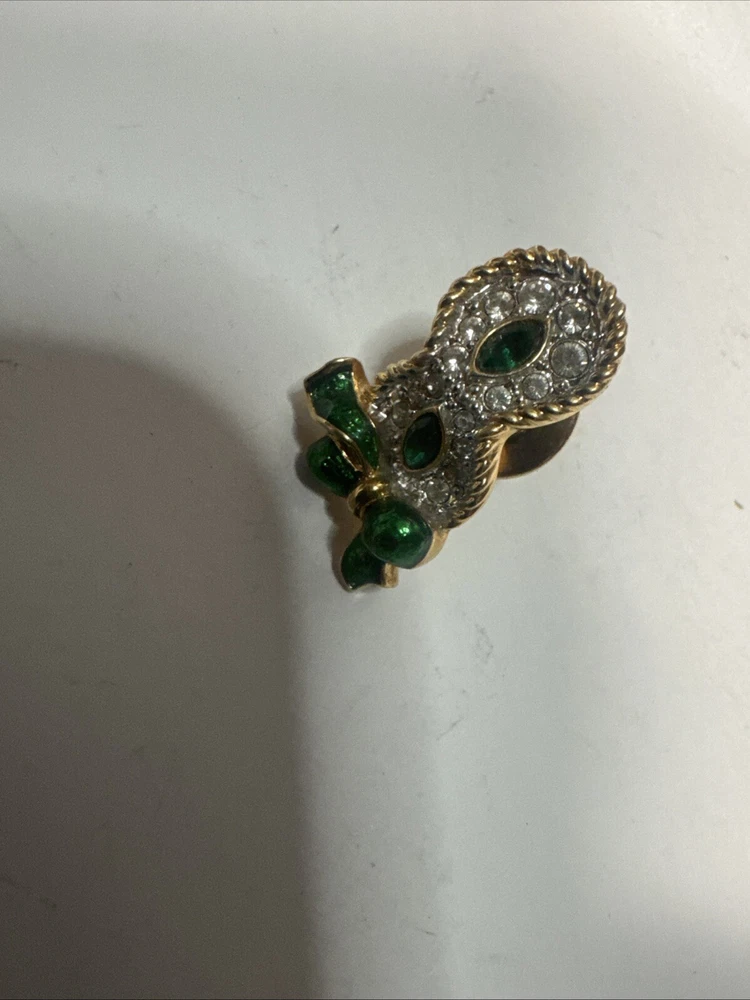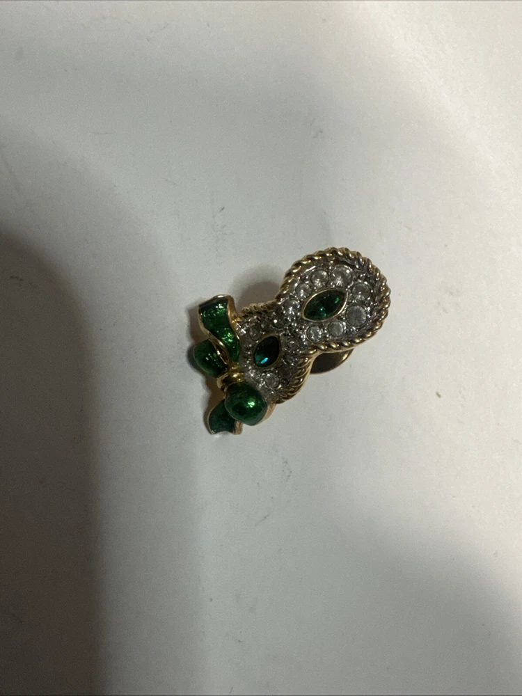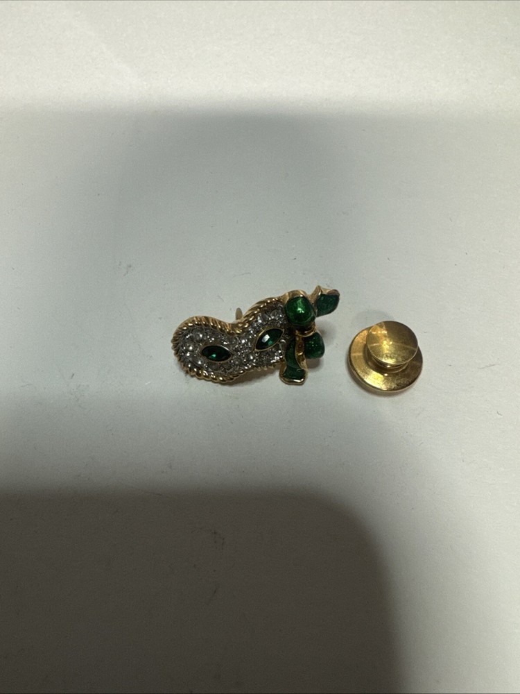 This vintage pin is a tie tac style featuring a green enamel design with a white/colorless crystal as the main stone. It is signed by Swarovski with their distinctive swan mark and is crafted in yellow gold plated metal. The pin has a Mardi Gras theme, making it a unique and eye-catching accessory for any vintage jewelry lover. Please see photos for condition. Please feel free to contact us with any questions before purchasing.