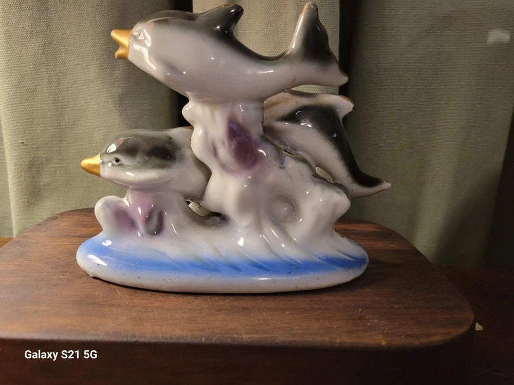 Vintage Swimming Dolphin Family Shell Figurine Ceramic Porcelain Nautical. Condition is Used. Shipped with USPS Ground Advantage.