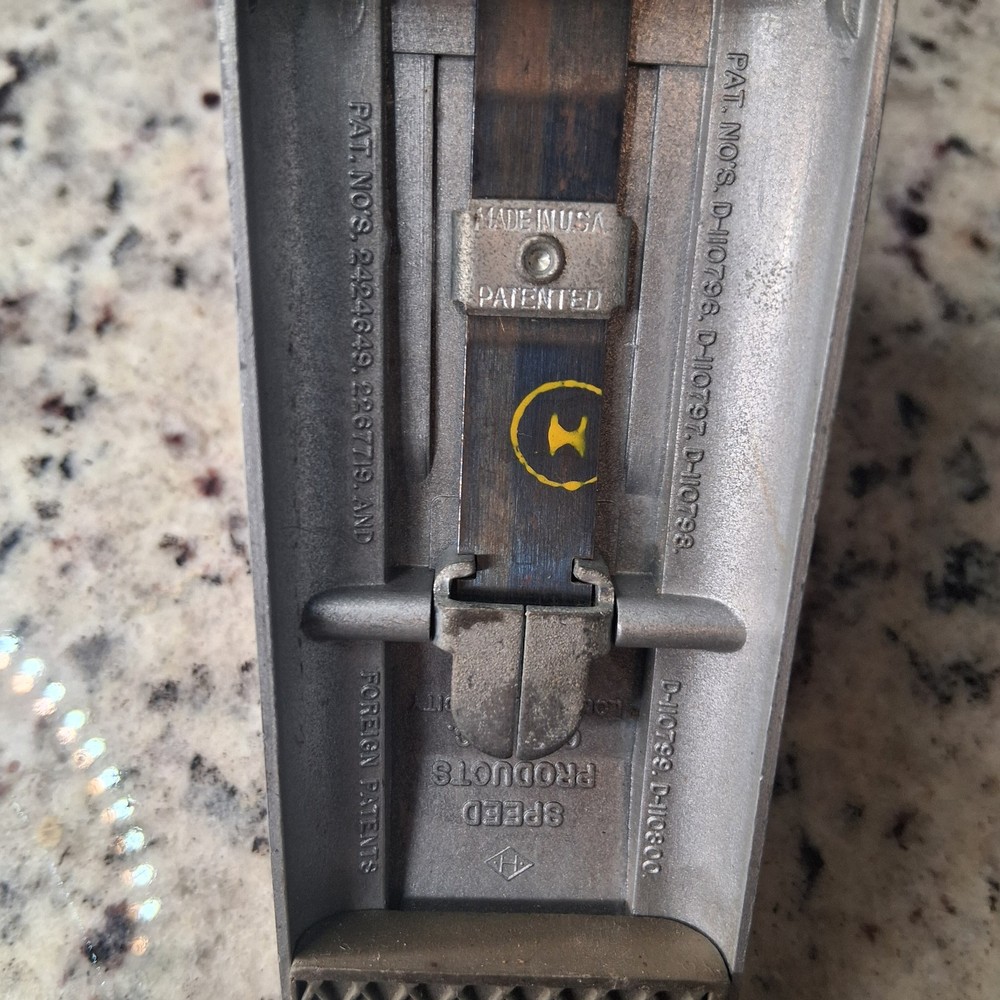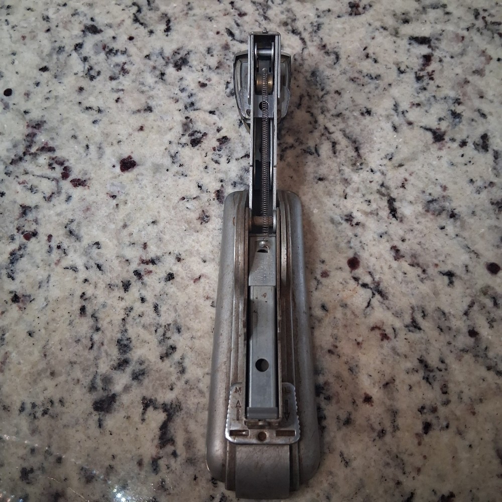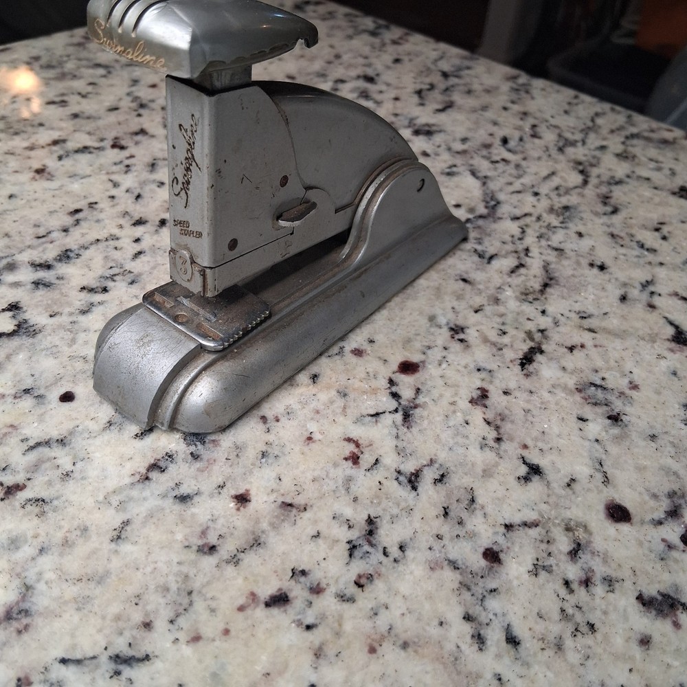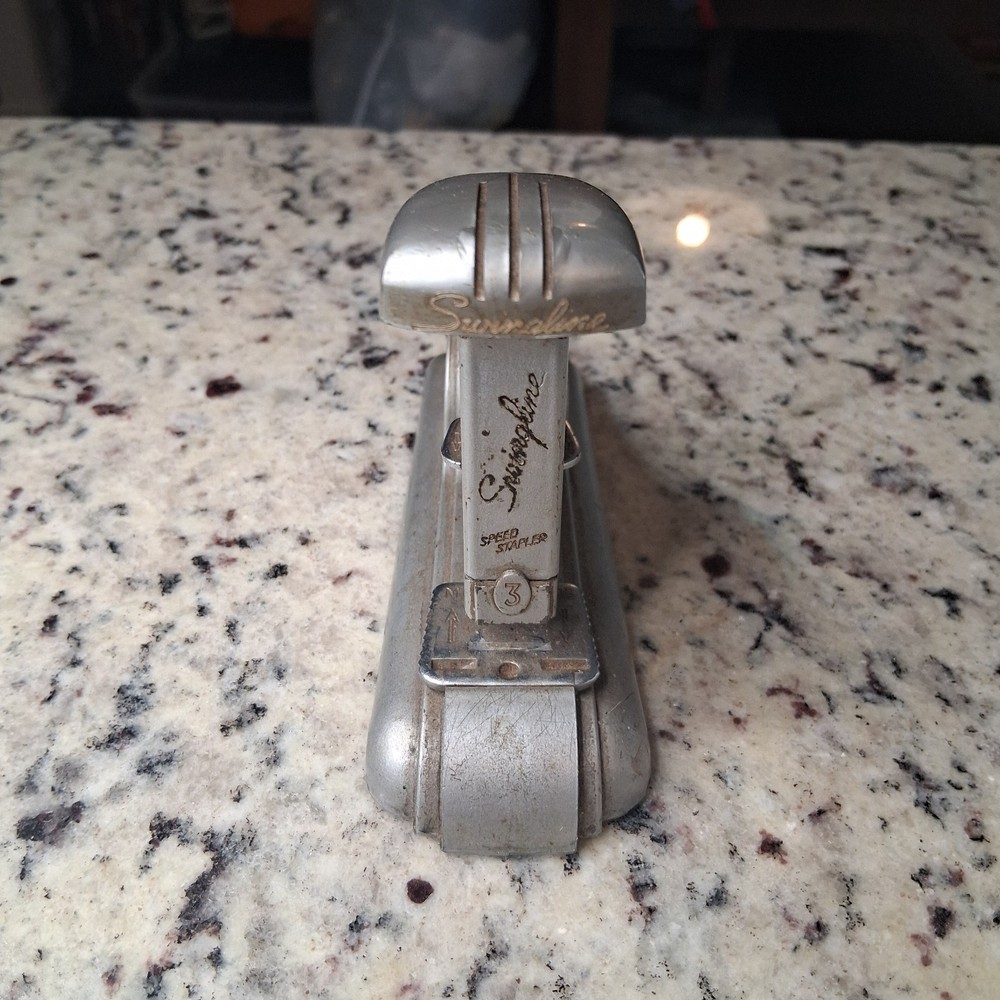 Vintage Swingline Speed Stapler No. 3 – Made in USA Original metal Swingline Speed Stapler No. 3 featuring classic Art Deco industrial design. ✔ Marked “Made in USA” ✔ Patented ✔ Heavy solid metal construction ✔ Fully functional – tested and working ✔ Adjustable staple depth Condition: Pre-owned vintage condition with cosmetic wear consistent with age. Shows surface wear and patina. Mechanism operates properly. Great for collectors, office décor, or daily use. Ships securely packed.