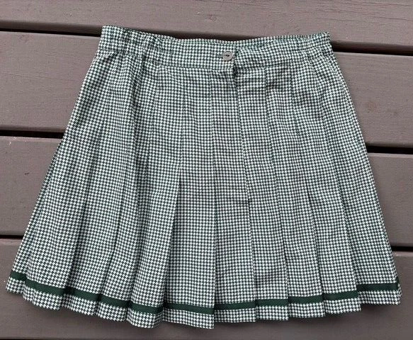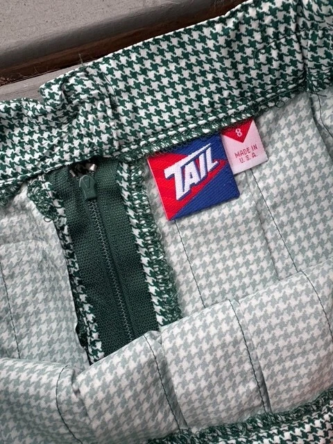This is a listing for a pre-owned vintage Tail tennis skirt in a size 8 (modern small). It is made in the USA and has a green grosgrain ribbon trim and elastic side panels at waist. It has a back zipper closure and cute enamel green button with gold trim. Please ask all questions prior to auction end for all sales are final. Thank you & good luck! BRAND: TAIL SIZE: Vintage US size 8. 13.5" across waist lying flat, 15.5" in length Fabric: 100% polyester Unlined Made in USA