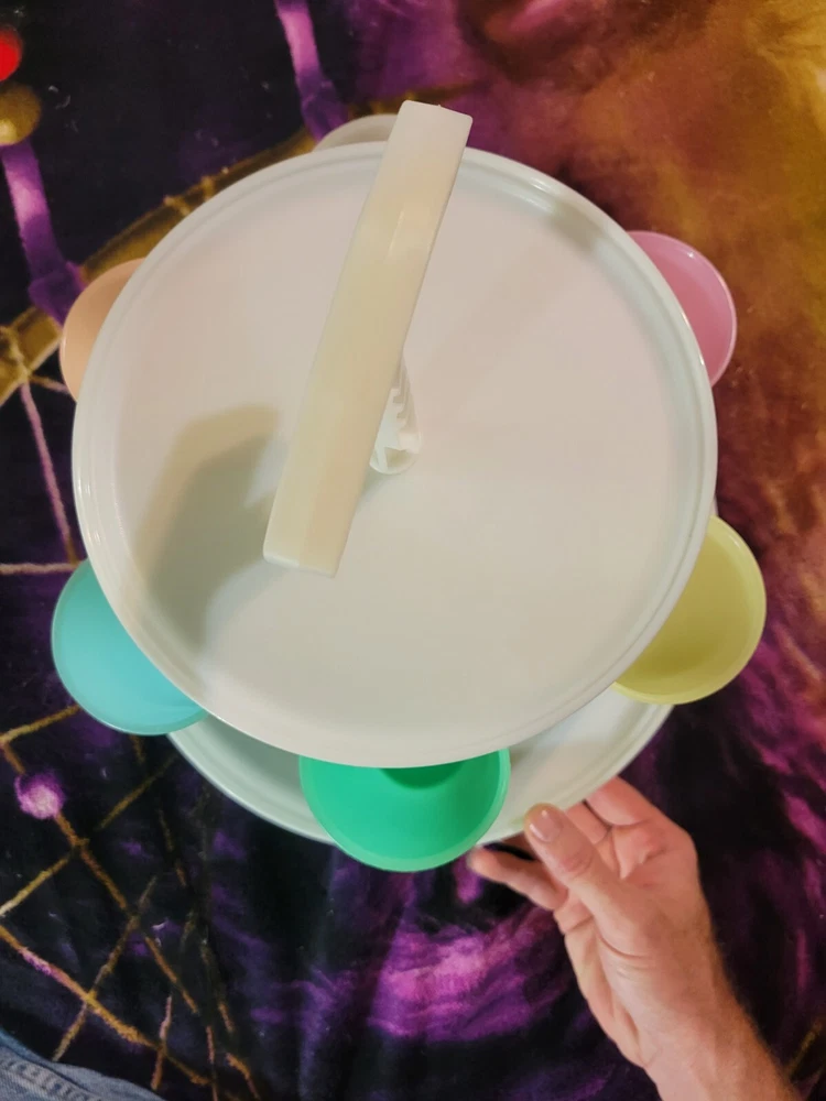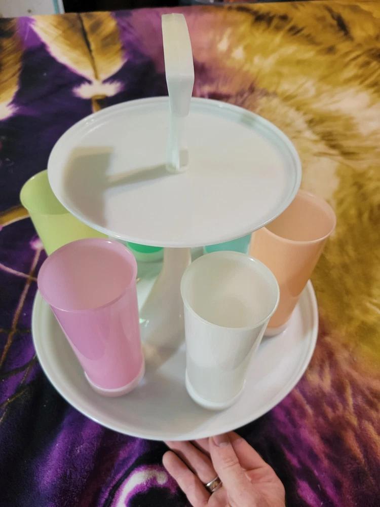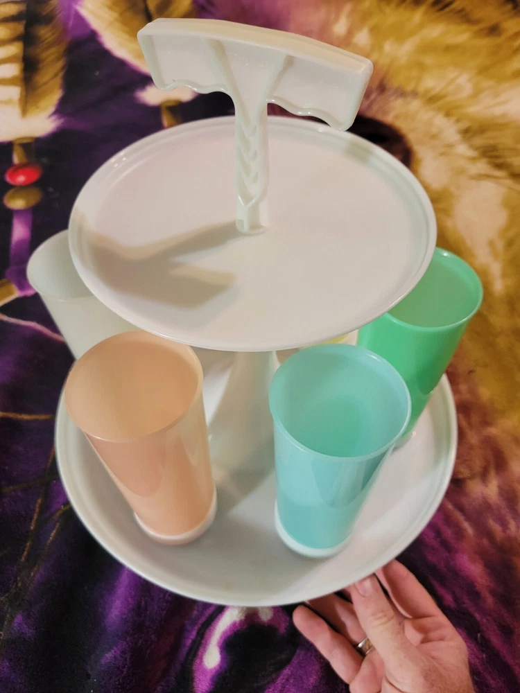 Vintage TUPPERWARE CAROUSEL CADDY w/ ALL ORIGINAL PASTEL TUMBLERS No 503-3. Item and tumblers are lightly used in very good condition with minor signs of ware please see attached photos