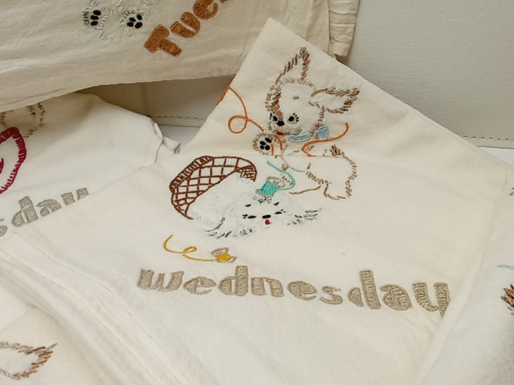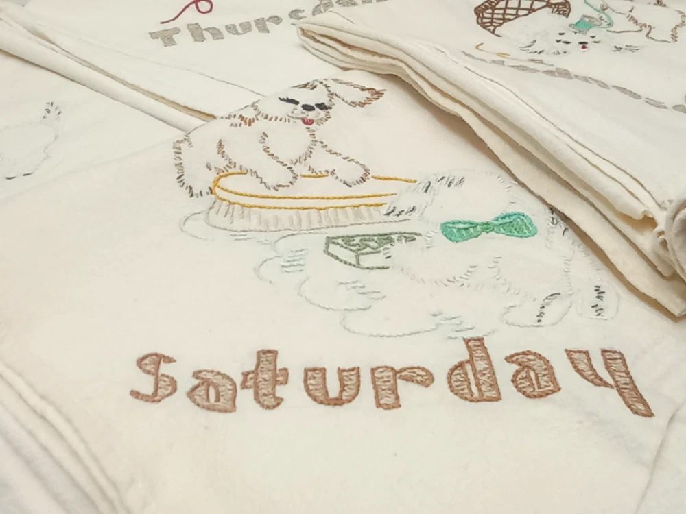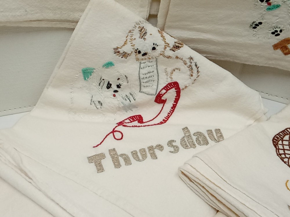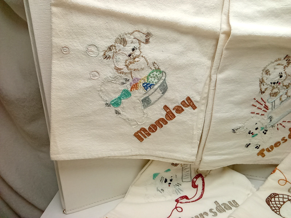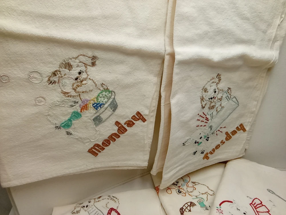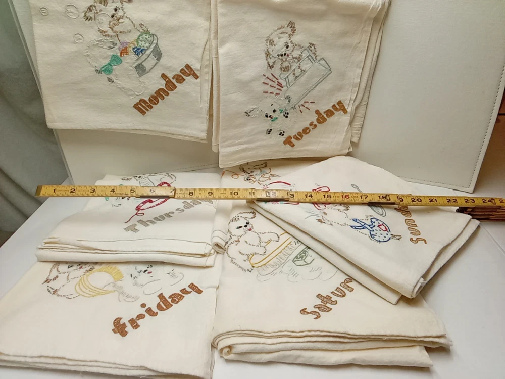 Vintage Linens Bedding Sheets Pillowcase Table Decor Cutter Fabric Textile Collectible -- Vintage Tablecloth Set-7 Days of the Week, Quality Hand-Embroidered Puppy Kitsch Square 35x36 In pre-owned* condition, appears used with general wear to include: wrinkles, some yellowy discoloration, couple faint spots, some stains on friday - see pics for detail. Style: Embroidered, Crochet Trim, Hand Stitched, Textile, Handmade, Sewing, Scrap Project, Remnant Fabric, Recycle Upcycle, Rescued Salvaged, Home Decor, Sewist, Crafter, Quilter, Wall Hanging, Table Dressing, Kitchen, Measures Approx: Length: 36 " Width: 35 " i# Hbx3779 Weight: 2-Lb 8- oz Condition: Items are quality pre-owned*, stylish, gently loved items with unique finishes and details. Any outwardly visible flaws will be noted - refer to photos as part of description. SHIPPING: Gift packaged securely with wrap, padded mailers, and boxes. Shipped USPS Priority Mail or First class Advantage, depending on weight and destination of item.