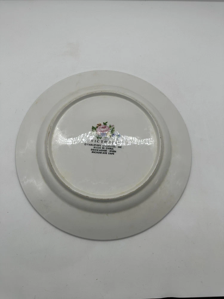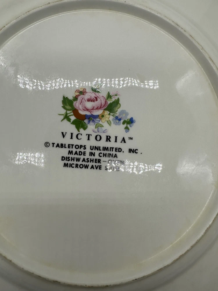 This vintage chop plate from Tabletops Unlimited features a beautiful ivory color with pink roses, making it an eclectic addition to any dinnerware collection. The round shape and scalloped edges add a touch of elegance, while the stoneware material ensures durability for everyday use. The plate set is a contemporary original production style of art pottery, with a printed backstamp and no handmade details. It is perfect for all occasions and is a great addition to any table setting. This product line is called Victoria, and it was manufactured in China during the 1990s. The set includes chop plates, and it is a great addition to any collection of decorative cookware, dinnerware, and serveware.
