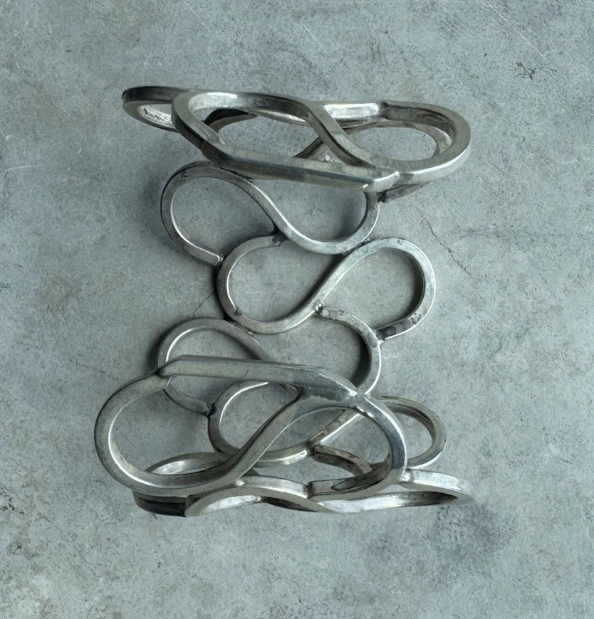 Vintage Taxco 925 Sterling Silver Abstract Art Cuff Bracelet — Signed & Handmade in Mexico, Wide 7-inch Statement Piece — Discover a timeless work of wearable art with this vintage Taxco sterling silver cuff . Handcrafted in Mexico and bearing the maker’s signature, it combines abstract artistry with bold design: Made of solid 925 sterling silver , nickel-free and safe for everyday wear A statement wide cuff (7 in) with sculptural, abstract patterns Signed by the artisan—authentic and collectible Excellent pre-owned condition with a patina that adds vintage charm From Taxco, a city renowned for exceptional silver craftsmanship Perfect For: Collectors of artisan jewelry, lovers of mid-century modern design, or style-savvy buyers seeking a standout statement cuff. #VintageTaxco #SterlingSilverCuff #AbstractArtJewelry #WideSilverBracelet #SignedTaxco #HandmadeMexico #StatementCuff #FineJewelry925 #CollectibleBracelet #TaxcoSilver