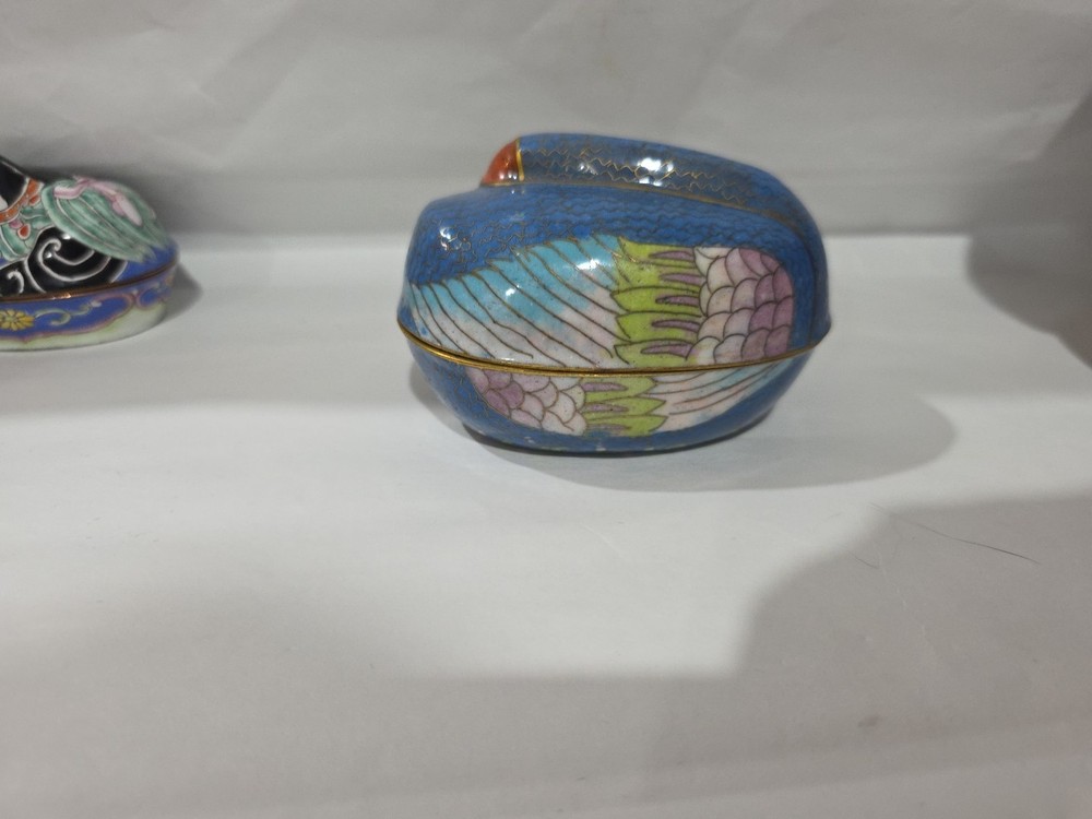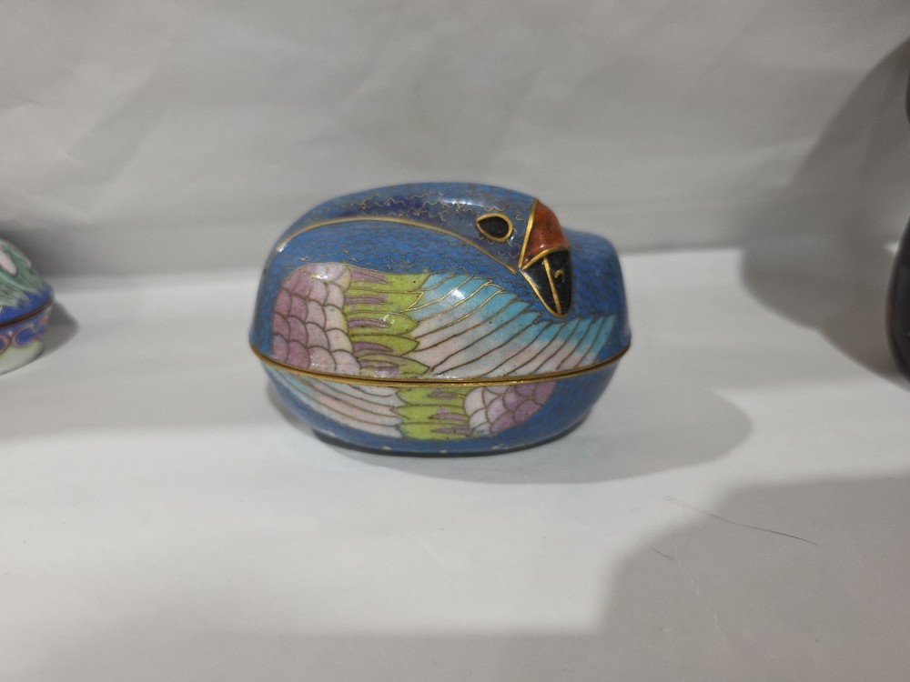 Vintage Teal Blue Gold Cloisonné Goose Enamel Trinket Box with Bird Inlay