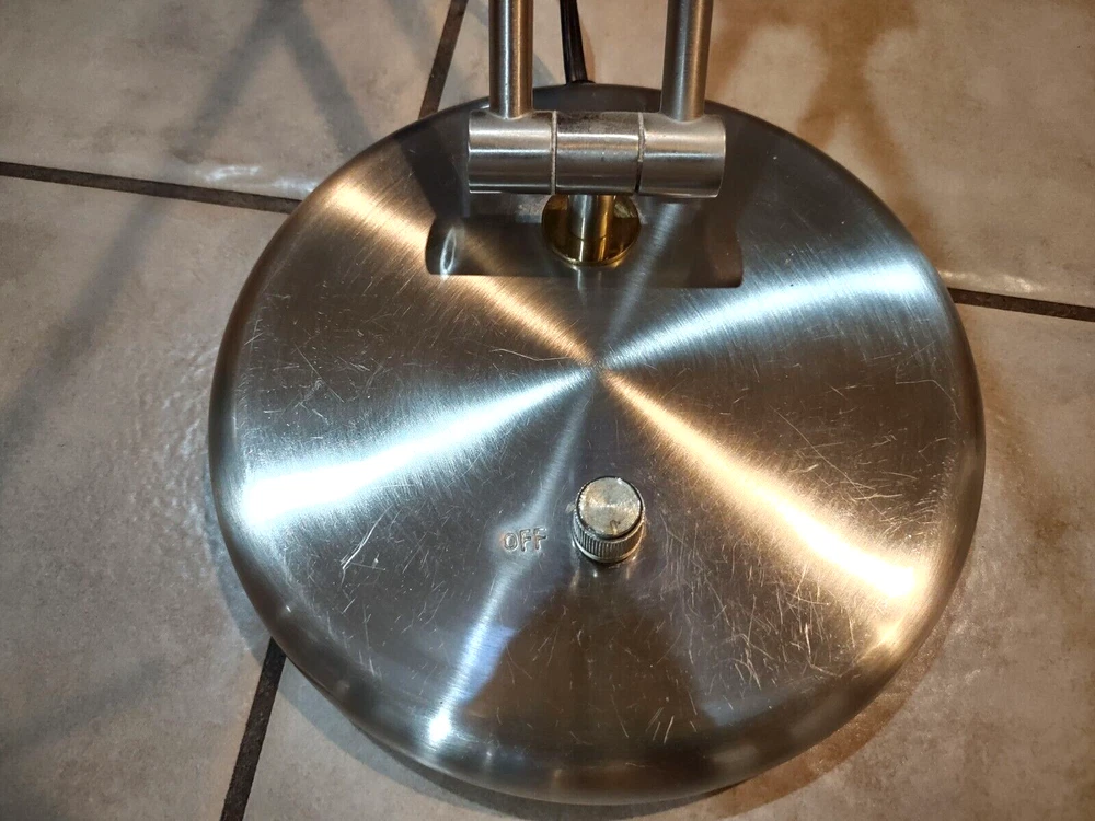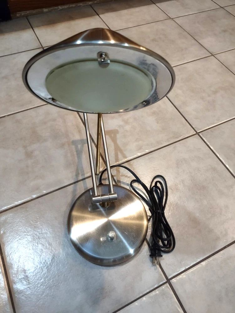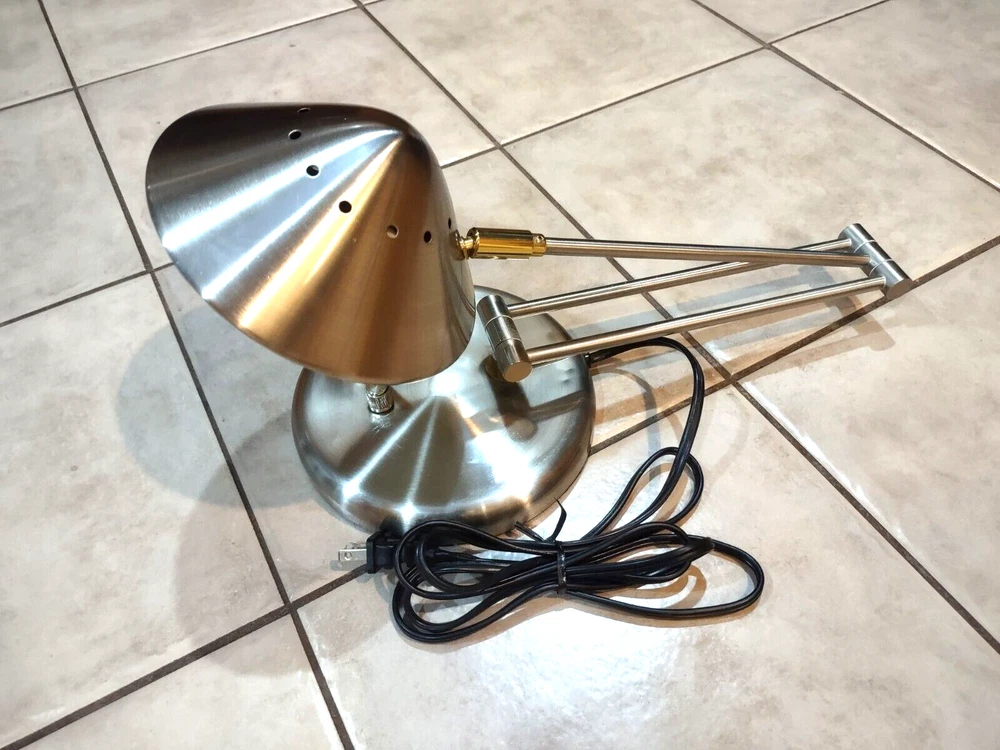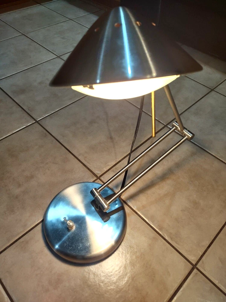 In great pre-owned working condition. Silver toned (brushed nickel) with gold accents. Some scratches on the top. See photos for details & message me with any questions. Manufactured in the 1990s Rotary dimmer switch on the base. Articulated arms. Each arm 12 inches long so total height can be up to 24 inches. Sturdy heavy base. Halogen lamp Lamp weight (before shipping) is 6.5 lbs.