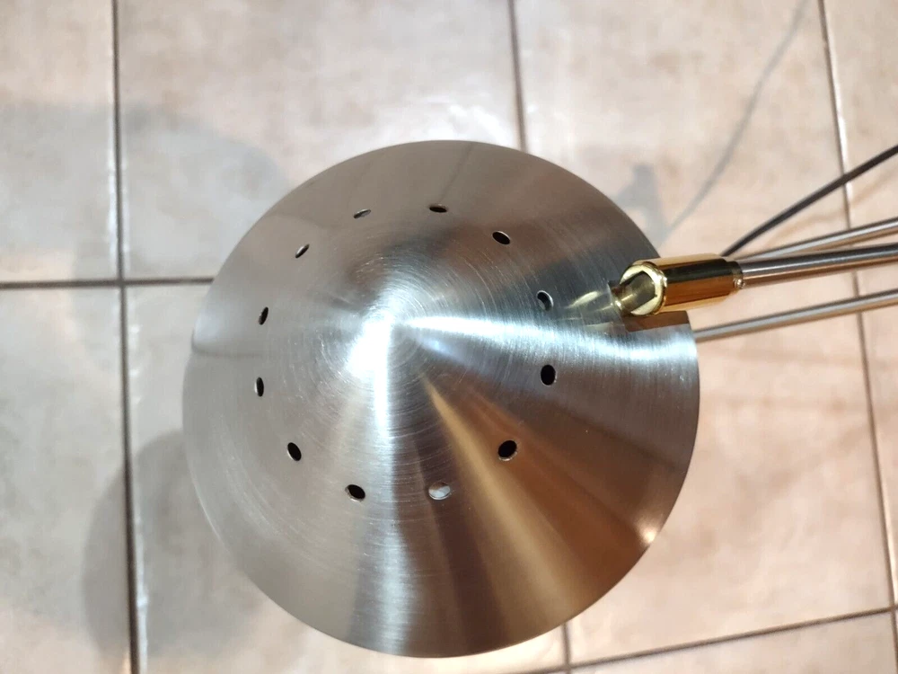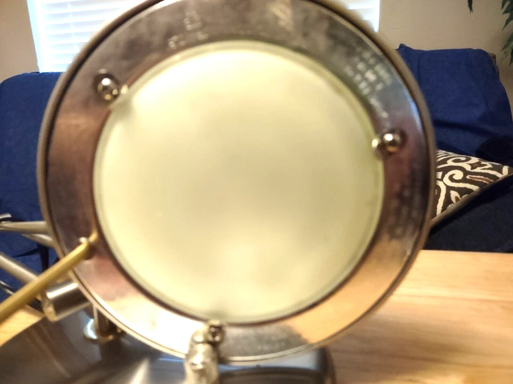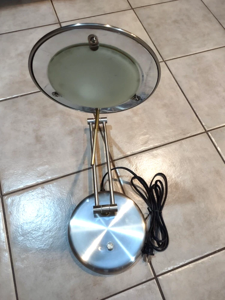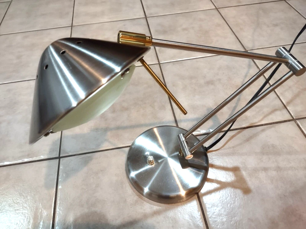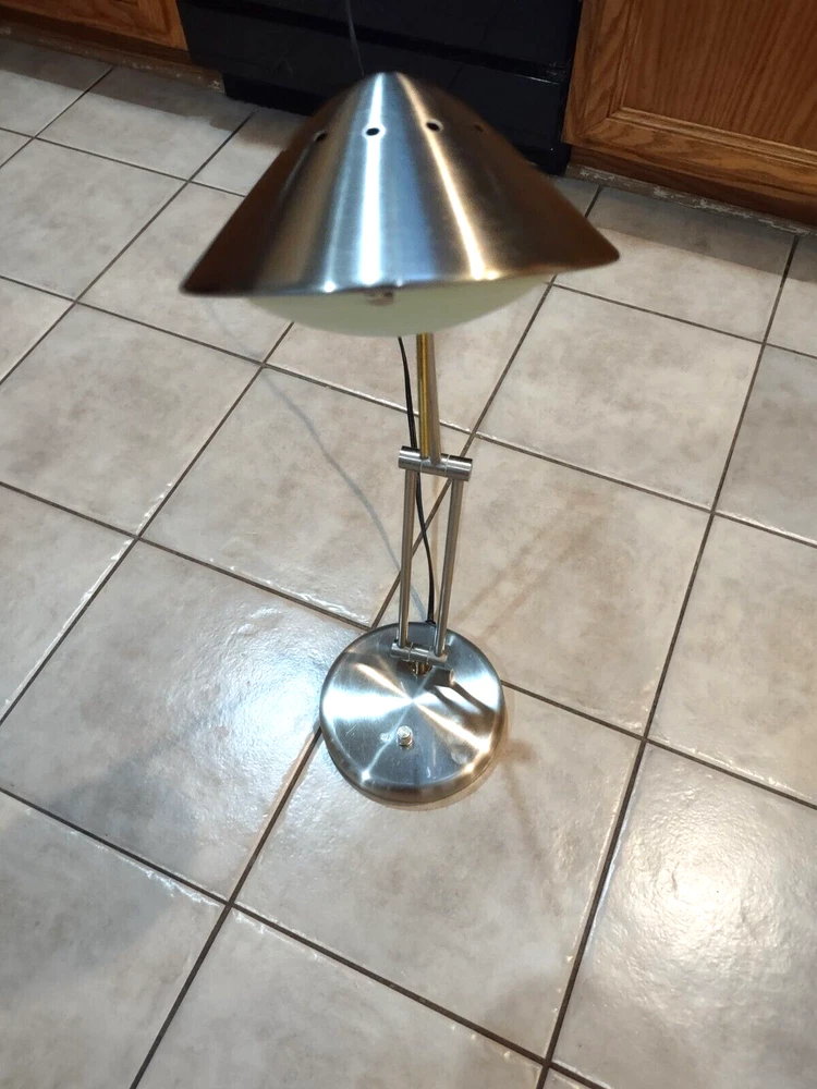 In great pre-owned working condition. Silver toned (brushed nickel) with gold accents. Some scratches on the top. See photos for details & message me with any questions. Manufactured in the 1990s Rotary dimmer switch on the base. Articulated arms. Each arm 12 inches long so total height can be up to 24 inches. Sturdy heavy base. Halogen lamp Lamp weight (before shipping) is 6.5 lbs.