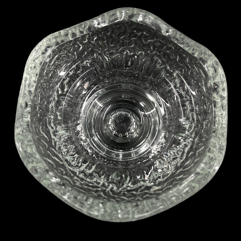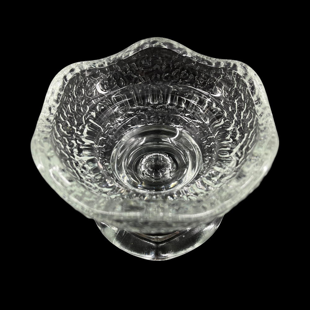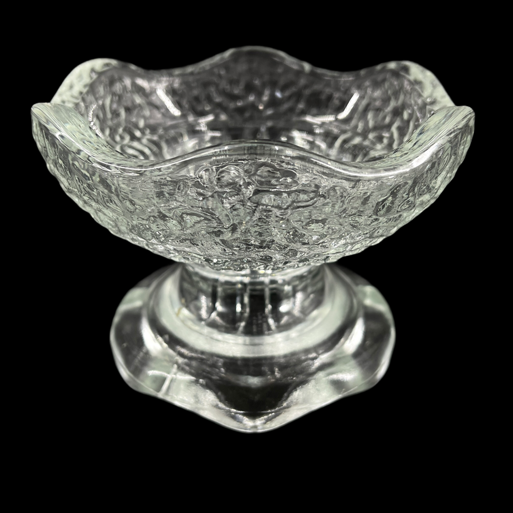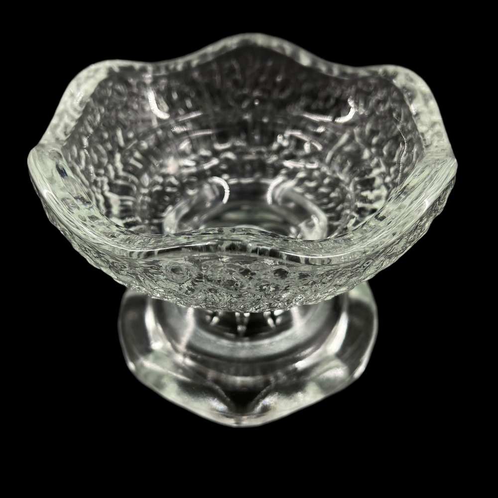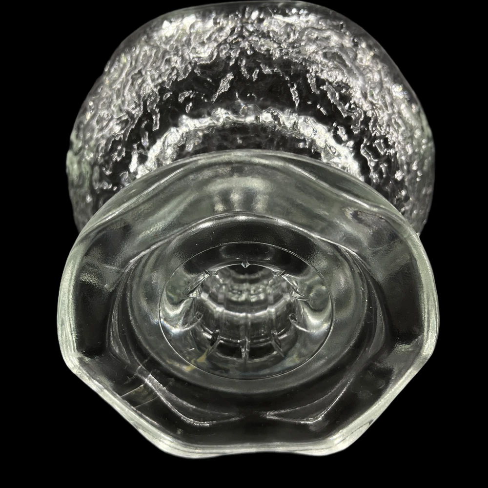 Vintage Textured Clear Glass Dual Taper & Votive Candle Holder Ruffled Rims Marked "USA" Smaller tapered candle side is 3" outside diameter and will accept 1" tapered candle. Larger votive candle side is 4" outside diameter.