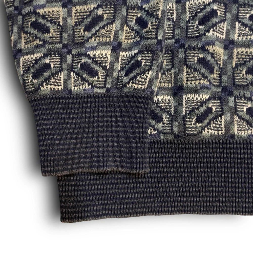 VTG 90s ABSTRACT PRINT PULLOVER SWEATER 🧶 100% cotton | usa made 🇺🇸 Vintage 90s textured knit blue cream sweater multi color pullover sweatshirt featuring long ribbed knit sleeve cuffs, crew neckline & hem with sick allover graphic abstract geometric art to wear print in size xl. Classic retro cozy boxy relaxed fit. It’s giving coogi style vibes. Great pre owned vintage condition. Laid flat: chest 24” length 27” sleeves 23.5” #90s cool fashion #dadcore #grandpa #geometric #boxy