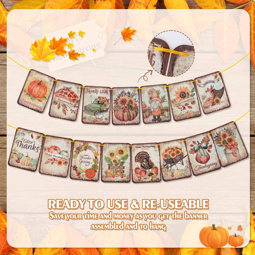 You will receive: 1×Vintage Thanksgiving banner (15pcs cardboard ) 1×rope Specifications: Color: as shown in the picture Size: Each cardboard measures 13.3×17.7cm/5.3*7 inches Material: High quality cardboard High-quality and Durable: Our Vintage Thanksgiving banner are made of high-quality thick cardboard, they are durable and not easy to deform and tear, and can be reused for a long time! These paper cards have very smooth surfaces, bright colors and clear patterns. Perfect Size : Each paper card of Vintage Thanksgiving banner measures 5.3*7 inch, Bunting Banner are punched with holes, can be hang on wall, doorway, mantel, window, outdoor tree branch and anywhere to add party atmosphere Easy to Hang: This Fall Harvest Thanksgiving Banner have punched with holes and comes with long rope, You can adjust the distance of each piece of paper to achieve your satisfactory results! Light weight, convenient to carry, perfect for outdoor indoor Harvest Thanksgiving events celebrate! JUST FOR LOVE- Thanksgiving day is coming. It's time to throw a party for your Family. Use the Vintage Thanksgiving banner as the party decor or cute photo backdrop. It's a perfect way to show your love and gratitude Suitable for Thanksgiving Occasion Decoration: The Thanksgiving Vintage banner is the perfect choice for your Harvest Thanksgiving party, can be used as photo backdrops, wall decor, cake table banner, celebration, photo studio photography, photo prop and so on.