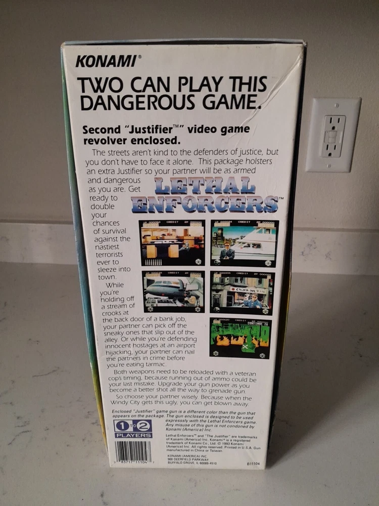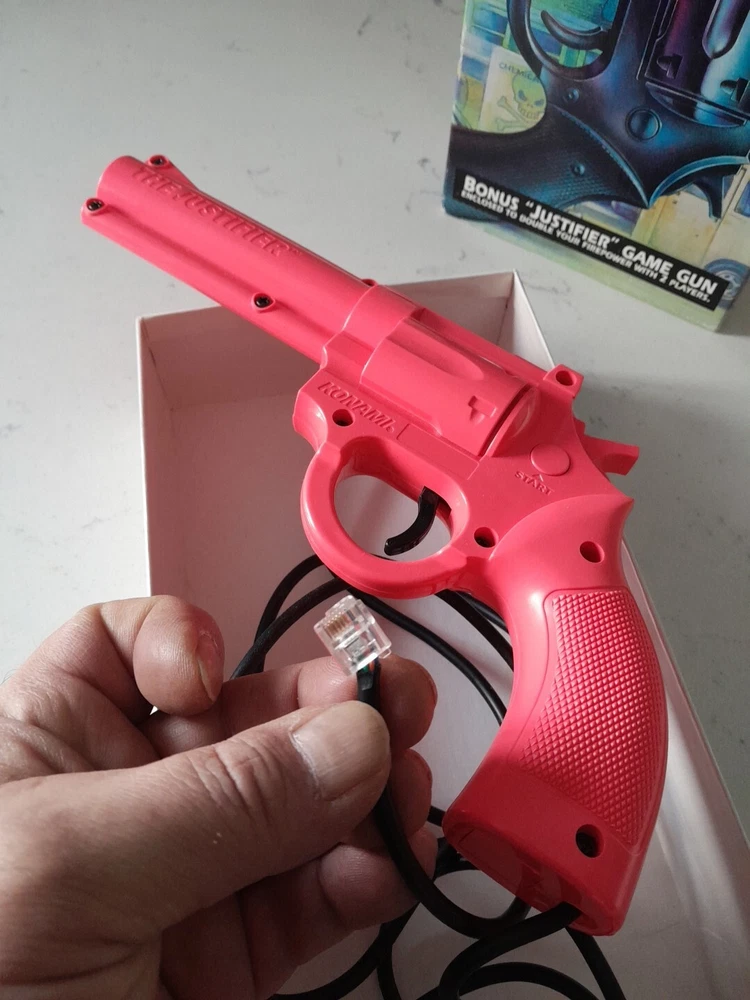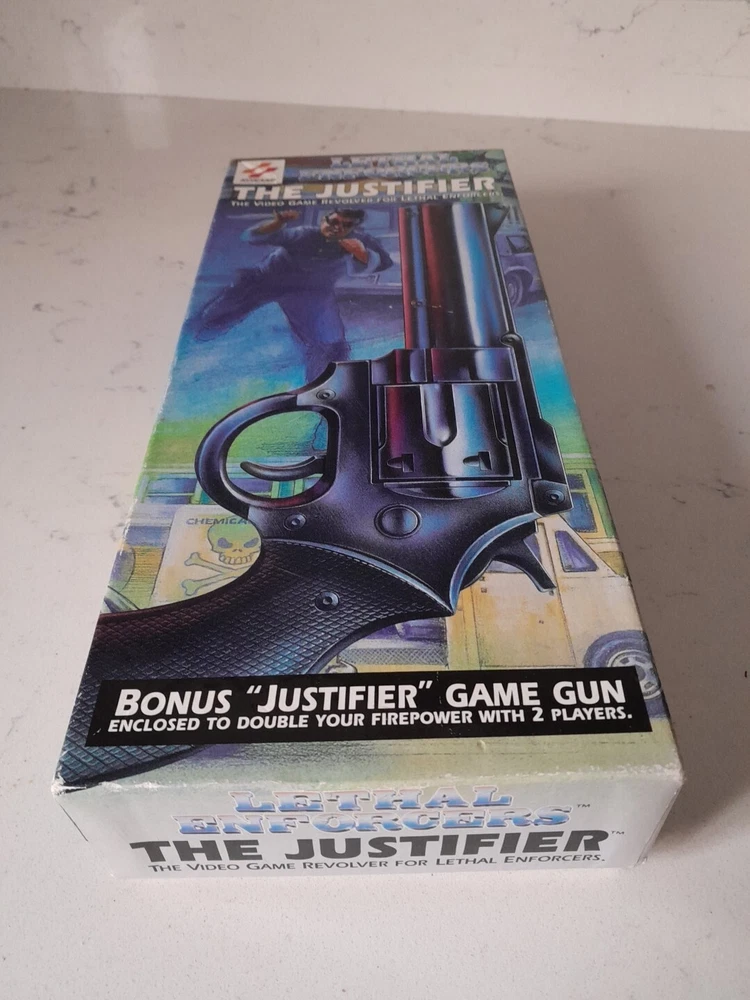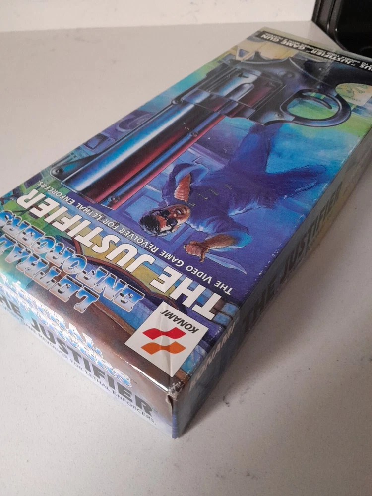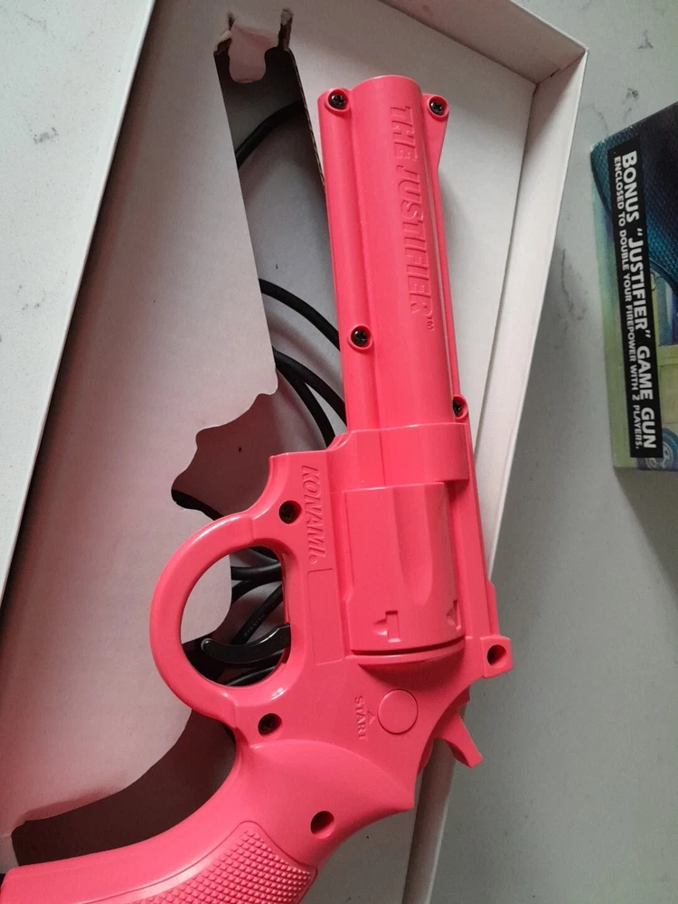 The Vintage Justifier Lethal Enforcers Sega Gun is a pink gun controller by Konami for the Sega Genesis platform. It is designed for use as the second player controller. This item is compatible with consoles, games, and accessories. It comes in its original box (CIB) and has been tested for functionality.