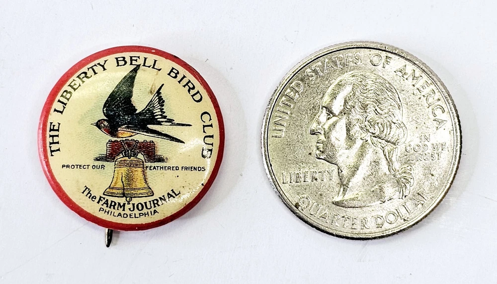 Please review pictures before purchasing to better understand the condition of the item. This is a vintage Liberty Bell Bird Club The Farm Journal Philadelphia, Pennsylvania pinback or button. The piece says, "Protect Our Feathered Friends" on it. The button was made by AJ Keil Co, in the Betz Building. The pin measures 7/8 of an inch in diameter. The pin is in great condition. Perfect for display or as a unique addition to your accessories, this pin is a true gem.