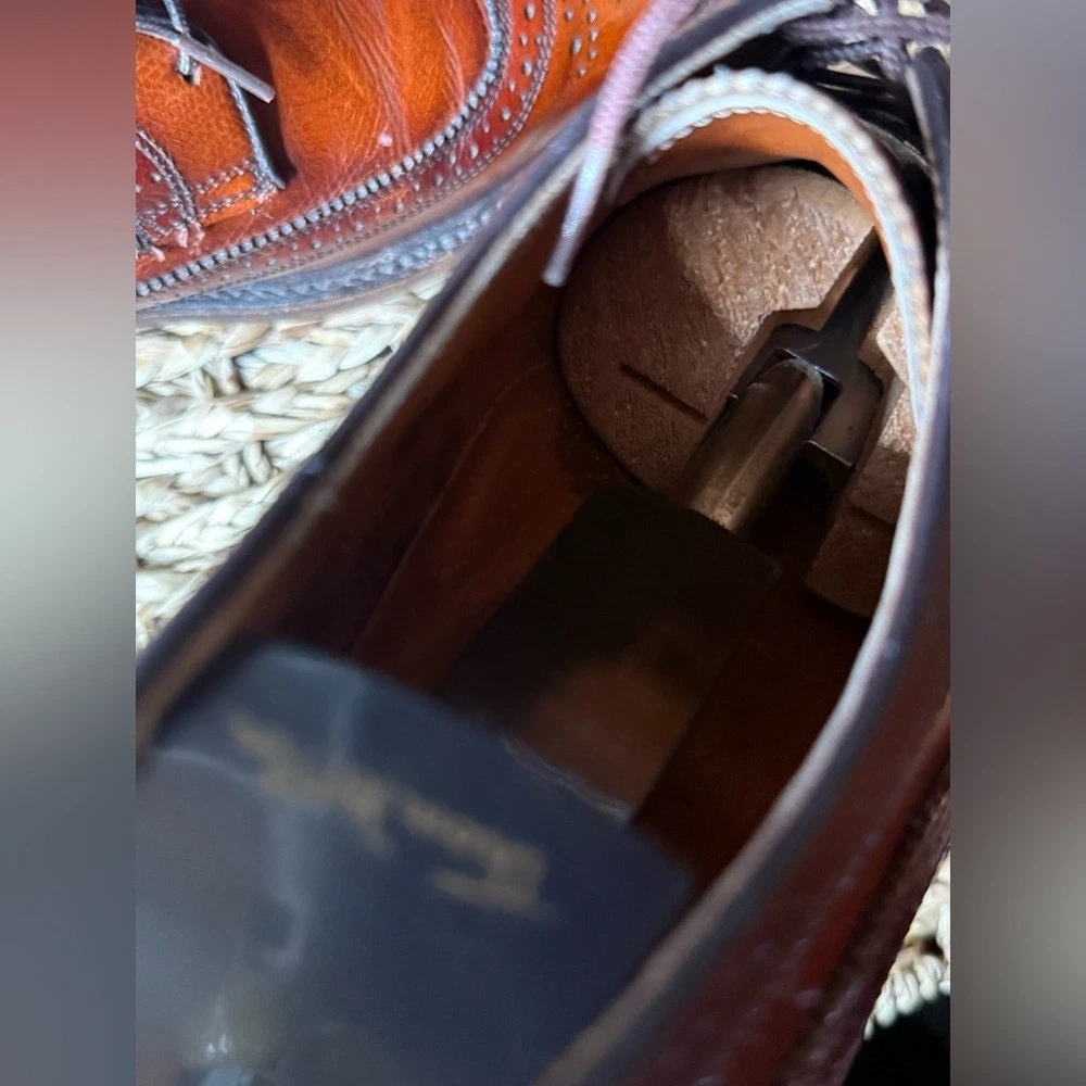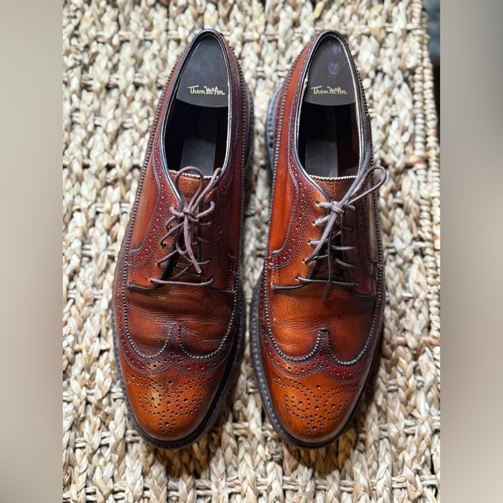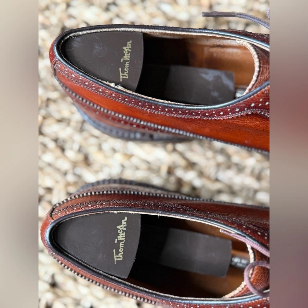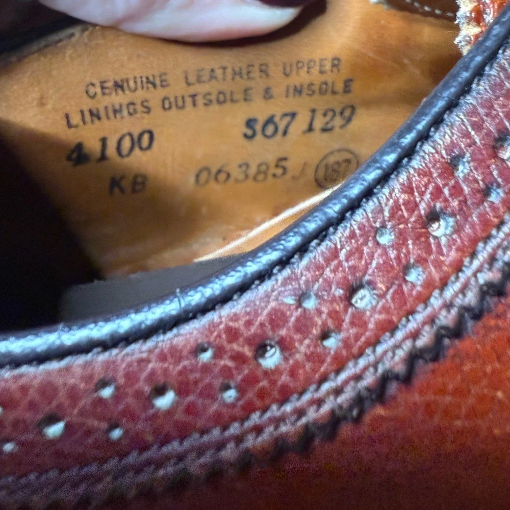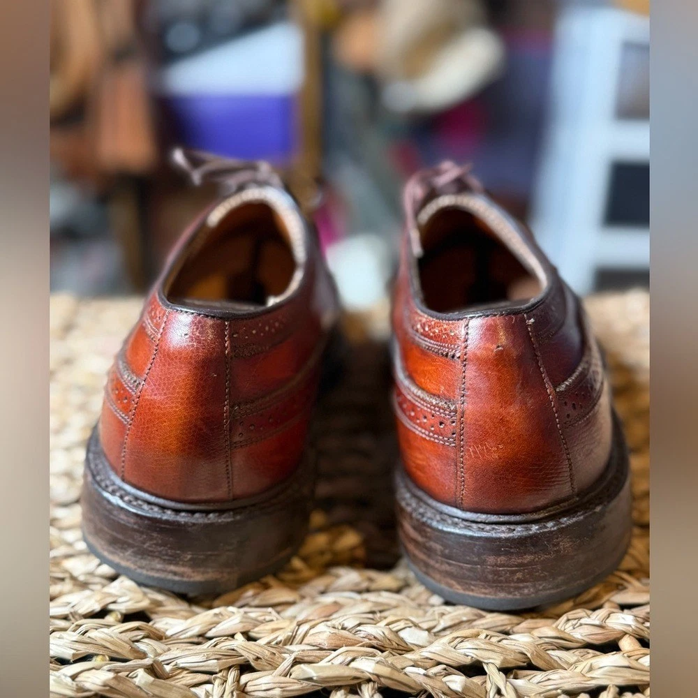 Beautiful vintage Thom McAn full brogue oxfords crafted in rich brown leather with classic wingtip and perforated detailing. These heritage-quality shoes feature genuine leather uppers, leather lining, and traditional leather outsoles with rubber heel caps. The patina shows natural aging and character while maintaining structural integrity—an excellent pair for anyone who appreciates classic menswear craftsmanship. A versatile style that pairs effortlessly with denim, chinos, or tailored trousers for a timeless smart-casual look. Size: Men's 8.5 Model Numbers Inside: 4100 / S67129 Color: Brown Material: Genuine leather upper, leather lining, leather outsole Condition: Good vintage condition. Light creasing and wear consistent with age. Soles show normal wear with plenty of life remaining. No major flaws. Style Details: • Full brogue wingtip Oxford • Genuine leather construction • Lace-up closure • Stacked heel with rubber cap • Classic heritage menswear profile 5-Star Rated Seller | Fast Shipping quiet luxury, heritage menswear, classic oxford, timeless style, vintage leather, old money aesthetic, smart casual Model image was created with AI.