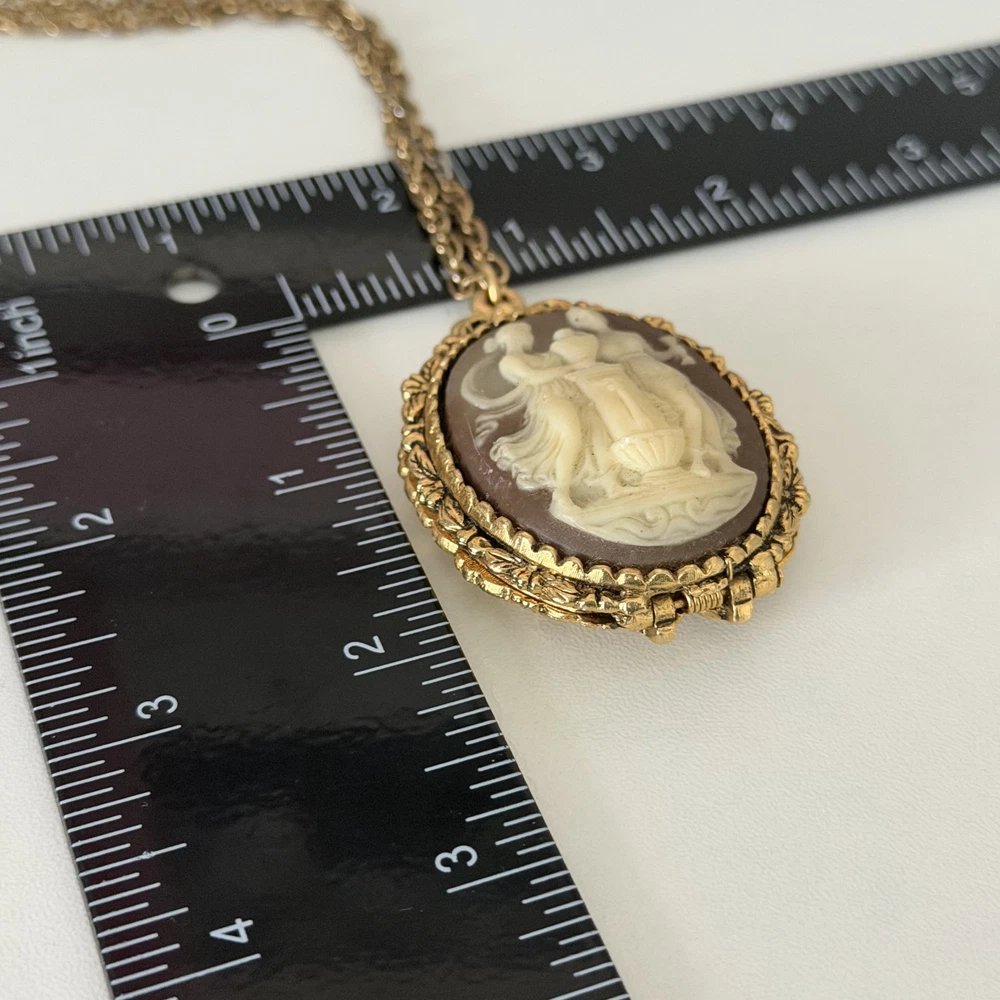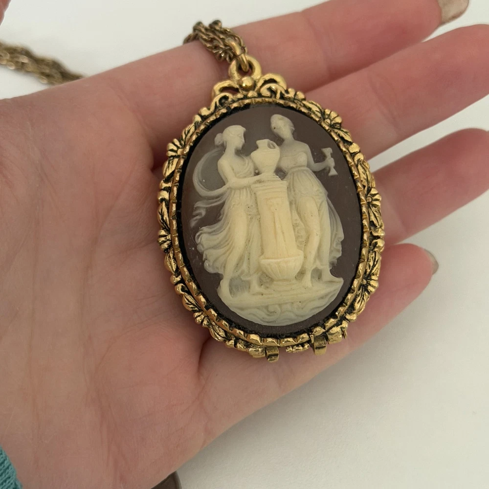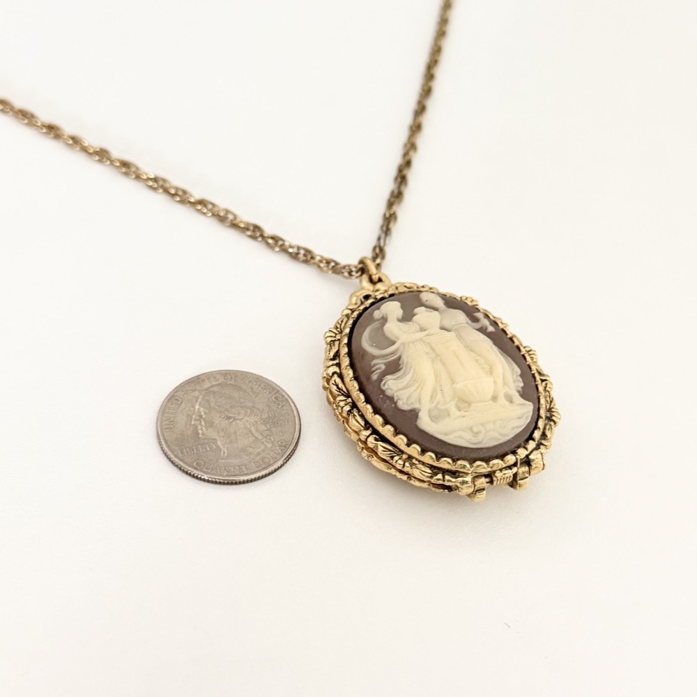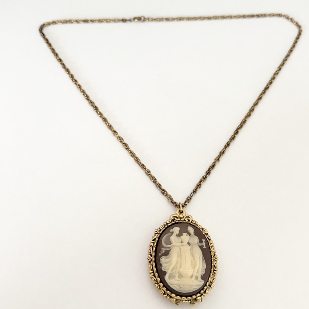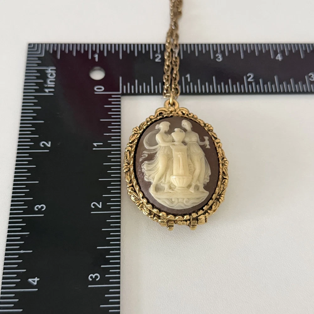 Lovely Vintage Three Graces Cameo Resin Carved Perfume Sachet Locket Gold Tone Necklace Chain length: 24" Pendant length: 2.25" Good vintage condition. - Fast shipping, I ship the same or next business day! I also combine shipping. - Thank you so much for shopping with me and please check out my other jewelry listings, I post new pieces daily!