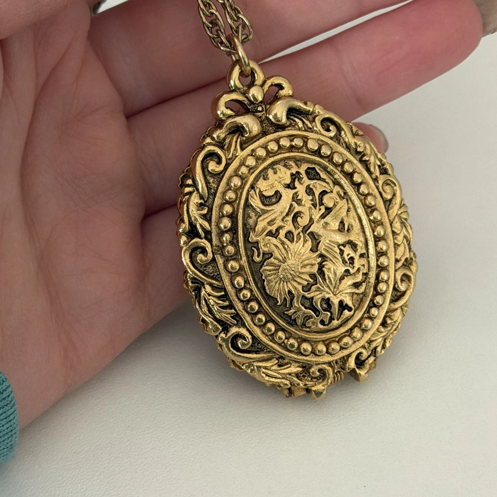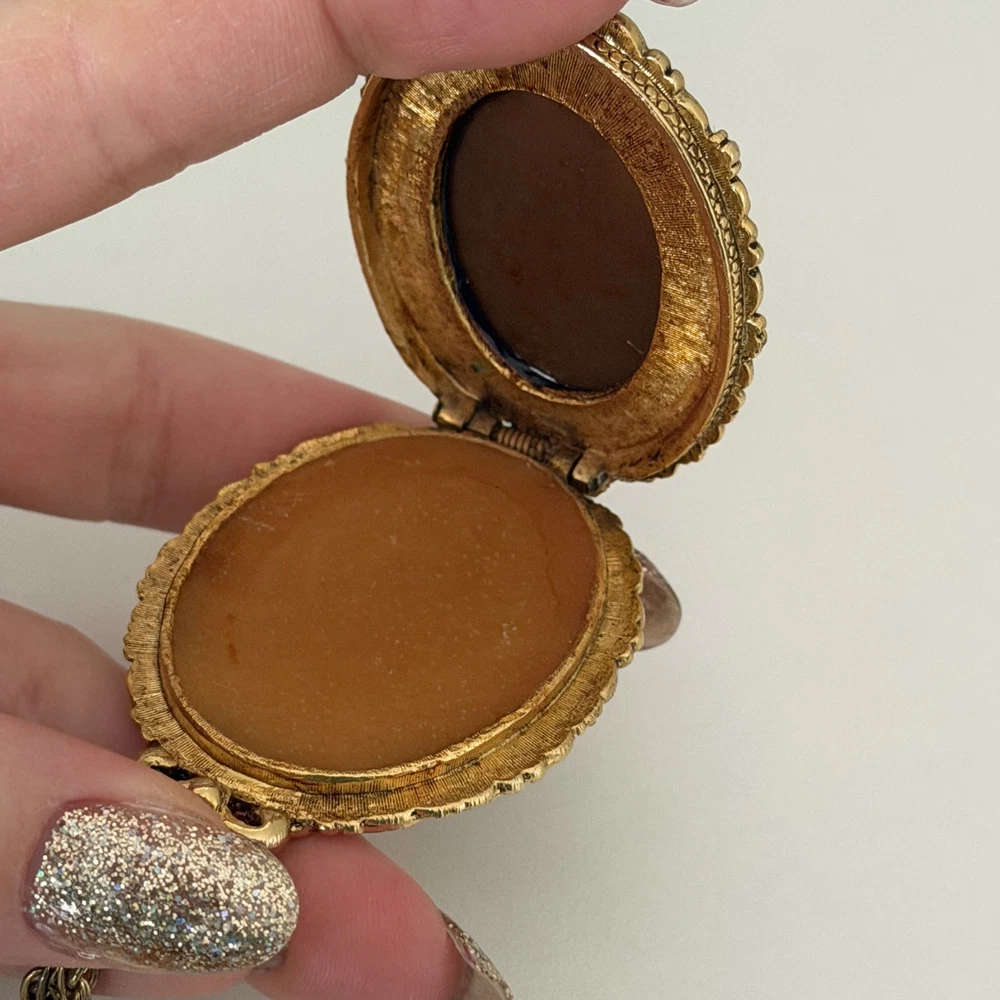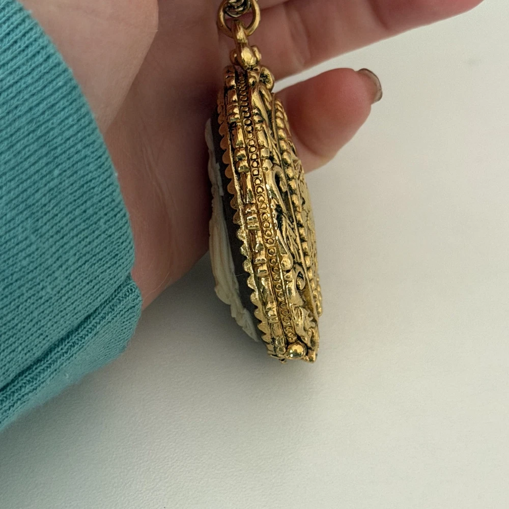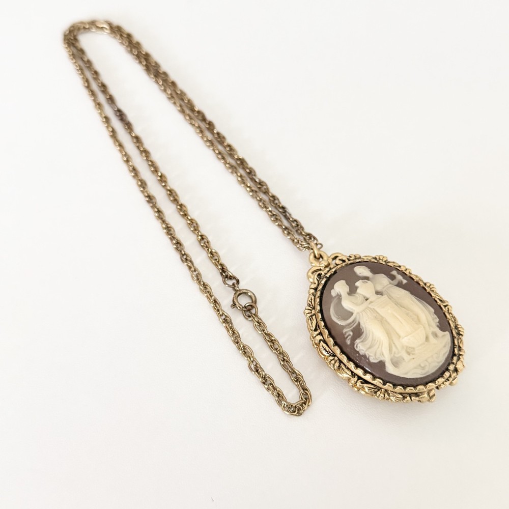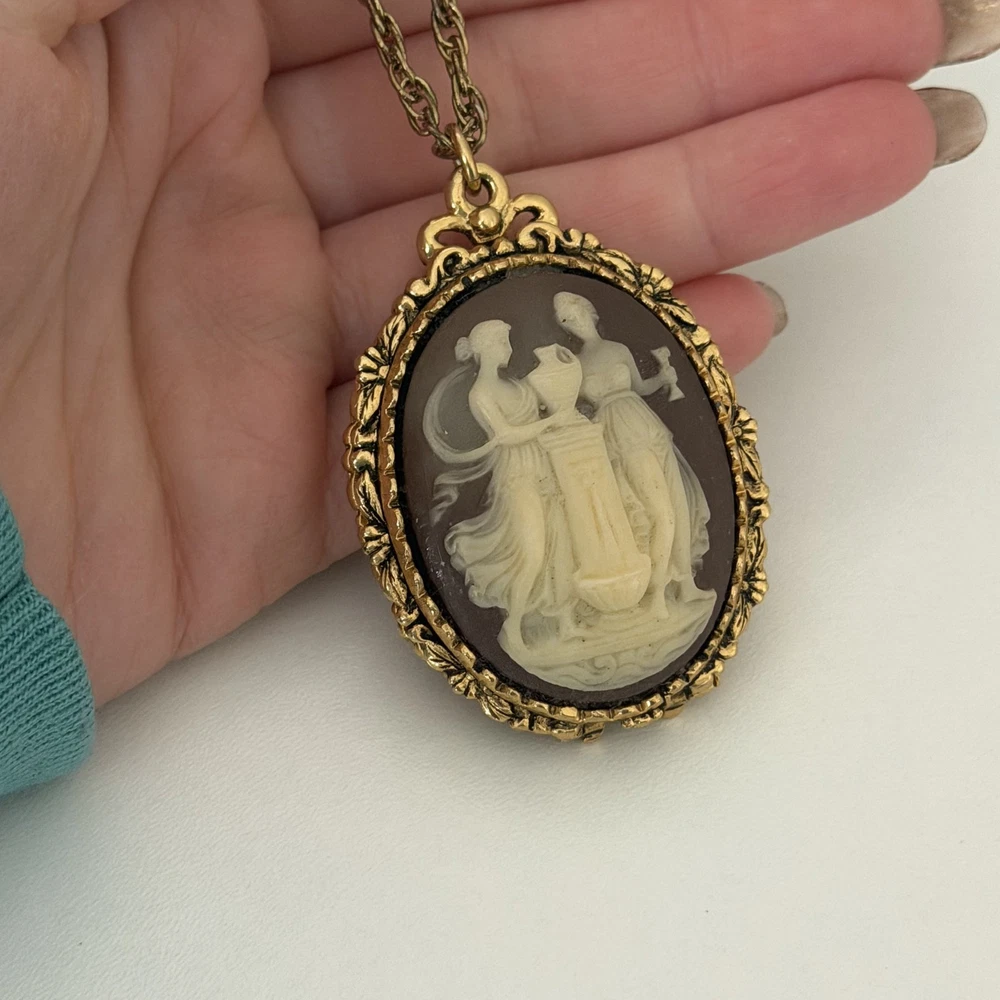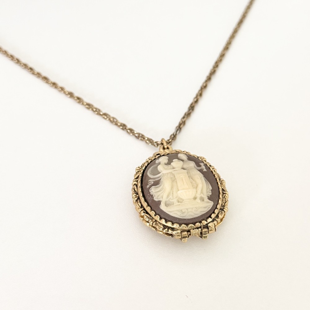 Lovely Vintage Three Graces Cameo Resin Carved Perfume Sachet Locket Gold Tone Necklace Chain length: 24" Pendant length: 2.25" Good vintage condition. - Fast shipping, I ship the same or next business day! I also combine shipping. - Thank you so much for shopping with me and please check out my other jewelry listings, I post new pieces daily!