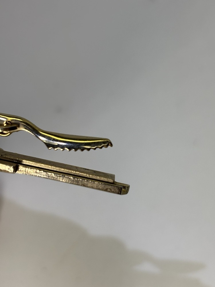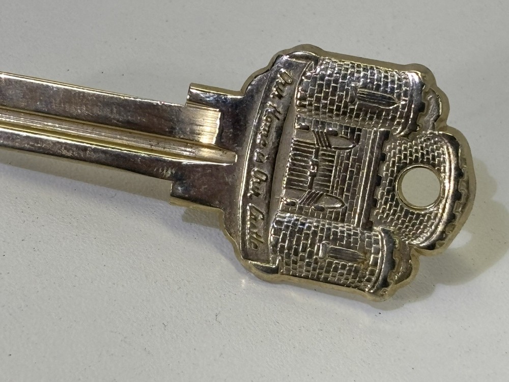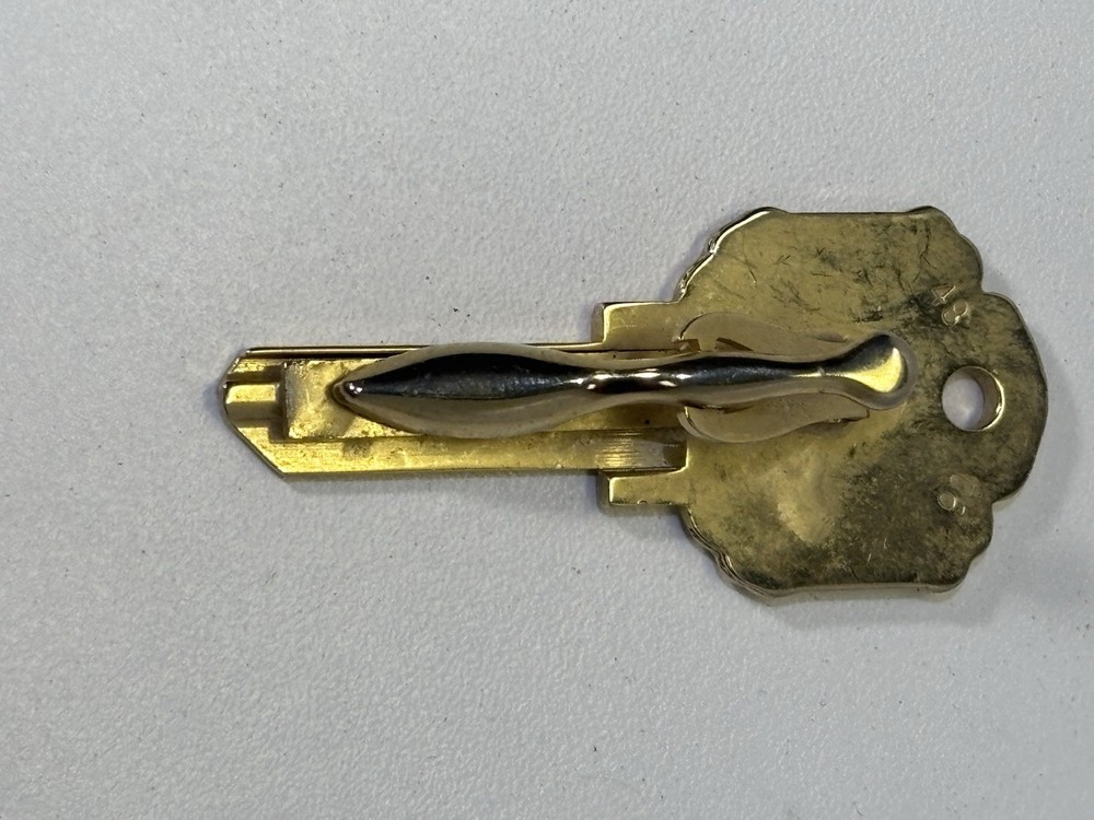 This vintage tie bar clip clasp features a unique design with a key motif, symbolizing the phrase "Our Home Is Our Castle". The gold tone color and 2.5" size make it a stylish accessory for men's ties, perfect for special occasions like anniversaries. Made with quality materials, this tie bar clip adds a touch of elegance and charm to any outfit.
