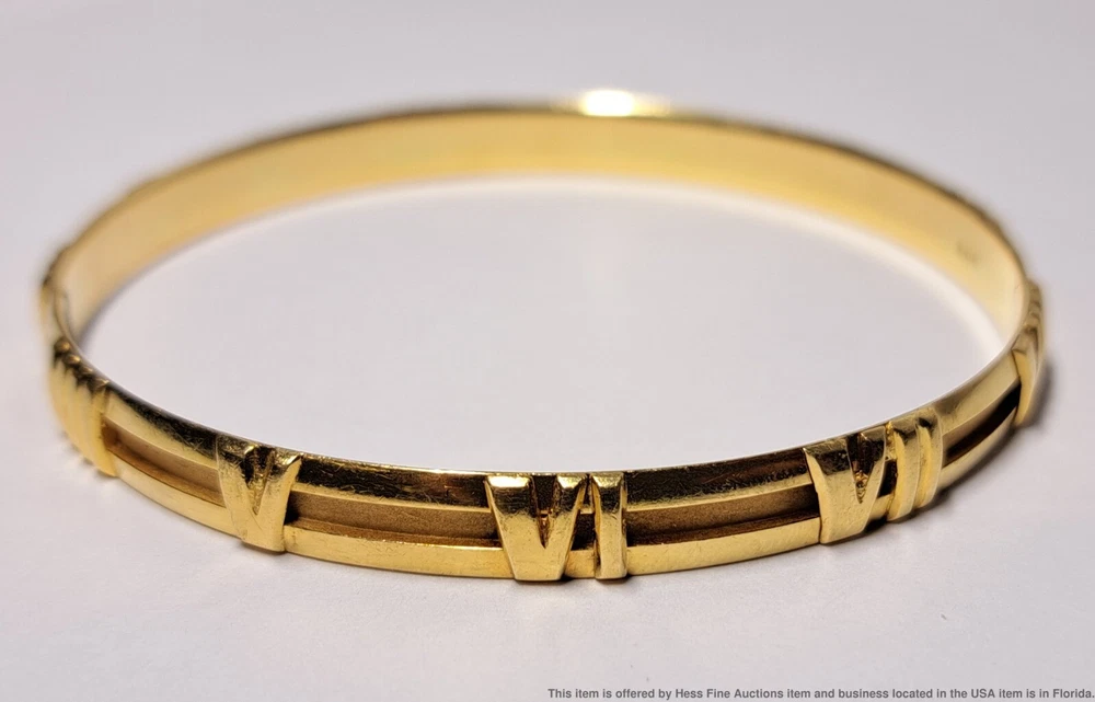 Vintage Tiffany & Co Atlas 18K Gold Roman Numeral Bangle Bracelet Signed 1995 Vintage Tiffany & Co Atlas 18K Gold Roman Numeral Bangle Bracelet Signed 1995 Click images to enlarge Description Described & Photographed By: Dillon 61241 NFTME Title: Vintage Tiffany & Co Atlas 18K Gold Roman Numeral Bangle Bracelet Signed 1995 Description: Vintage Tiffany & Co Atlas 18K Gold Roman Numeral Bangle Bracelet Signed 1995 Here are the specifications: Type of Jewelry: Bracelet Mounting metal: 18K Yellow Gold Approx. Size or length: 7-3/4 in circumference; 2-5/8 opening; 1/4 in or 6.5mm width Condition: Preowned with light use overall. Could use a polish. See photos for details. Appears ready to wear! Stamping or Factory Markings: Tiffany & Co 1995 750 Total weight of piece: 22.1 grams Estimated size of package: 7.5 x 5.5 x 3.5 Estimated weight of package: 8 oz Condition: Pre-owned Condition Notes: Described & Photographed By: Dillon 61241 NFTME Title: Vintage Tiffany & Co Atlas 18K Gold Roman Numeral Bangle Bracelet Signed 1995 Description: Vintage Tiffany & Co Atlas 18K Gold Roman Numeral Bangle Bracelet Signed 1995 Here are the specifications: Type of Jewelry: Bracelet Mounting metal: 18K Yellow Gold Approx. Size or length: 7-3/4 in circumference; 2-5/8 opening; 1/4 in or 6.5mm width Condition: Preowned with light use overall. Could use a polish. See photos for details. Appears ready to wear! Stamping or Factory Markings: Tiffany & Co 1995 750 Total weight of piece: 22.1 grams Estimated size of package: 7.5 x 5.5 x 3.5 Estimated weight of package: 8 oz Payment Paypal Shipping Shipping Options: Domestic shipping: Weight based Shipping Charges. Domestic Carriers are: Ups Second Day Air, Ups Next Day Air International shipping: Weight based Shipping Charges. International Carriers are: Ups Standard Canada, Ups Worldwide Expedited I will ship to: United States, Worldwide Weight: 8 oz. Shipping and Handling: Please check eBay's Shipping & Payment tab Customer Service Policy: Please note in bidding or buying this auction you are entering into a binding contract. In bidding or buying you are agreeing to all policies stated below and comply with Florida State laws. Sales Tax applies to all Florida sales unless you have a valid dealers license. Legal Shipping High value items require restricted delivery with only the addressee being able to sign for it. * Shipping is calculated by eBay and shown in the auction. Legal Jurisdiction. HessFineAuctions is a division of Hess Fine Art, and is registered in Pinellas County, FL, USA. It is agreed that all parties will abide by the laws of the State of Florida in all matters relating to this agreement. And that in the case of any dispute, the legal jurisdiction of resolution shall be Pinellas County, Florida. The buyer acknowledges that any items not returned within 30 days of receipt of the refund will be deemed appropriated by the buyer and buyer also acknowledges their intent to deprive from seller, either temporarily or permanently, the right to the property or the benefit from the property. Resale certificates must match buyer name or company and address * The auctions contain only what is described. Do not assume something comes with a used item if it is not stated in the auction verbiage. Many items will be marked with serial numbers or identifying numbers items may not be accepted for return if these numbers are not present. * Photographs often disclose condition far better than verbiage as many people have different ideas on what terms may mean. * If an identifying mark, inclusion or defect is visible in the images it is considered DISCLOSED to the buyer. * Gold items have been tested with a Kee gold tester M-509GM and tested as stated in the auction. * All Items are shipped insured. If an item has arrived damaged we will require images and a damage affidavit. CUSTOMS AND INTERNATIONAL BIDDER POLICIES International bidders - you are agreeing to the following when you place a bid with us: * If your total purchase including shipping exceeds $200.00 US and you pay with a credit card then your only delivery option is UPS signature delivery. This is because credit cards require both a signature and tracking. * If you pay with PayPal and the total price including shipping is less than $750.00 US then we can ship USPS to most countries. Please contact us with eBay’s message system before you pay for an amended invoice. * The following applies if you are shipping to or from these countries. CANADA, Australia, Belgium, Brazil, Croatia, Denmark, France Germany, Great Britain and Northern Ireland, Israel, Netherlands New Zealand Spain and Switzerland, Estonia, Finland, Gibraltar, Hungary, Italy, Latvia, Lithuania, Luxembourg, Malaysia, Malta, Portugal, and Singapore. We will be able to offer you USPS International shipping if you are paying with PayPal and the item and shipping are less than $750.00 US. We may be able to ship 1st Class USPS International if you are shipping to or from the countries listed above. * If you wish your item sent to a colleague with a US address we are of course willing to do so but the address must be verified with PayPal Credit card company and in the eBay invoice. * We declare all items for the winning bid amount. * It is common for countries to charge some form of customs duties, taxes, VAT, or brokerage fees on items being shipped from the USA. These costs, along with country-specific importing rules and delays caused by customs, are the buyer’s responsibility. * We do not falsify customs documents to assist you in evading your lawful taxes. Hess Fine Auctions Hess Fine Auctions can be reached during working hours of 9 to 5 PM EST. Legal Shipping Vendio Images: More than just a pretty image. 250+ Mobile Responsive & Active Content Free Listing Templates with Vendio Sales Manager. Vendio provides powerful selling automation for sellers of all sizes. Get business information that counts! - Vendio Counters are active content free.
