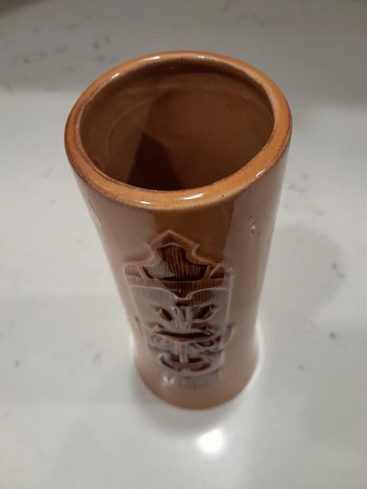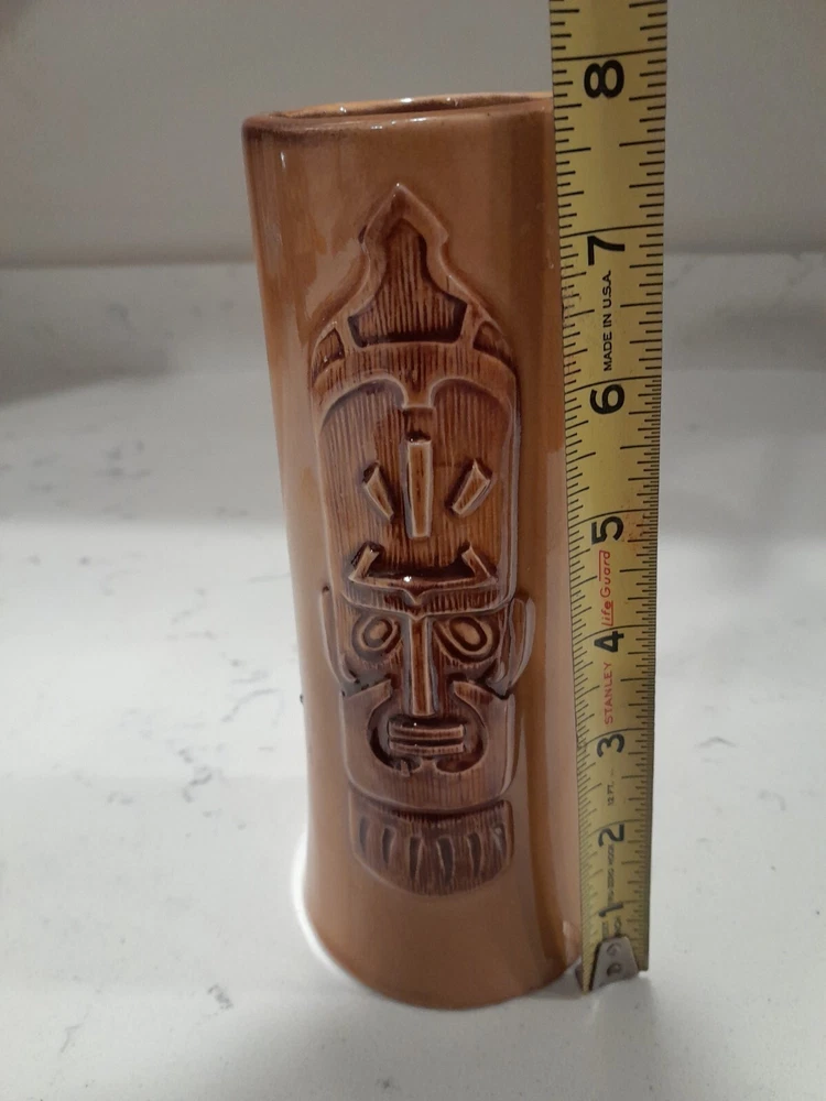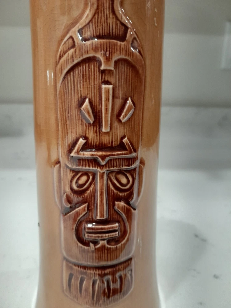 This vintage Tiki mask mug cup by Otagiri features a Fogcutter Kon-Tiki design in a mustard brown color. The mug is a unique piece that reflects Hawaiian culture and is a collectible item that would be a great addition to any Tiki or Hawaiian-themed collection. The ownership history of this item is not available, adding to its mysterious charm and appeal. Gorgeous Condition. Small crazing.