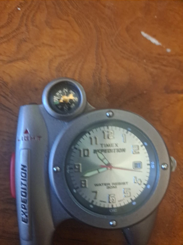Water Resistance: 30 m (3 ATM) Department: Men Personalize: No Case Material: Silver Case Color: Silver Seller Warranty: No With Papers: No Movement: Quartz Customized: No Model: Timex Expedition Style: Sport Country/Region of Manufacture: Japan Indices: Numbers Pocket Watch Size: 20 With Manual/Booklet: No Year Manufactured: 2000-2009 Type: Analog Watch Display: Analog Brand: Timex Vintage: Yes Features: 12-Hour Dial, Date Indicator, Easy to Read/Large Numerals, Luminous Hands, Luminous Indexes, Multi-Dial, Seconds Hand, Timer, Flashlight, Compass, Beltloop Clip With Original Box/Packaging: No Theme: Outdoor Adventures