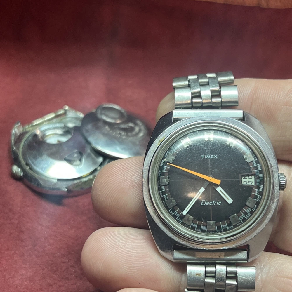 Vintage Timex divers watch Black Dial / Orange Seconds Hand -for Restoration! Missing bezel and looks like movement has missing parts! I’m including a second Timex electric and possibly you can exchange movements? I’m not sure if the second Timex movement works or not! But it looks complete! See pics!! Both for parts repair!! As is as seen as pictured… Please read below: Please review item specifics, and pictures for best details!! Please ask questions and good luck bidding! If any issue with purchase or arrival condition such as not as described, please reach out to me before posting feedback and or opening a case and I will make it right!! My wish is for you to have a happy buying experience and to enjoy my items!! Please note about vintage items. Unless marked new or new old stock, they are sold in used, as-is, pre-owned condition. Because of the age of these items they may have some wear, imperfections and signs of use, age and time… "International buyers " please note: Import duties, taxes, and charges aren't included in the item price or postage cost. These charges are the buyer's responsibility. “Please check with your country's customs office to determine what these additional costs will be, prior to bidding or buying." Shipping international via the eBay international Shipping method! ** Due to the nature of used/vintage watches, I do not guarantee long term functionality and accuracy... for best performance always have older watches serviced!! ** In regard to water resistance and or waterproof: the water resistance rating, if any, is based on the manufacturer's marking, not an actual test by me. I do not recommend using any of my used watches in submerged water environment such as swimming or shower or ocean!