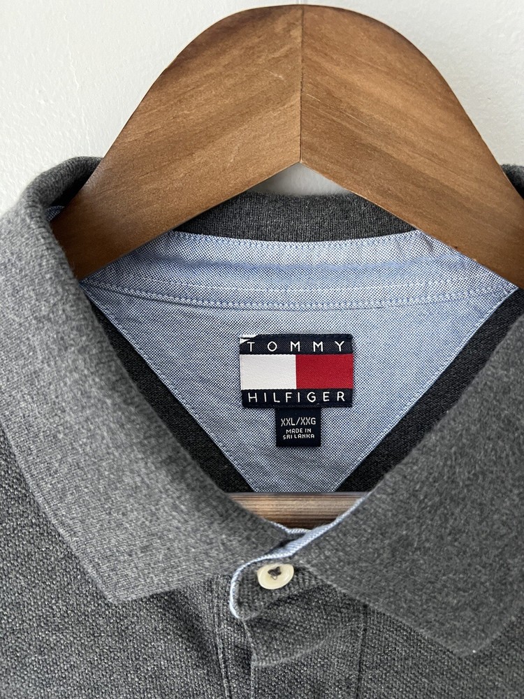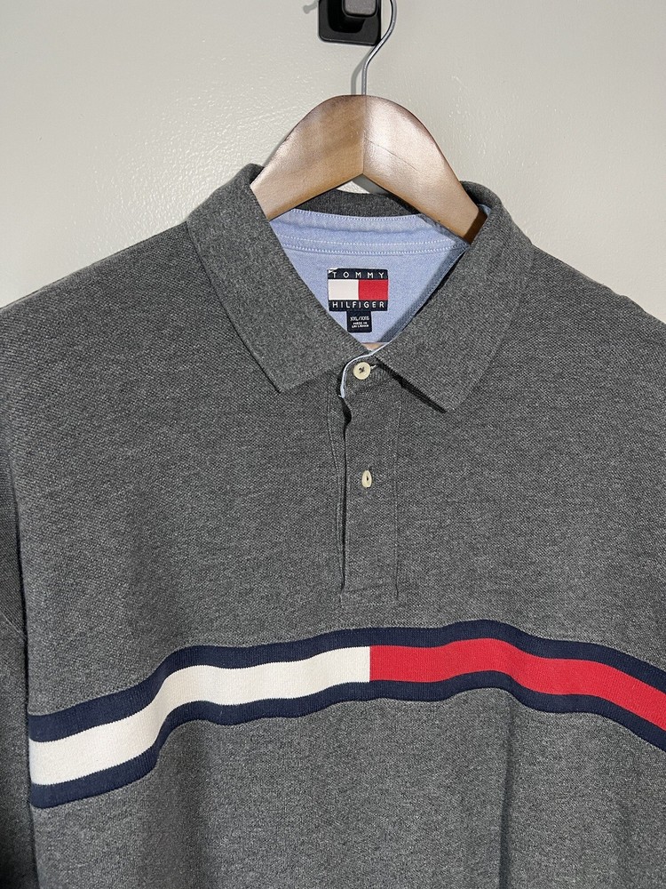 Elevate your wardrobe with this classic Tommy Hilfiger polo shirt in a versatile gray color. Made from high-quality cotton knit fabric, this shirt features a spread collar, button closure, and long sleeves. The shirt is accented with the iconic Tommy Hilfiger logo and is perfect for casual occasions. This vintage polo shirt is perfect for all seasons and can be easily cared for with machine washing. The shirt is a size XL and fits regular size types. The classic and preppy theme of the shirt makes it suitable for walking, golf, and rugby activities. Add this timeless piece to your collection today!