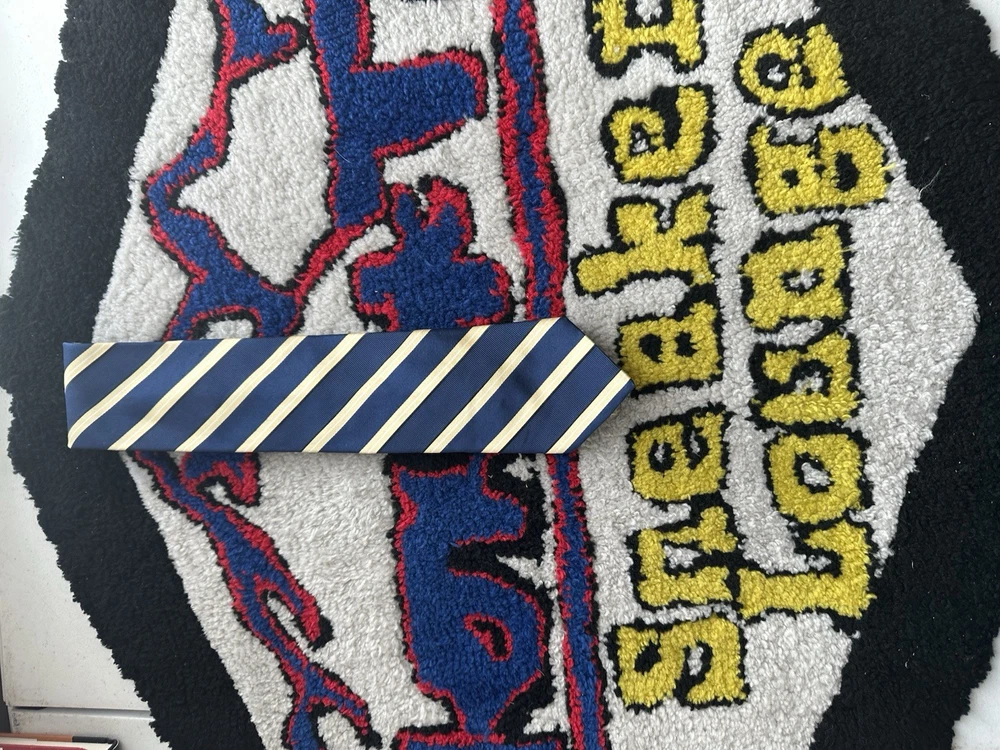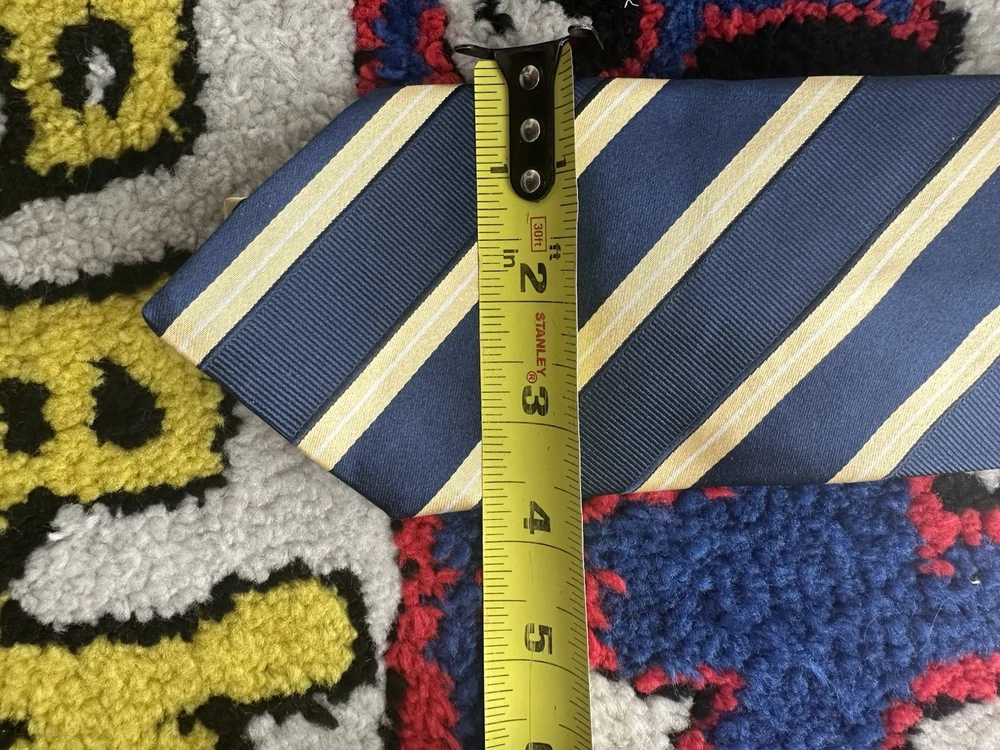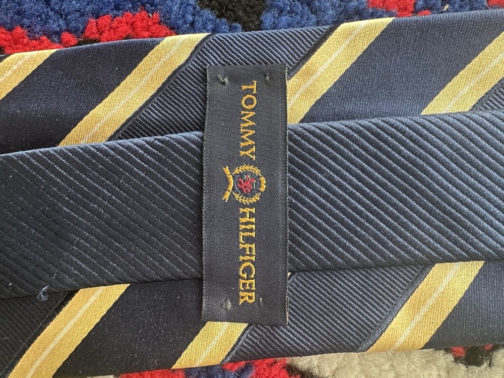This Vintage Tommy Hilfiger Men's Silk Classic Neck Tie is a stylish accessory made in the USA. It features a geometric yellow and blue pattern with the iconic Tommy Hilfiger logo accents. Crafted from 100% silk fabric, this wide tie has a pointed style and is adjustable for a comfortable fit around the neck. The classic length of 59 inches and 3.5-inch width at the tip make it a versatile piece that adds a touch of American heritage to any man's outfit.